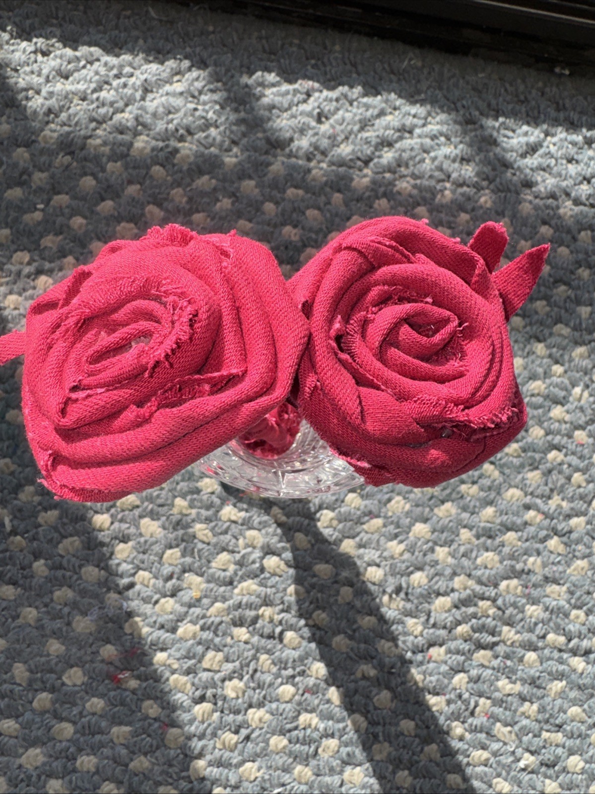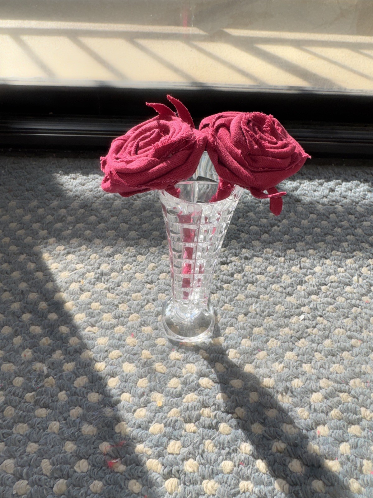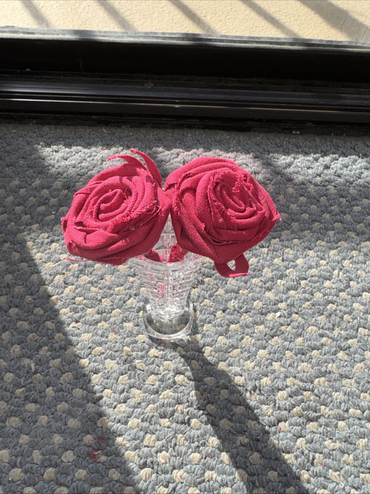 The product is a unique and stylish upcycled small vase filled with 2 beautiful handmade red roses, making it a perfect Valentine gift. The Forever Upcycled Denim Red Roses in Pretty Vase adds a touch of elegance and charm to any home décor. The flowers are a little bigger than 6” tall. The vase is a bit bigger.