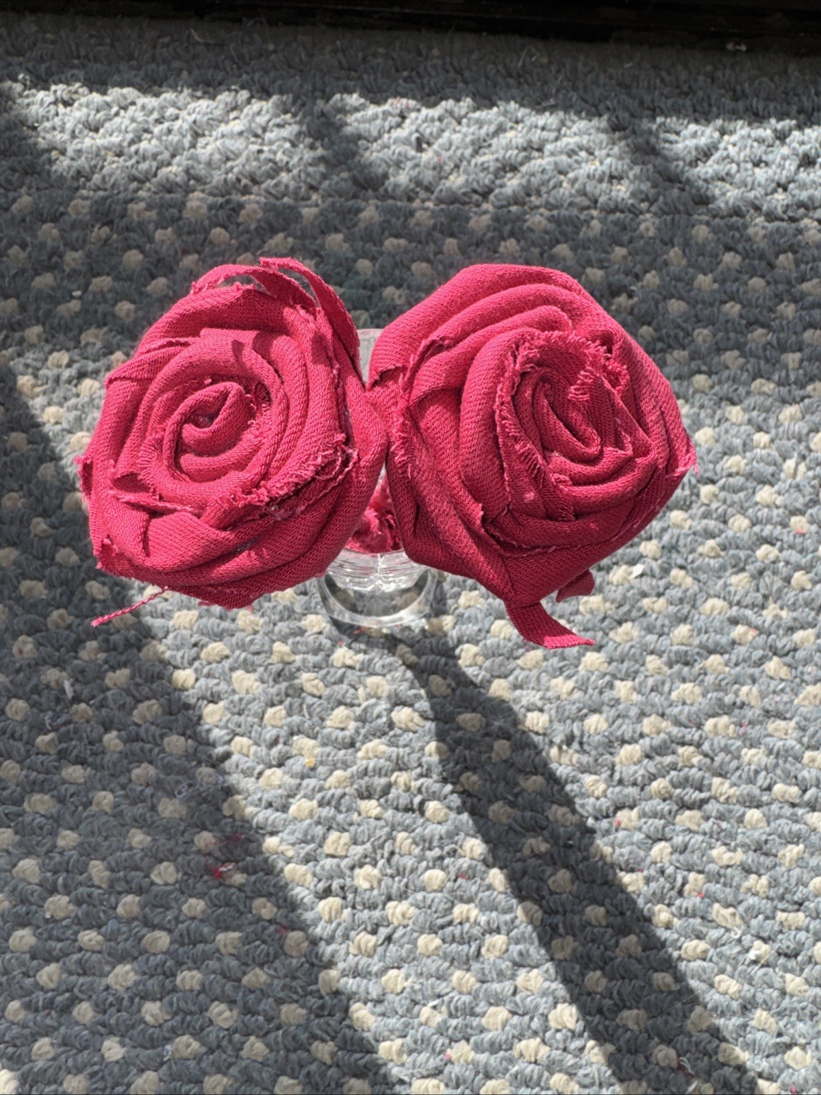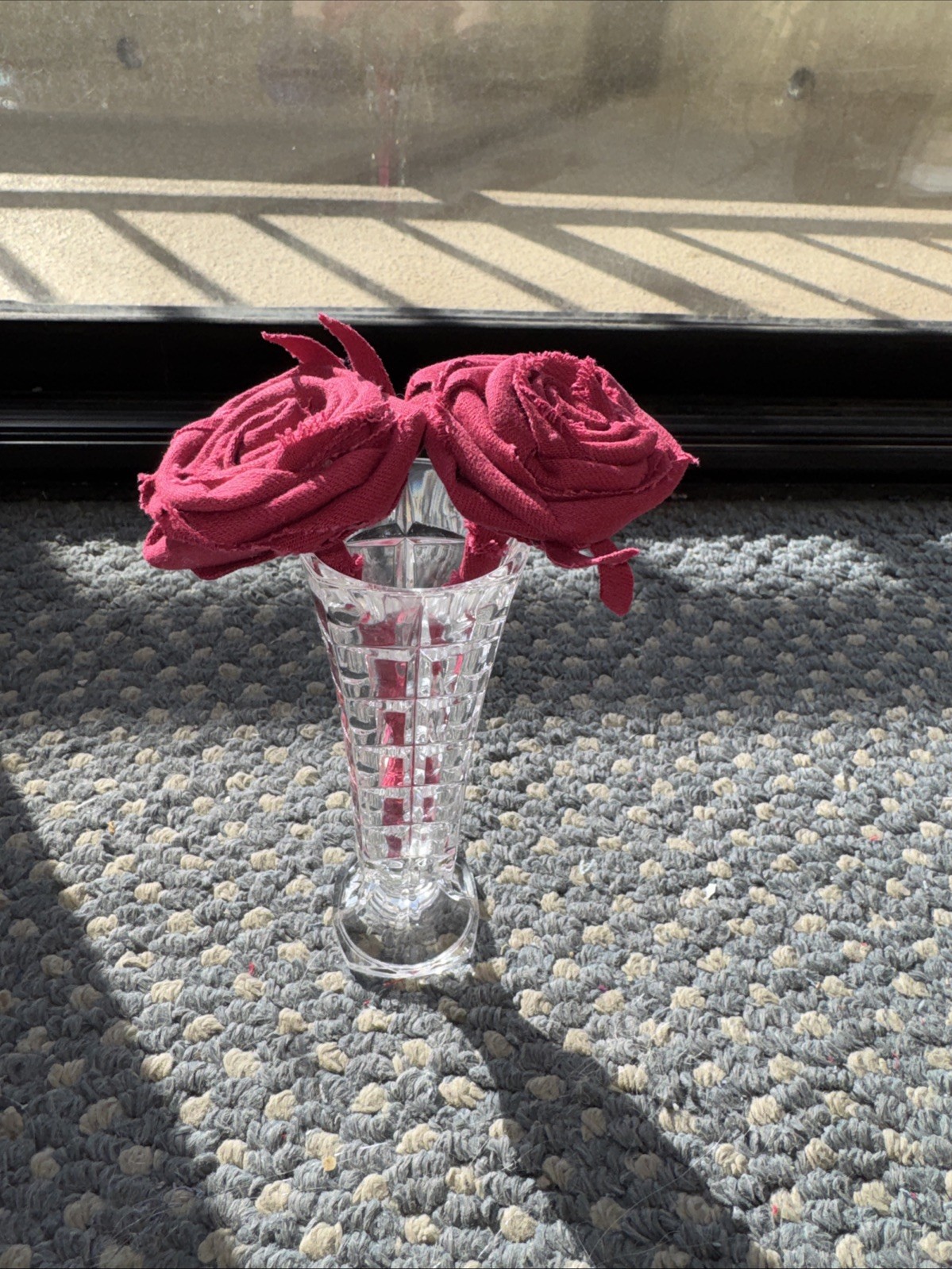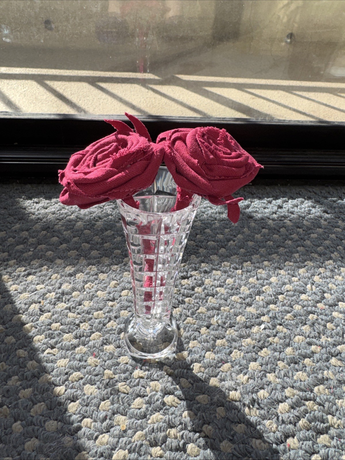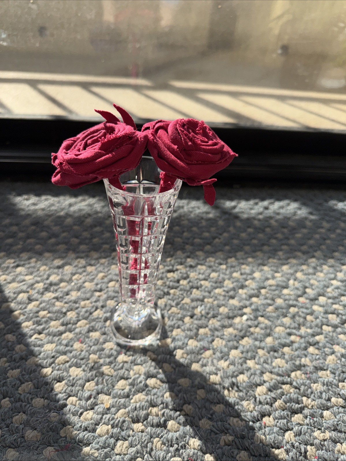 The product is a unique and stylish upcycled small vase filled with 2 beautiful handmade red roses, making it a perfect Valentine gift. The Forever Upcycled Denim Red Roses in Pretty Vase adds a touch of elegance and charm to any home décor. The flowers are a little bigger than 6” tall. The vase is a bit bigger.