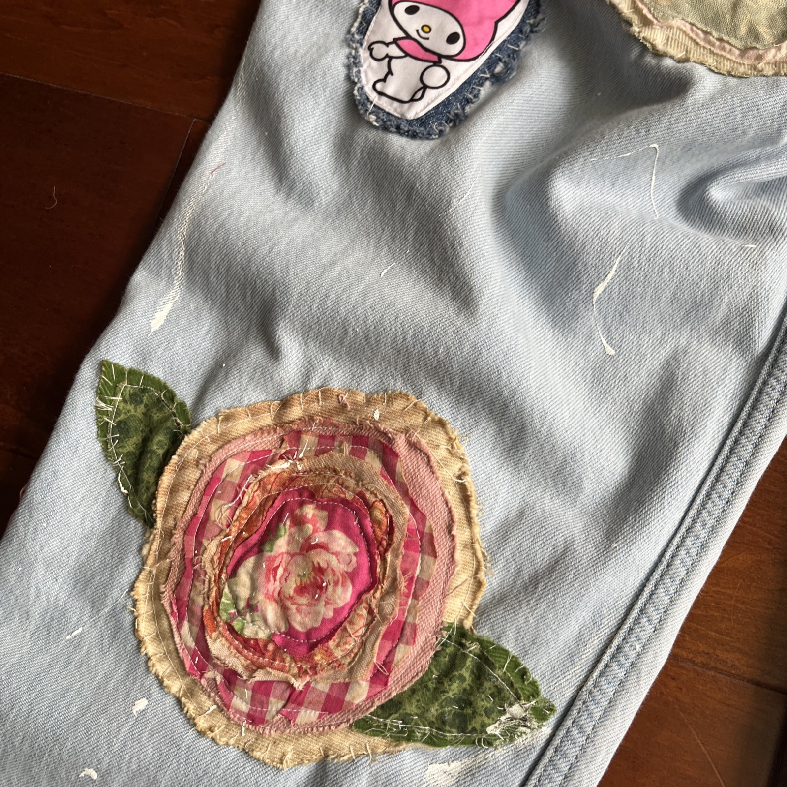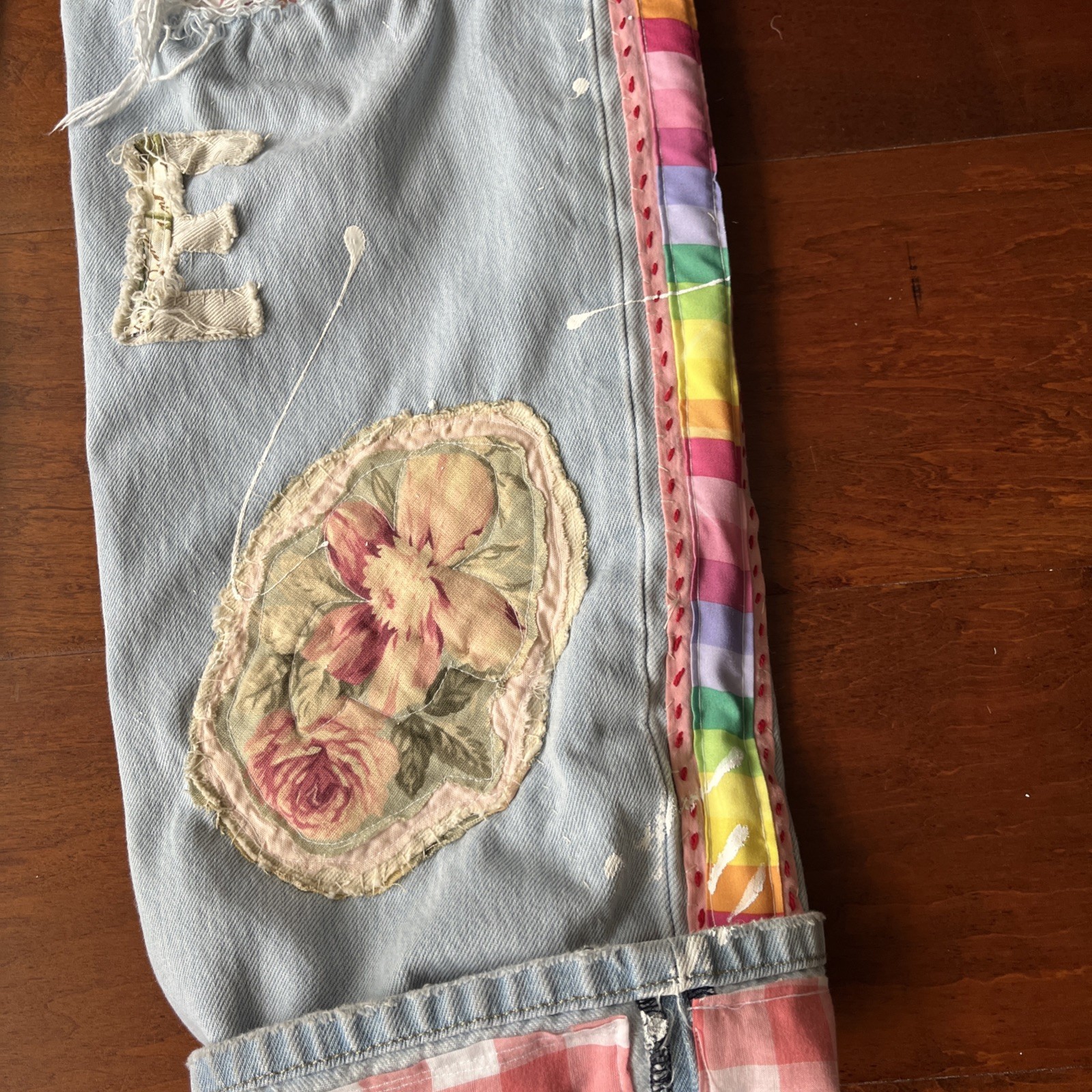 Just finished this fun colorful patchwork creation using a handful of vintage fabric pieces some from old fabric collection and some more . Waist of the jeans used measures appx 17”across, Inseam measures 30. Cuff is lined with pink checkered fabric.