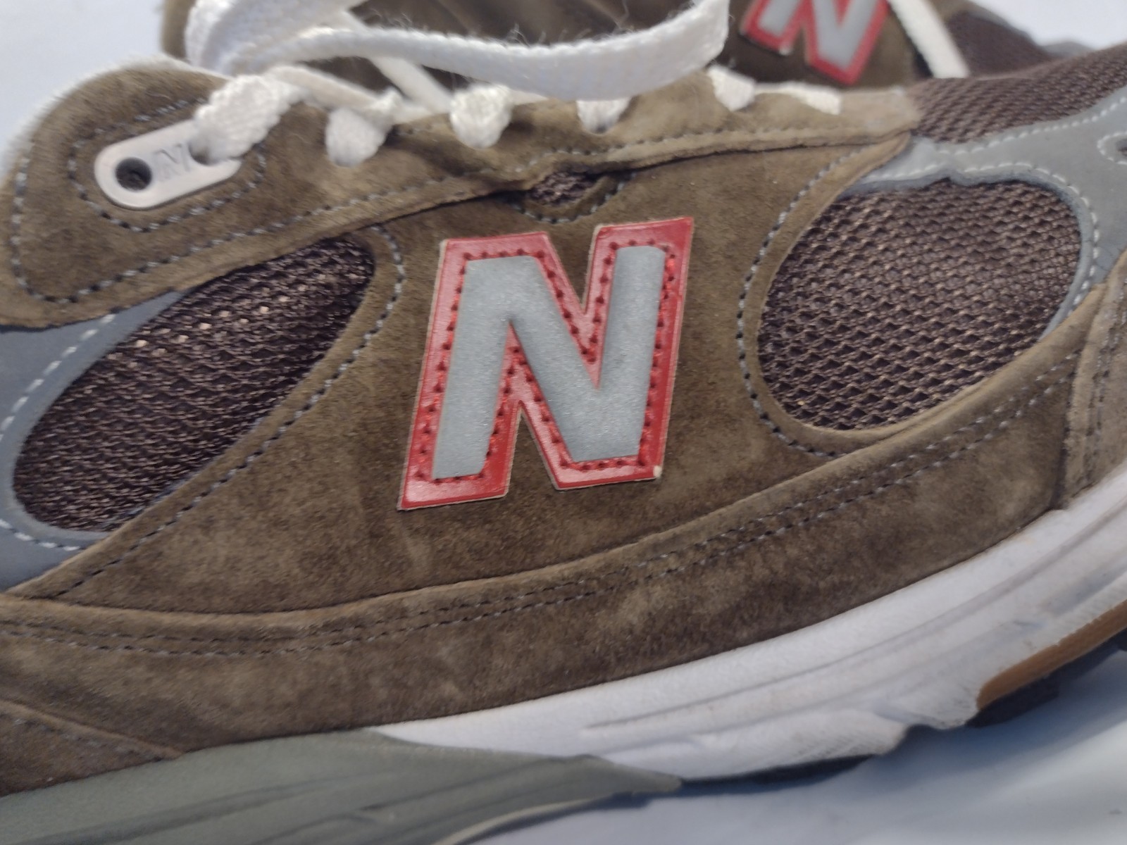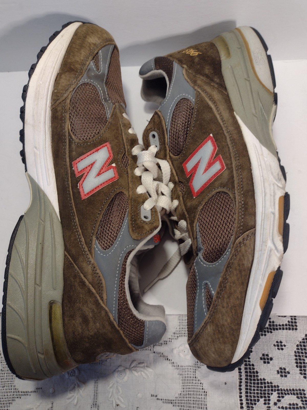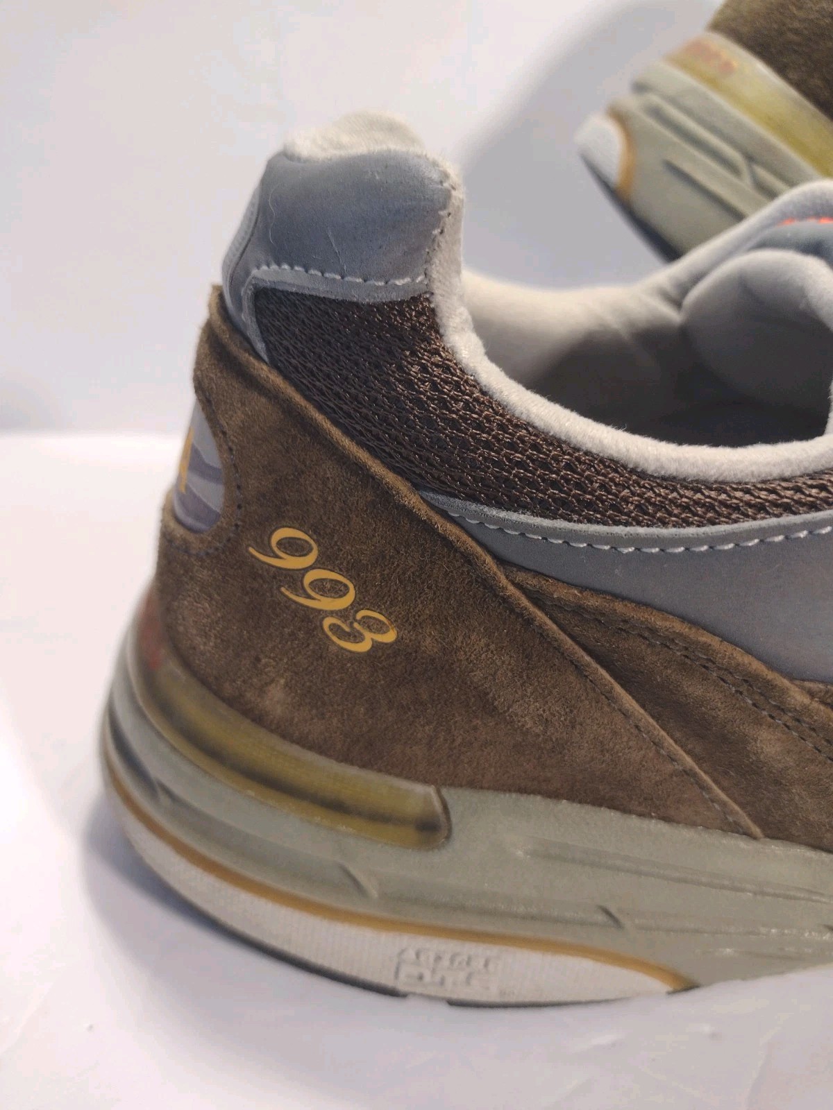 - Light interior wear near the top lace area on each shoe where a small bit of foam is visible — common on 993s and not noticeable when worn.