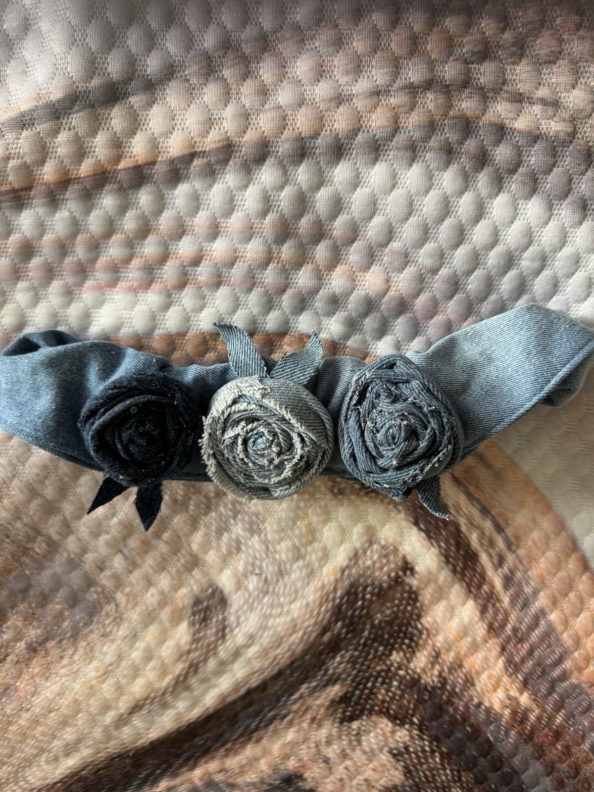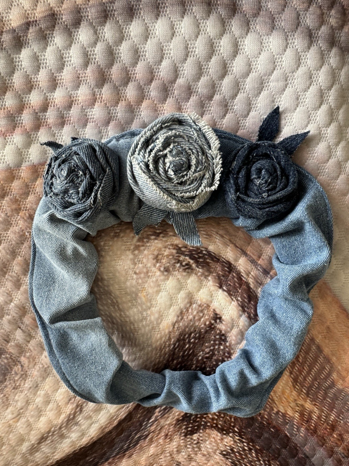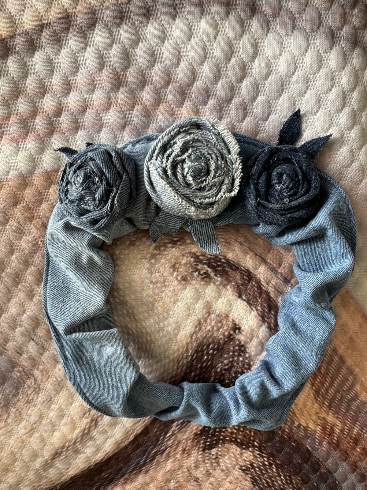 Upcycled Flower Rustic Denim Roses on Upcycled Denim stretch Headband