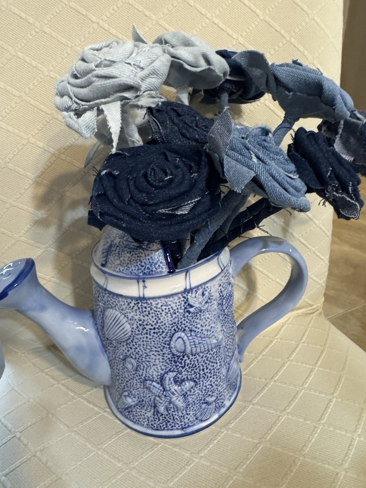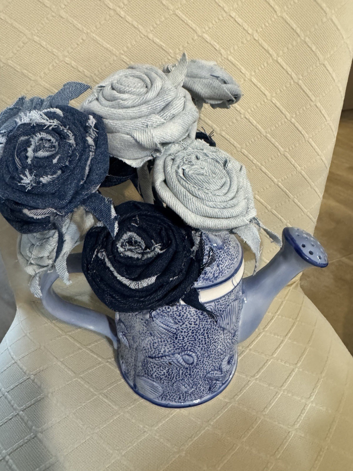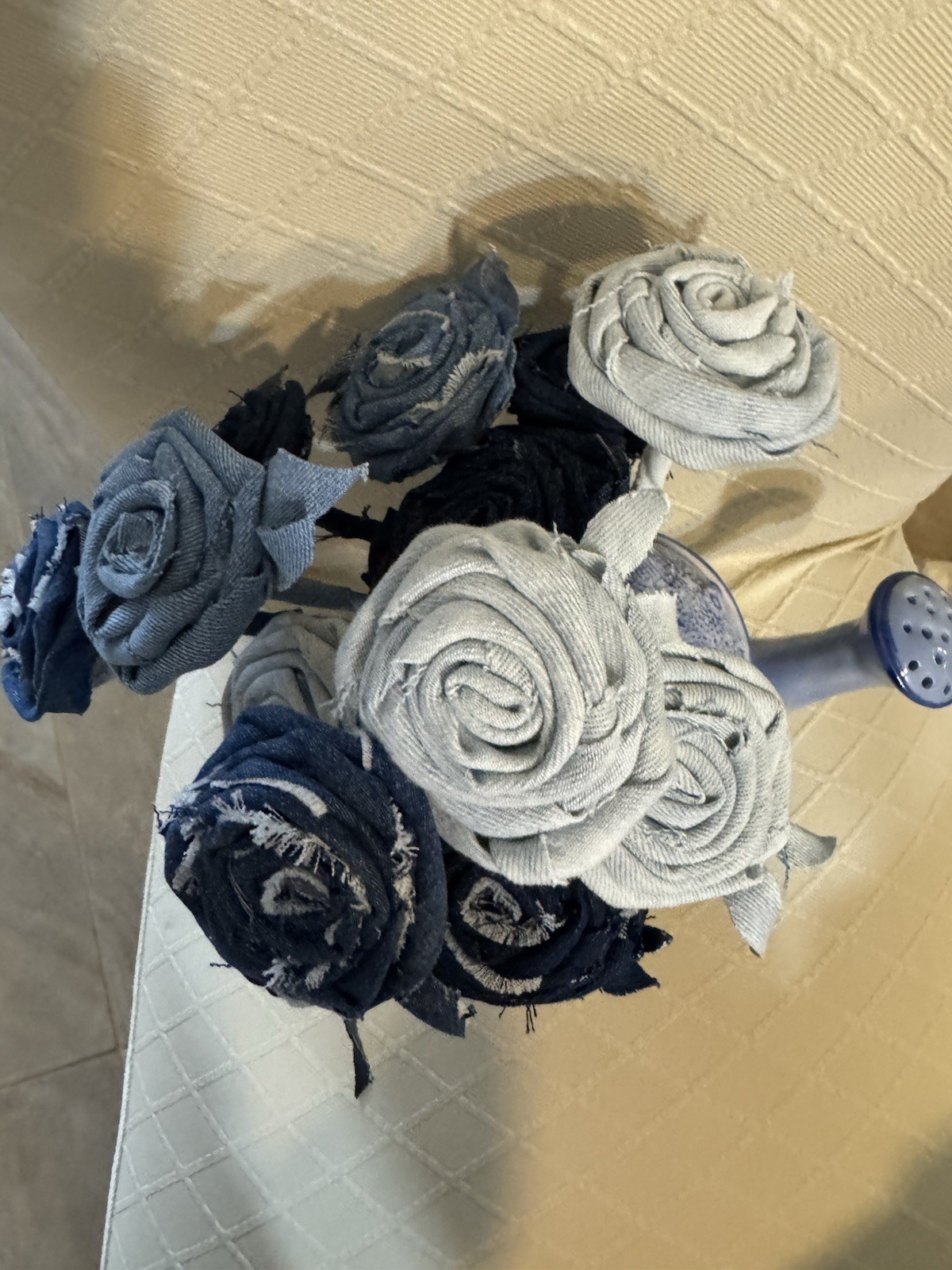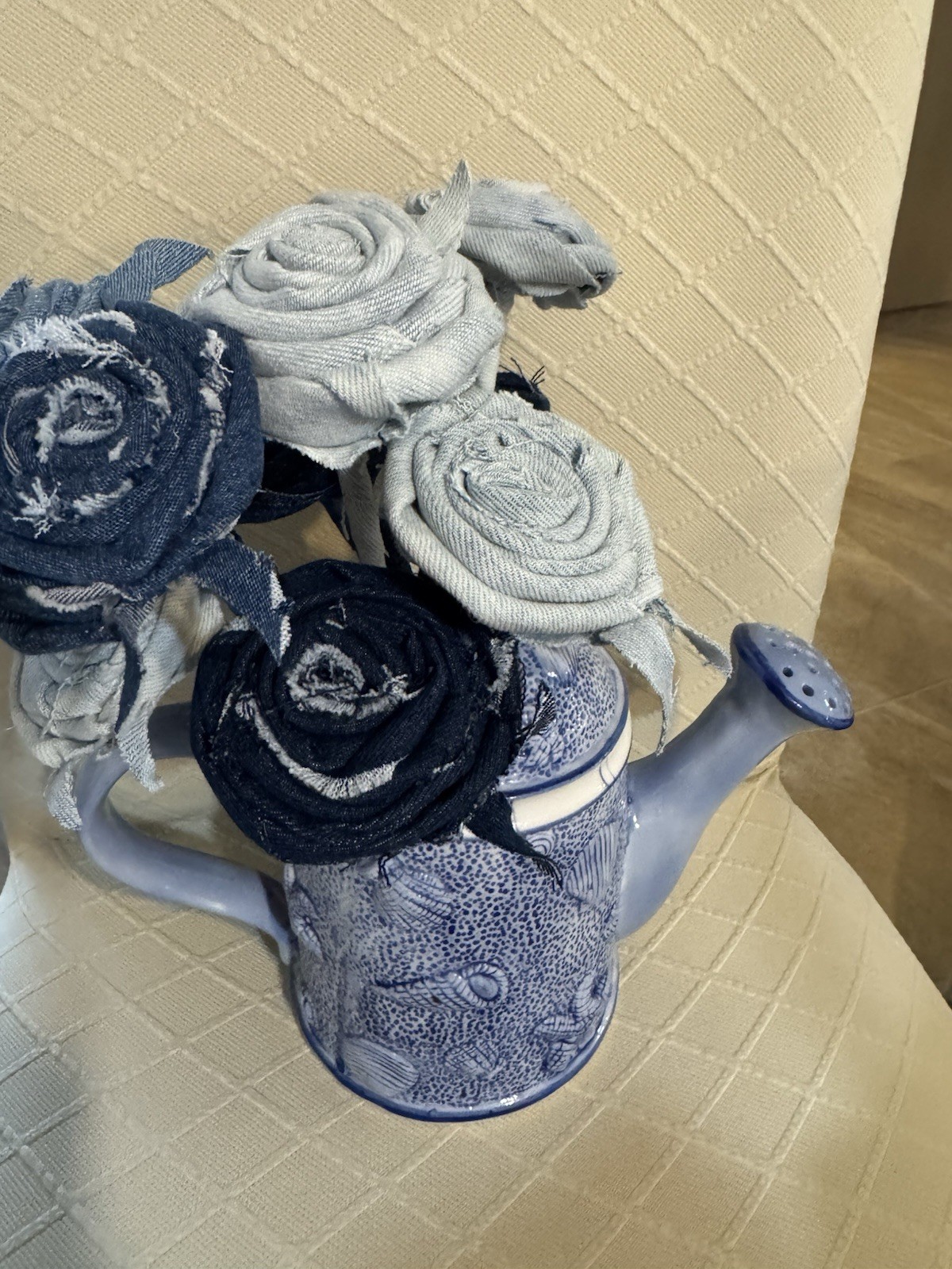 The product is a handmade denim rose bouquet upcycled from blue denim jeans material. These handmade roses are perfect for all occasions and adds a unique and creative touch to home décor. They are eco friendly. The rose theme and blue color make it a beautiful and stylish addition to any space, bringing a touch of nature-inspired beauty into the home. Roses are different sizes. In length. And different shades of denim. Shades may be different than what is pictured. Upcycled unique watering can vase brings a touch of whimsy to any room they are displayed in! Great for hostess or host gift. Awesome gift. Birthdays and anniversaries also.
