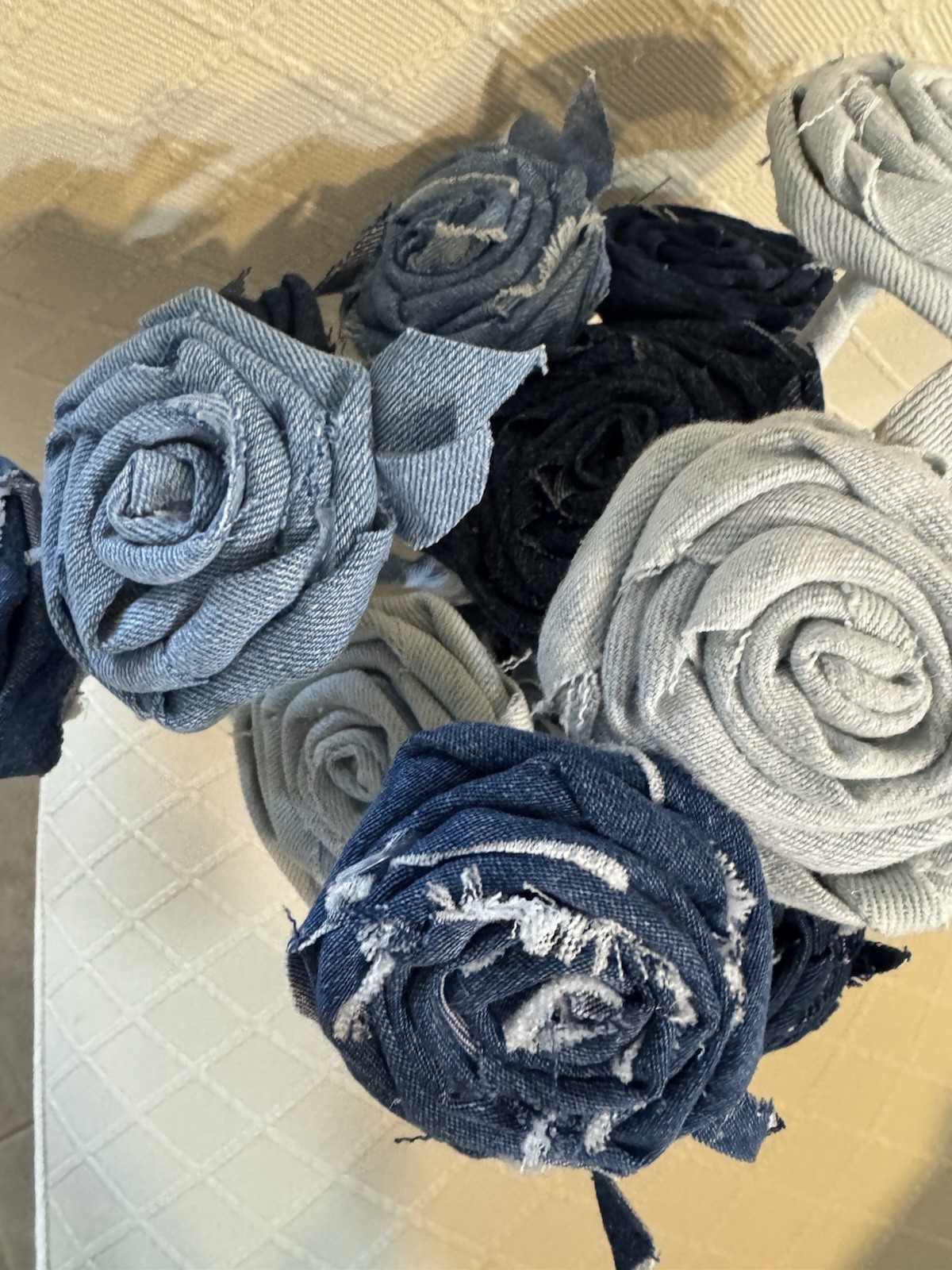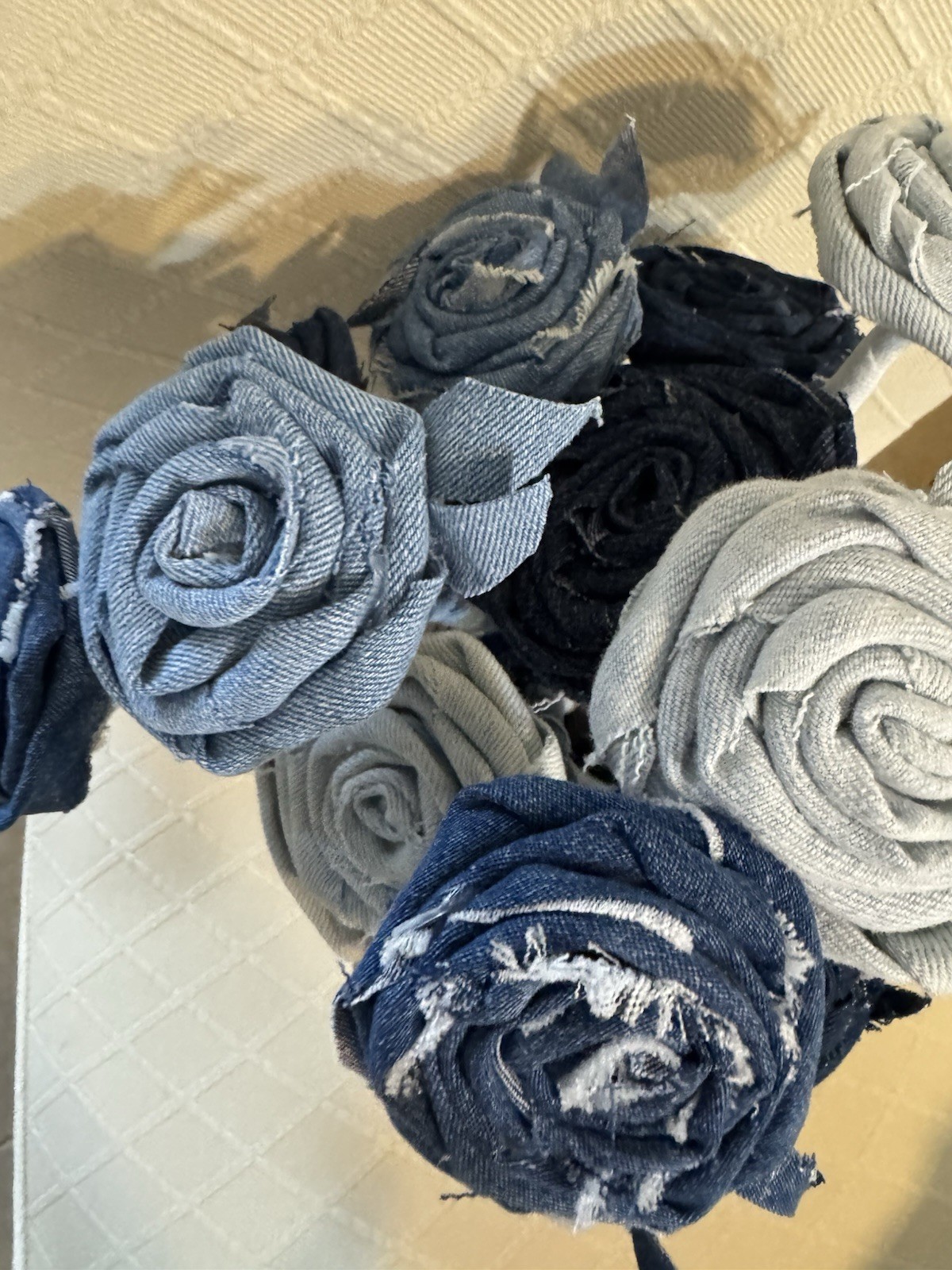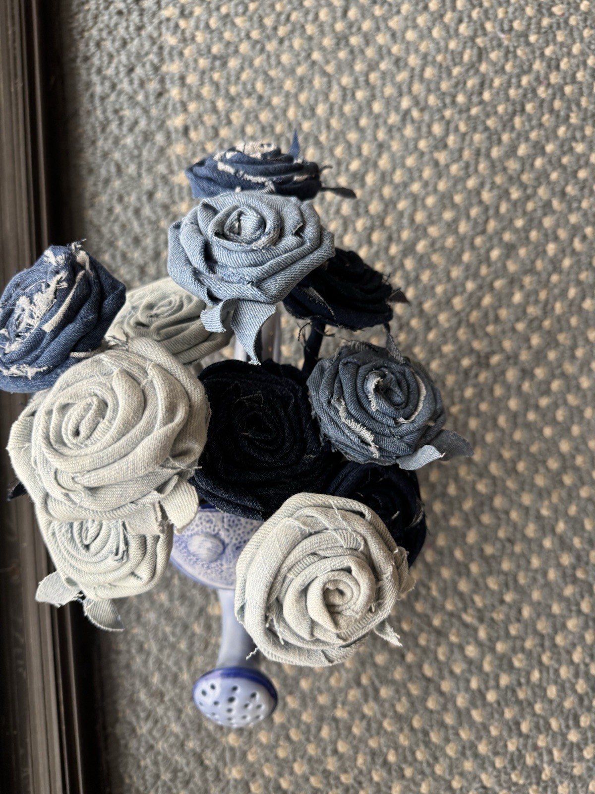 The product is a handmade denim rose bouquet upcycled from blue denim jeans material. These handmade roses are perfect for all occasions and adds a unique and creative touch to home décor. They are eco friendly. The rose theme and blue color make it a beautiful and stylish addition to any space, bringing a touch of nature-inspired beauty into the home. Roses are different sizes. In length. And different shades of denim. Shades may be different than what is pictured. Upcycled unique watering can vase brings a touch of whimsy to any room they are displayed in! Great for hostess or host gift. Awesome gift. Birthdays and anniversaries also.