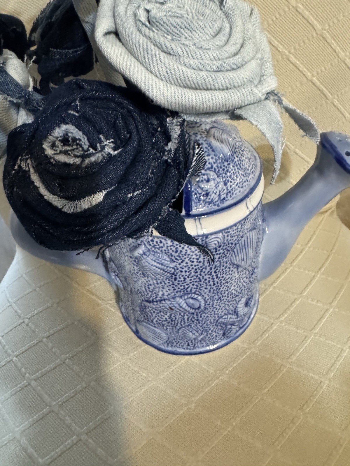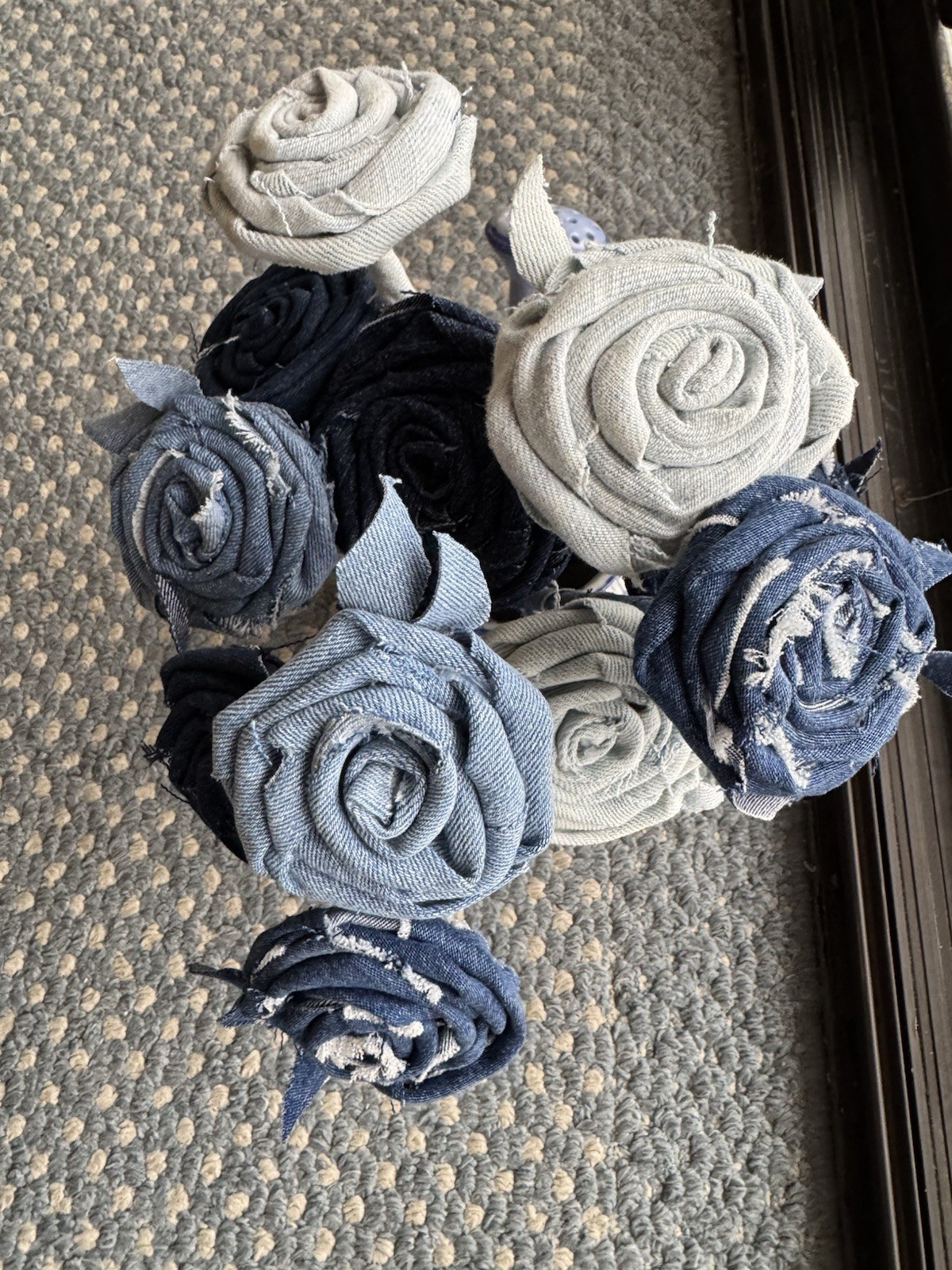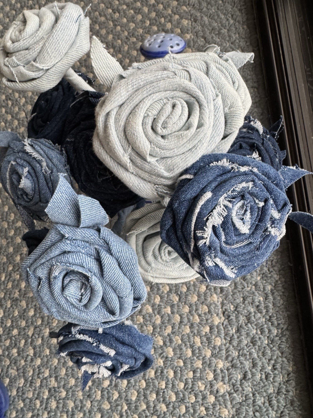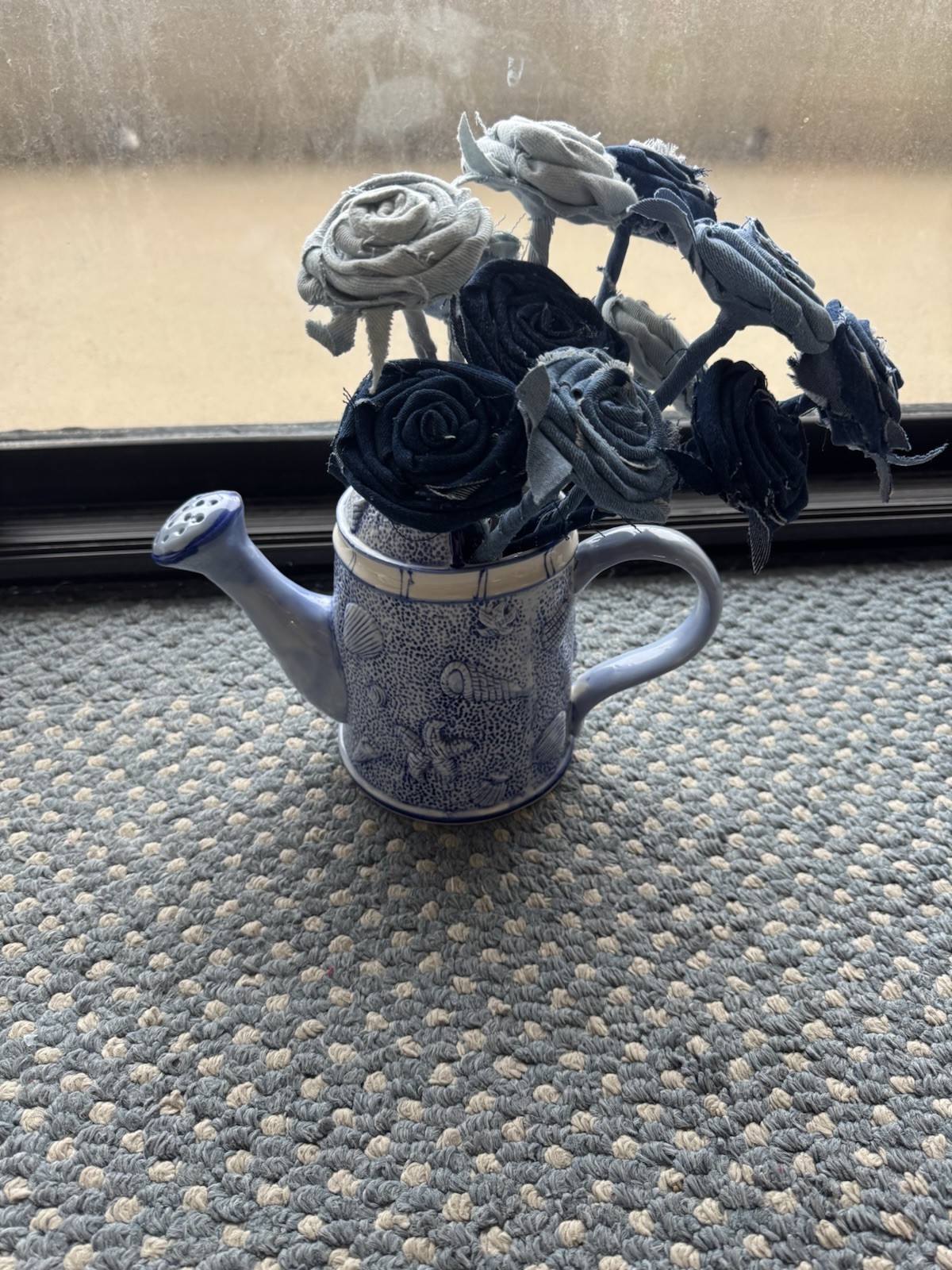 The product is a handmade denim rose bouquet upcycled from blue denim jeans material. These handmade roses are perfect for all occasions and adds a unique and creative touch to home décor. They are eco friendly. The rose theme and blue color make it a beautiful and stylish addition to any space, bringing a touch of nature-inspired beauty into the home. Roses are different sizes. In length. And different shades of denim. Shades may be different than what is pictured. Upcycled unique watering can vase brings a touch of whimsy to any room they are displayed in! Great for hostess or host gift. Awesome gift. Birthdays and anniversaries also.
