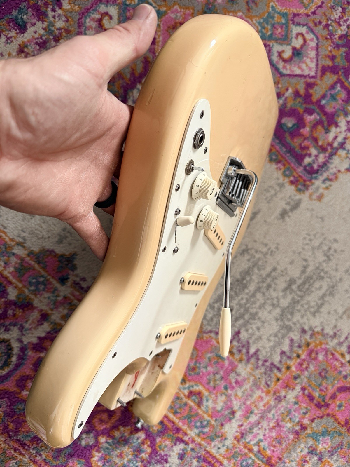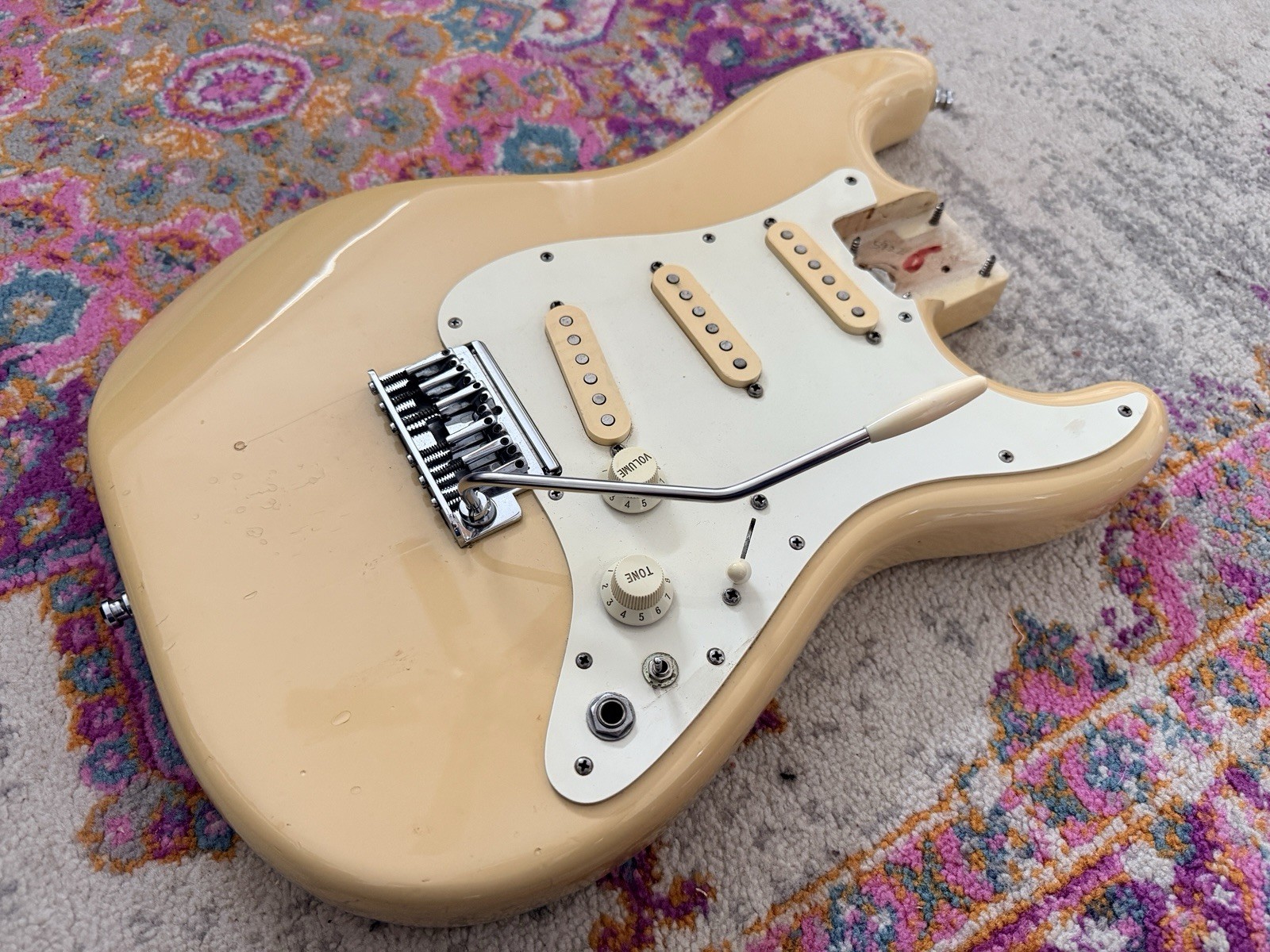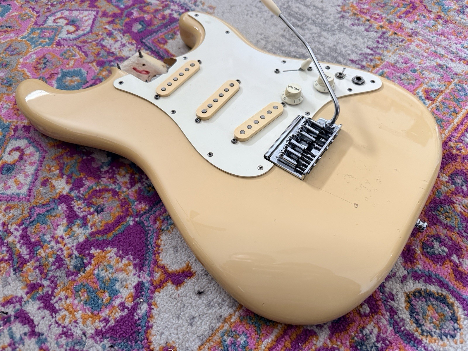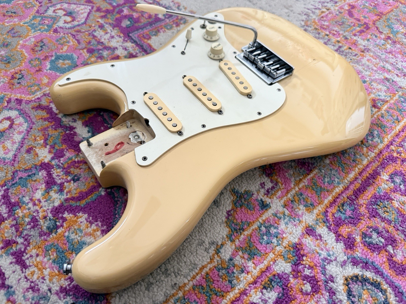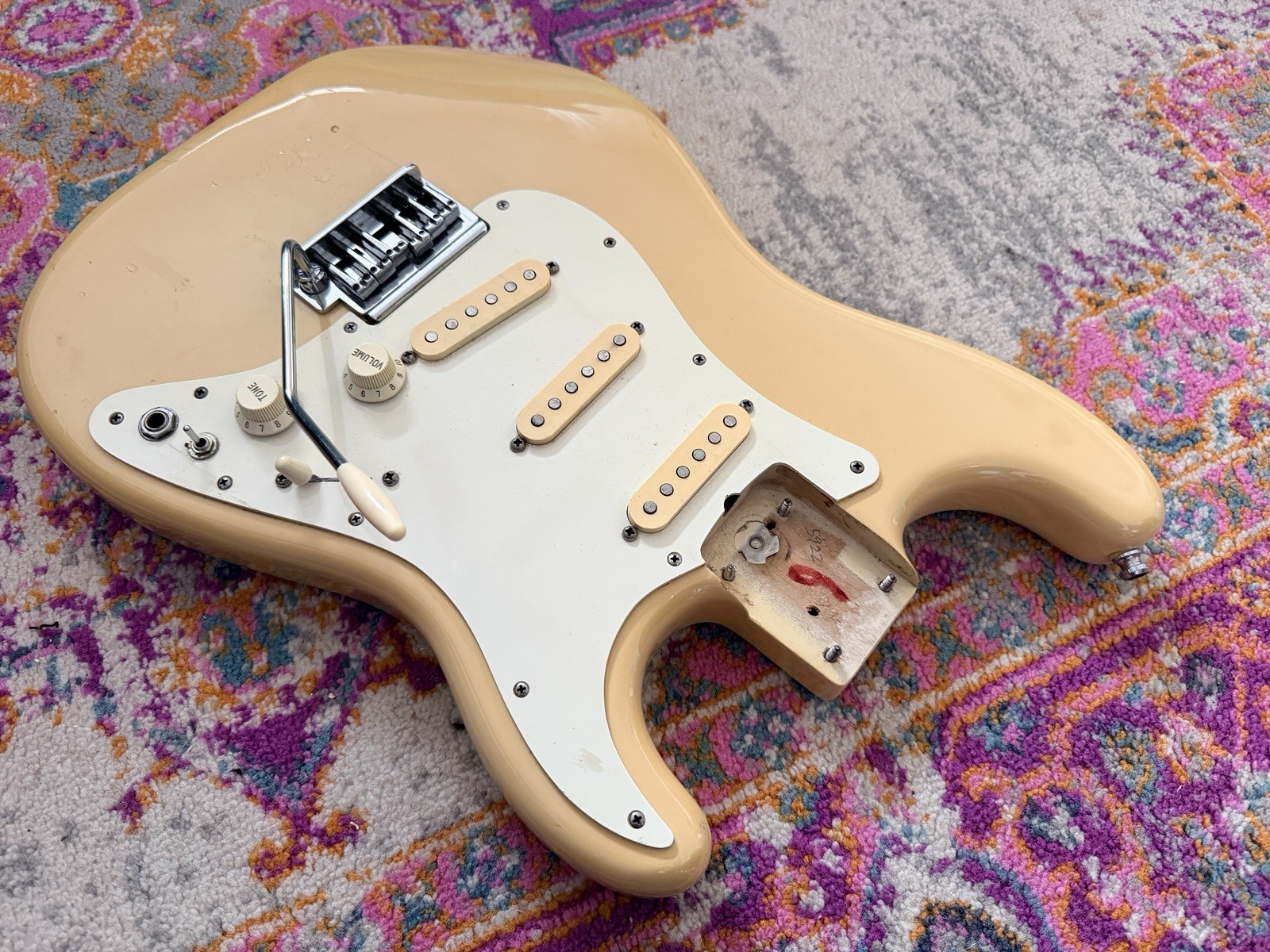 • Genuine Fender USA Dan Smith Era Stratocaster body (1983–1984) • Classic 2-knob Dan Smith configuration • Original Olympic White finish with natural aging/patina • Finish has aged to a beautiful cream / blonde tone • Fully loaded with what appears to be all original electronics, hardware, and FreeFlyte tremolo system