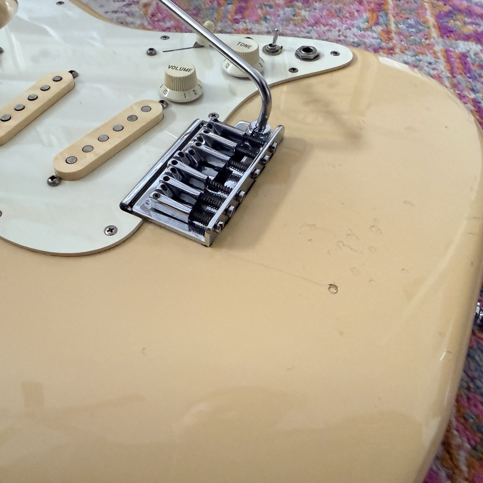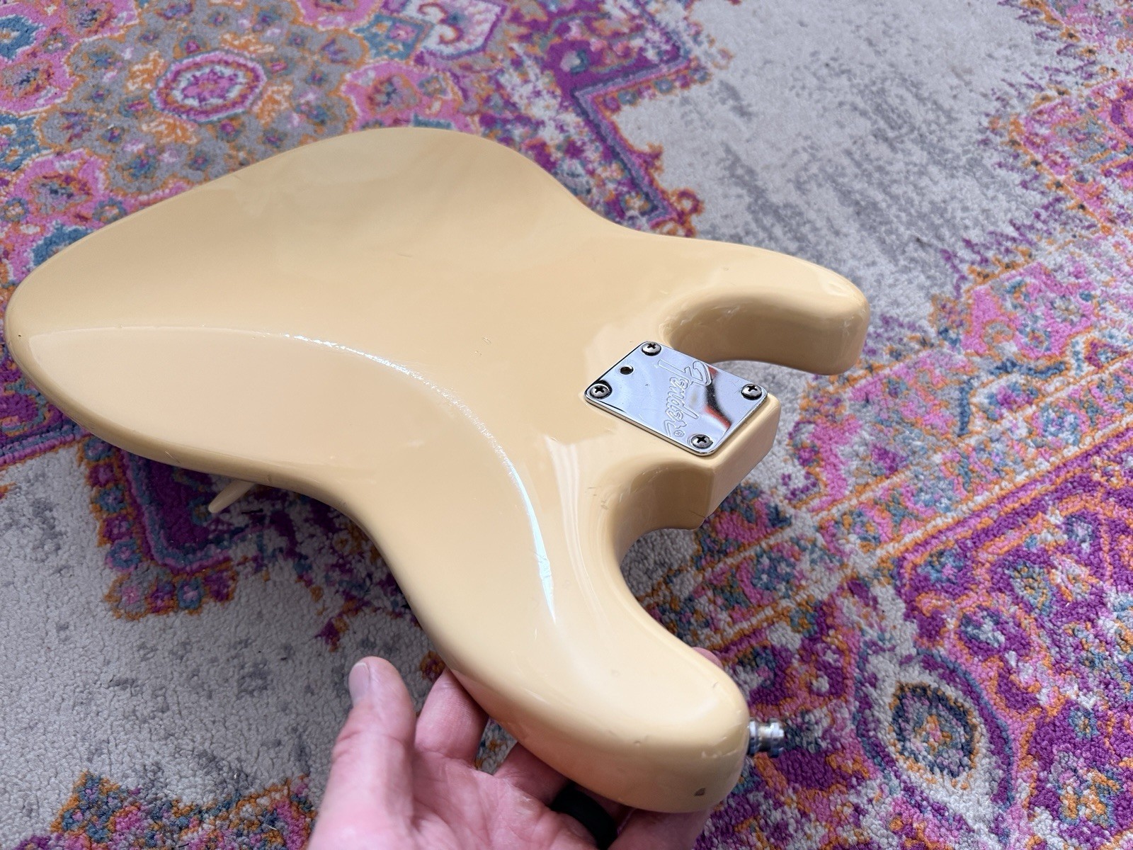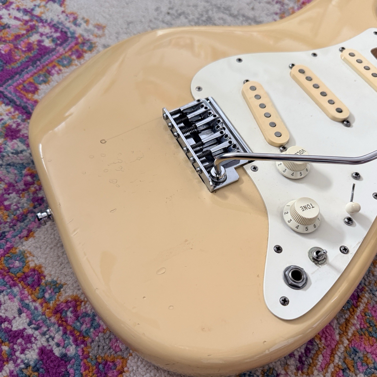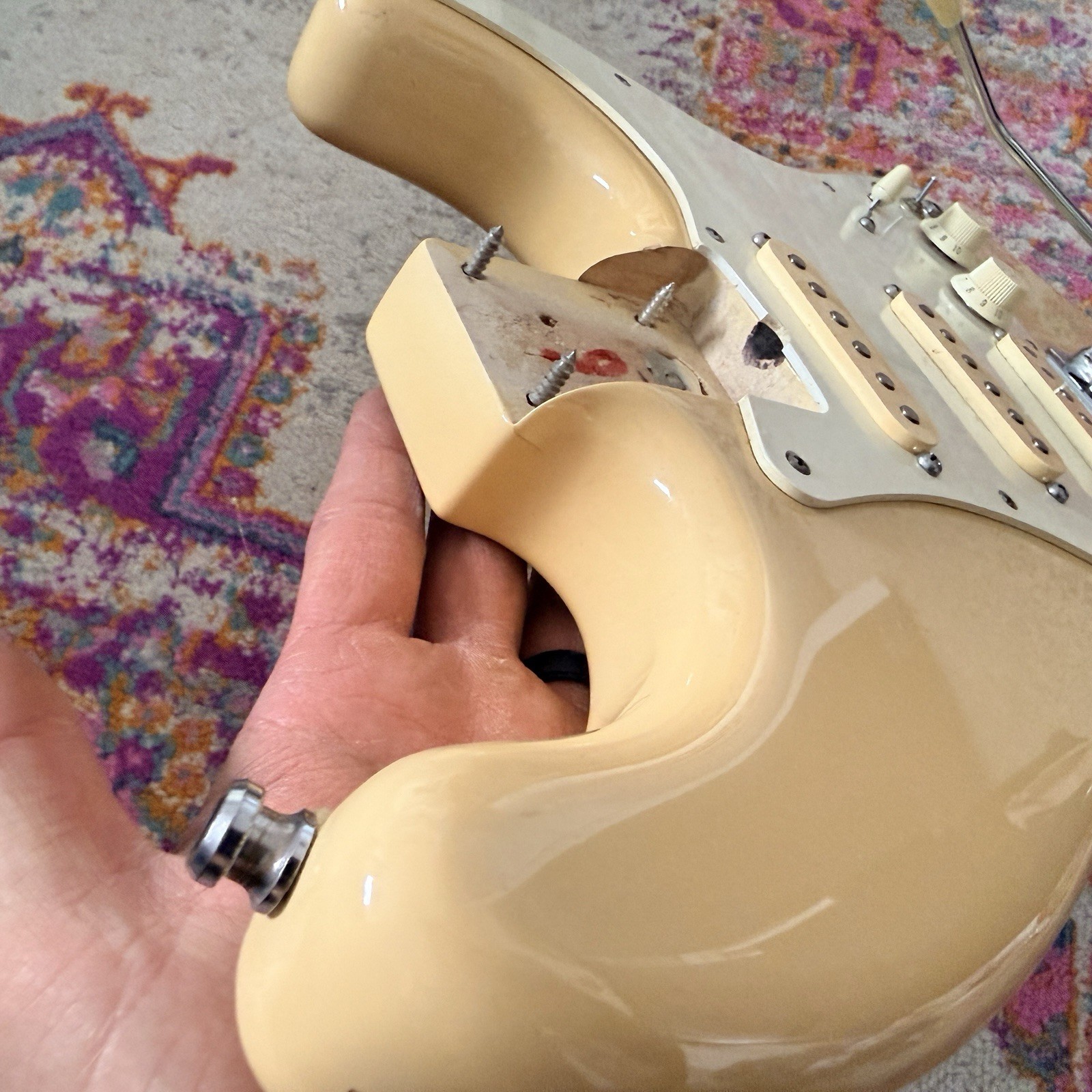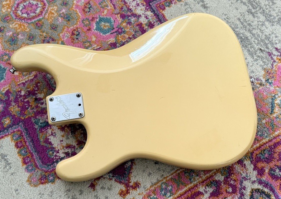 • Genuine Fender USA Dan Smith Era Stratocaster body (1983–1984) • Classic 2-knob Dan Smith configuration • Original Olympic White finish with natural aging/patina • Finish has aged to a beautiful cream / blonde tone • Fully loaded with what appears to be all original electronics, hardware, and FreeFlyte tremolo system
