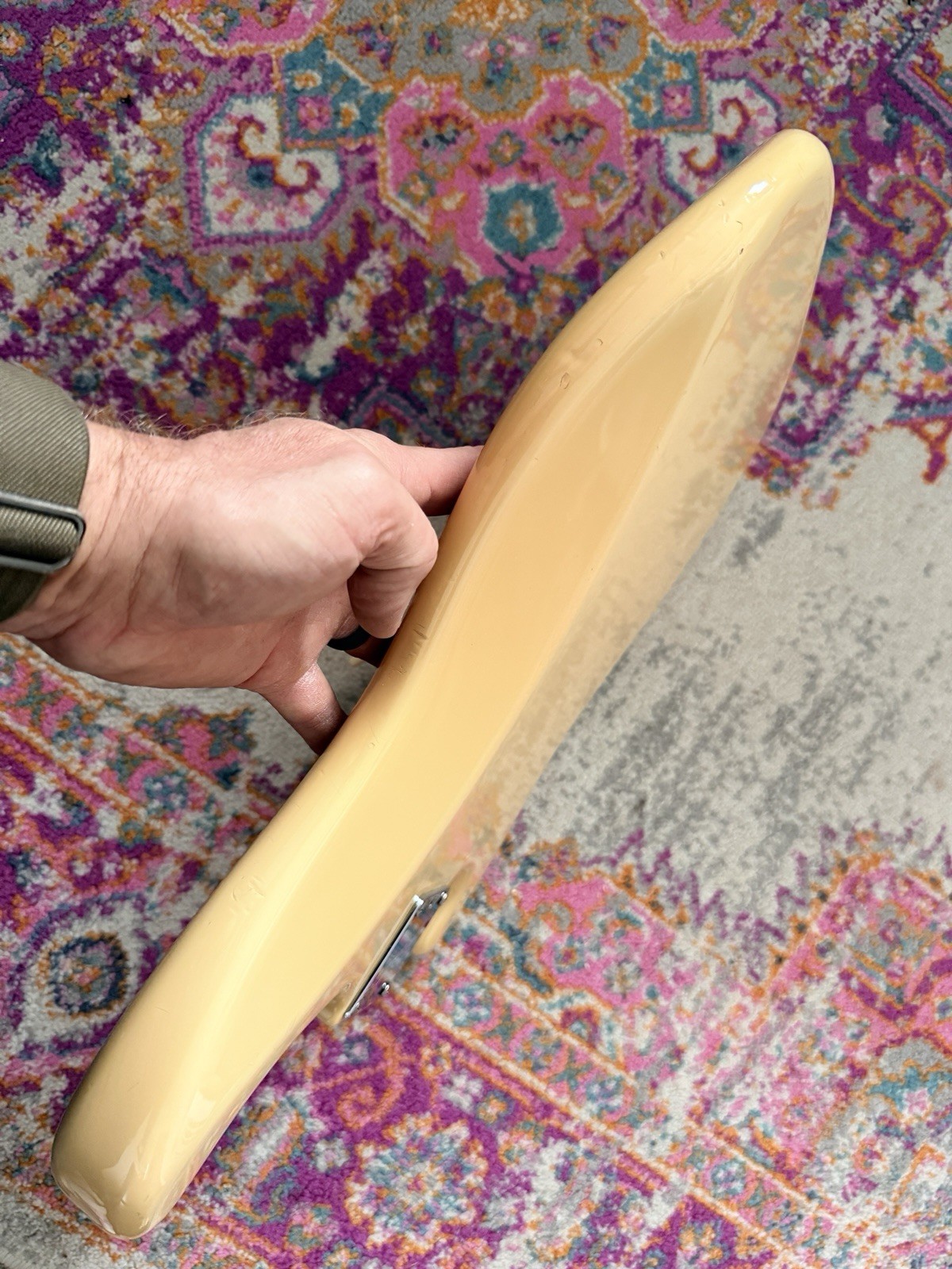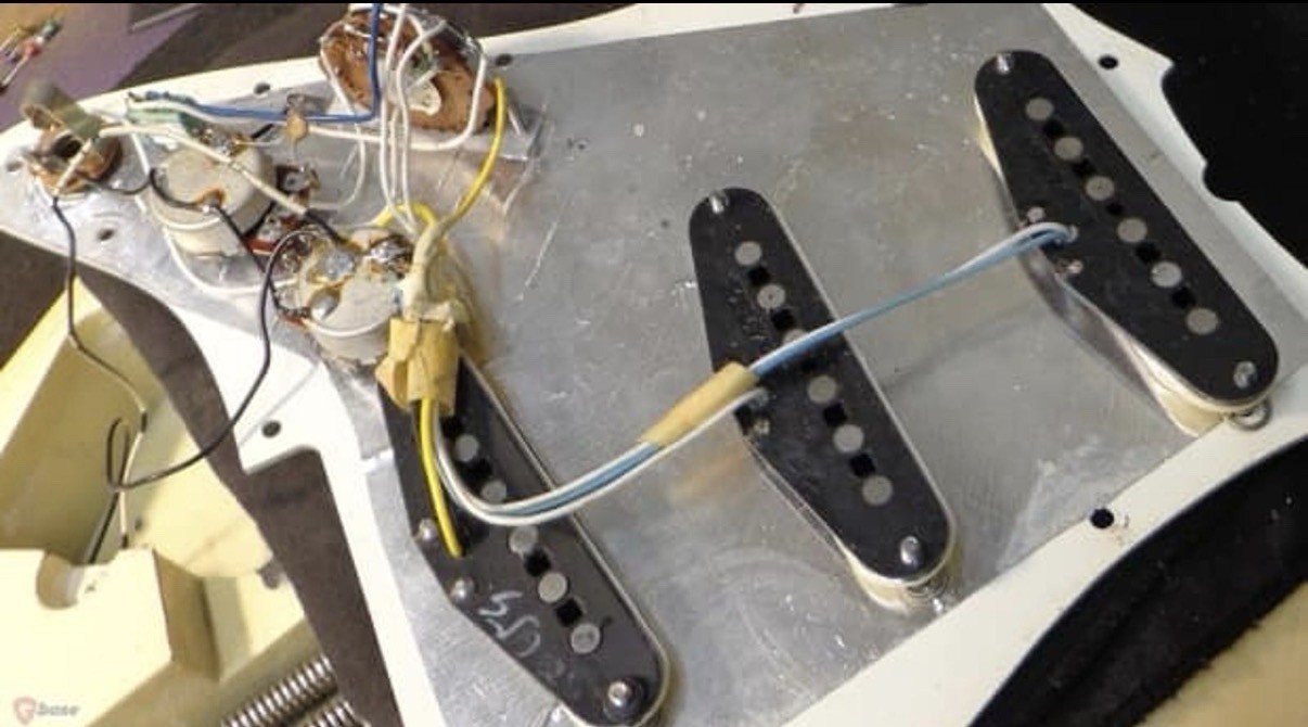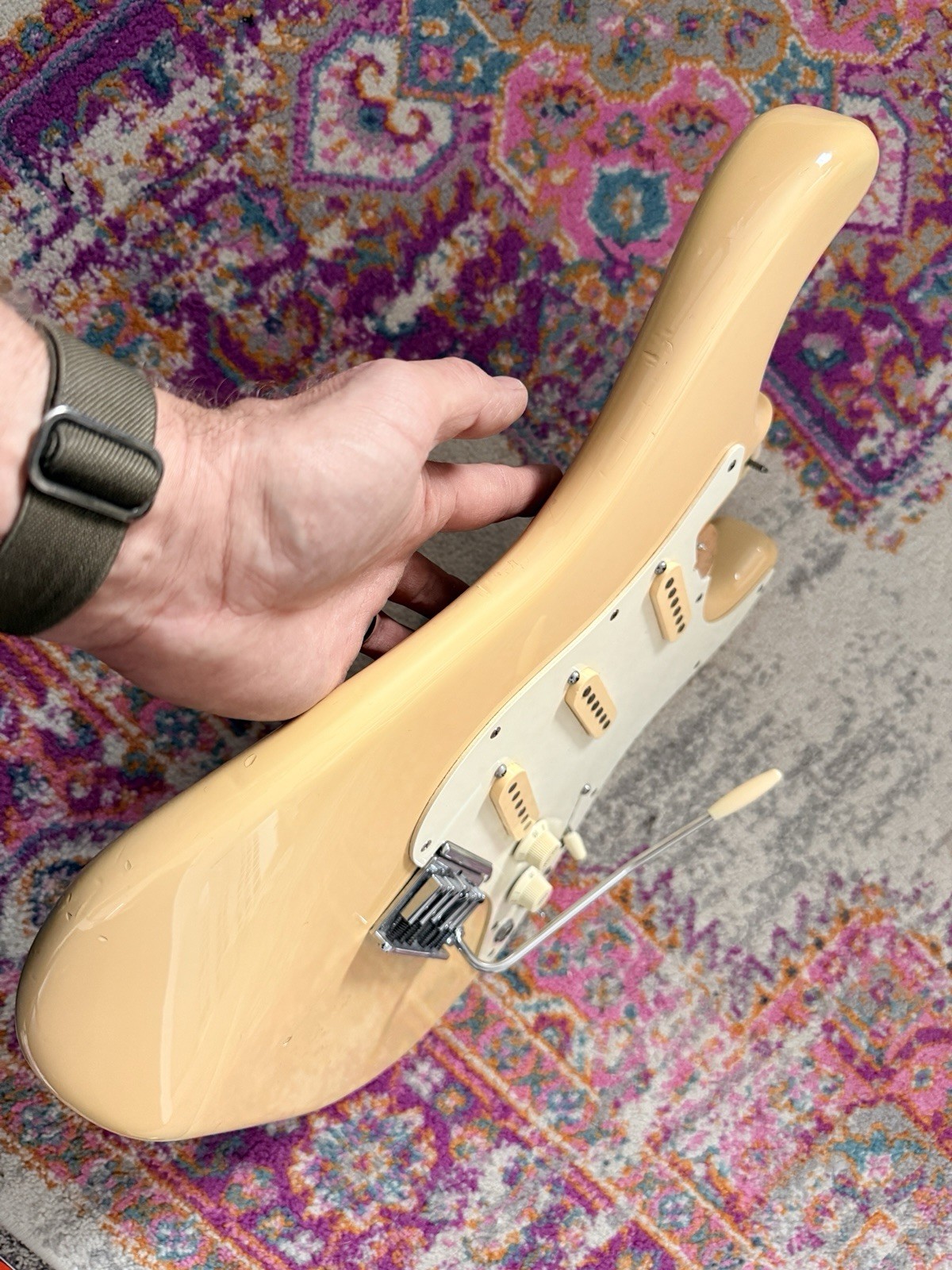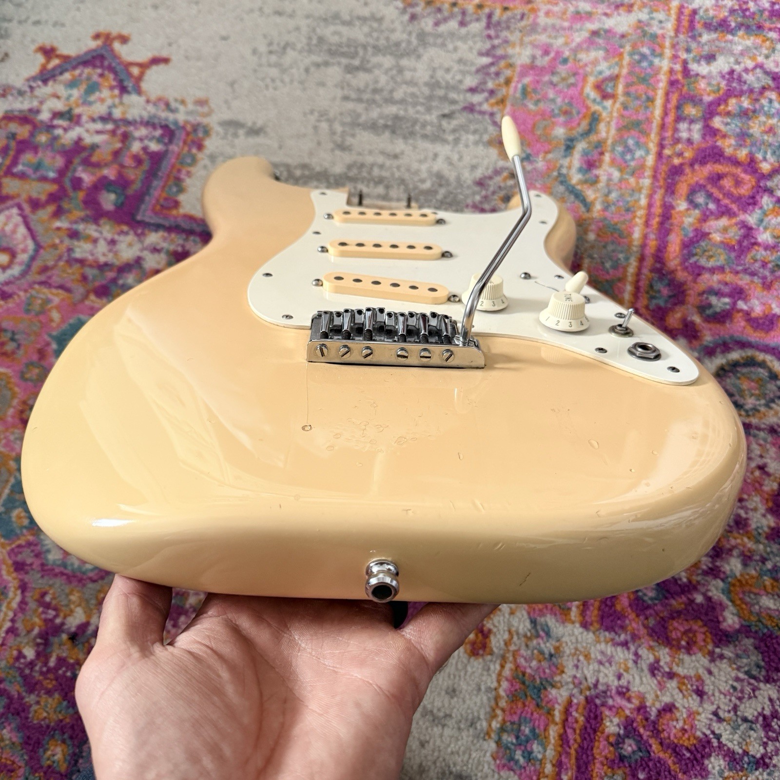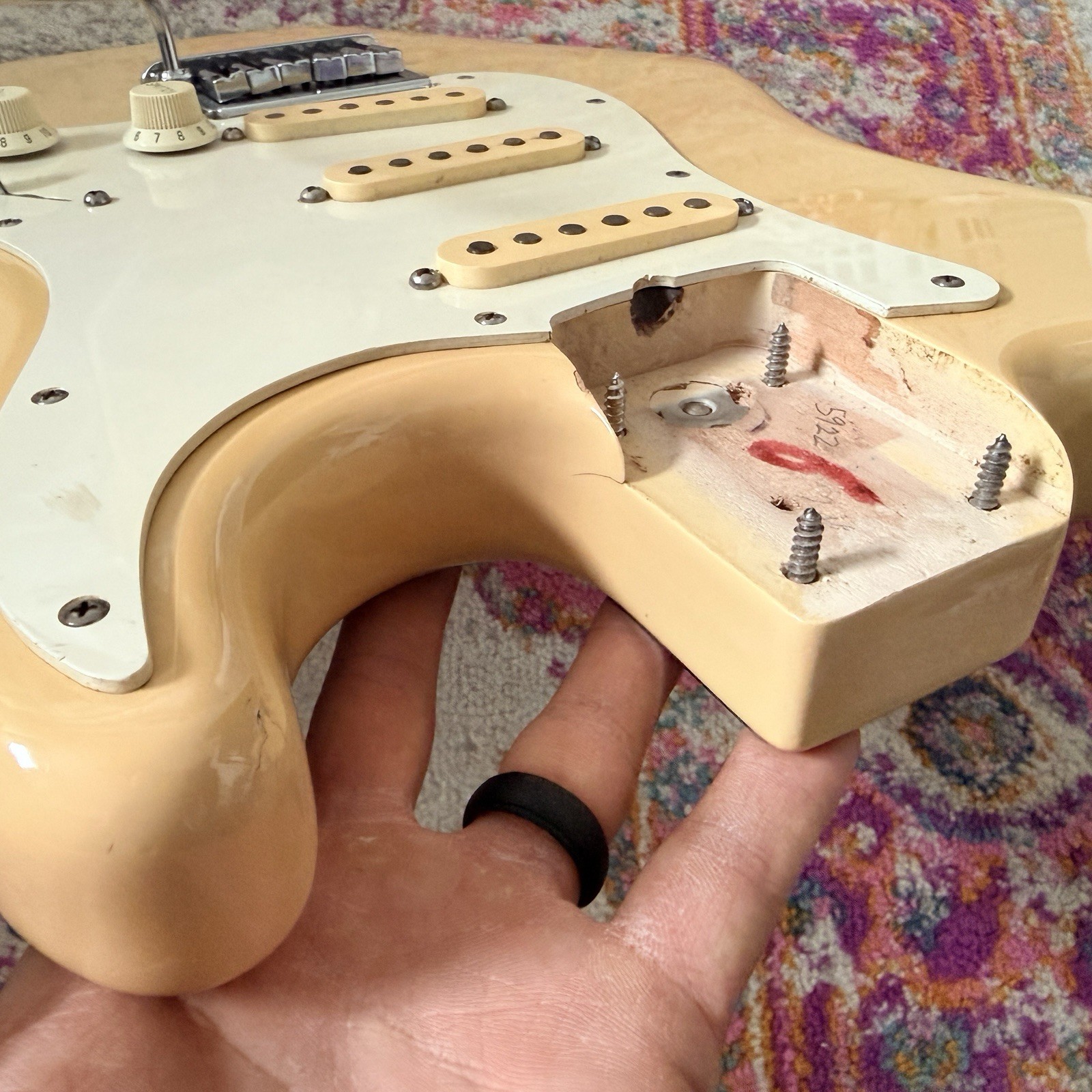 • Genuine Fender USA Dan Smith Era Stratocaster body (1983–1984) • Classic 2-knob Dan Smith configuration • Original Olympic White finish with natural aging/patina • Finish has aged to a beautiful cream / blonde tone • Fully loaded with what appears to be all original electronics, hardware, and FreeFlyte tremolo system