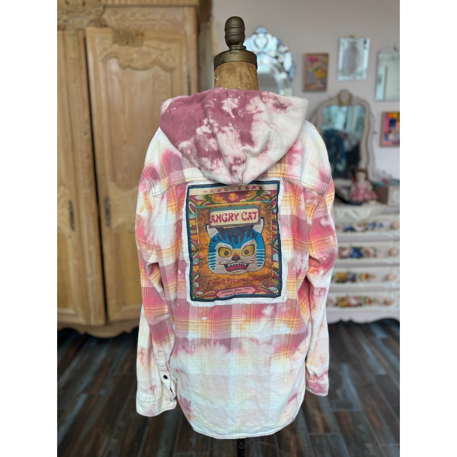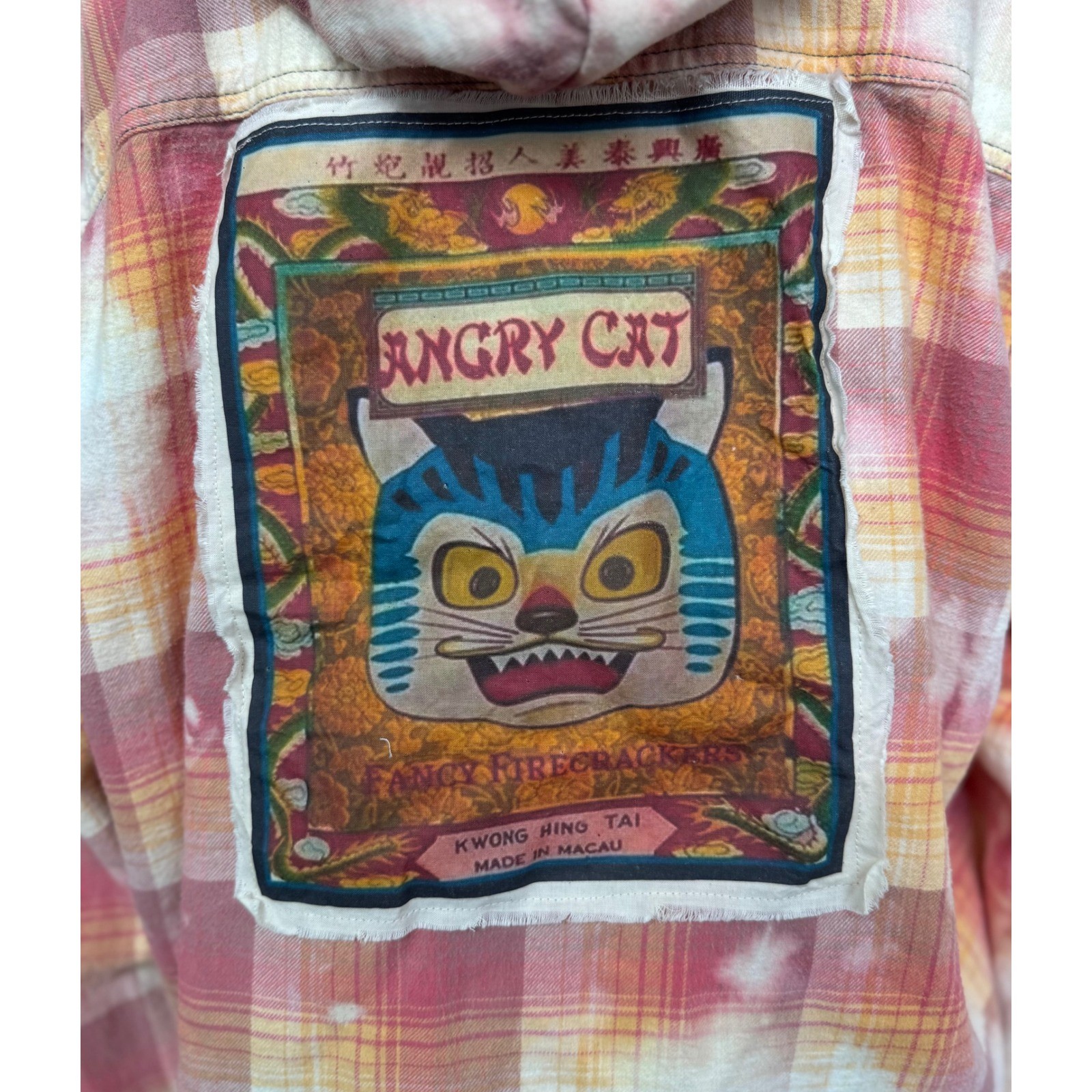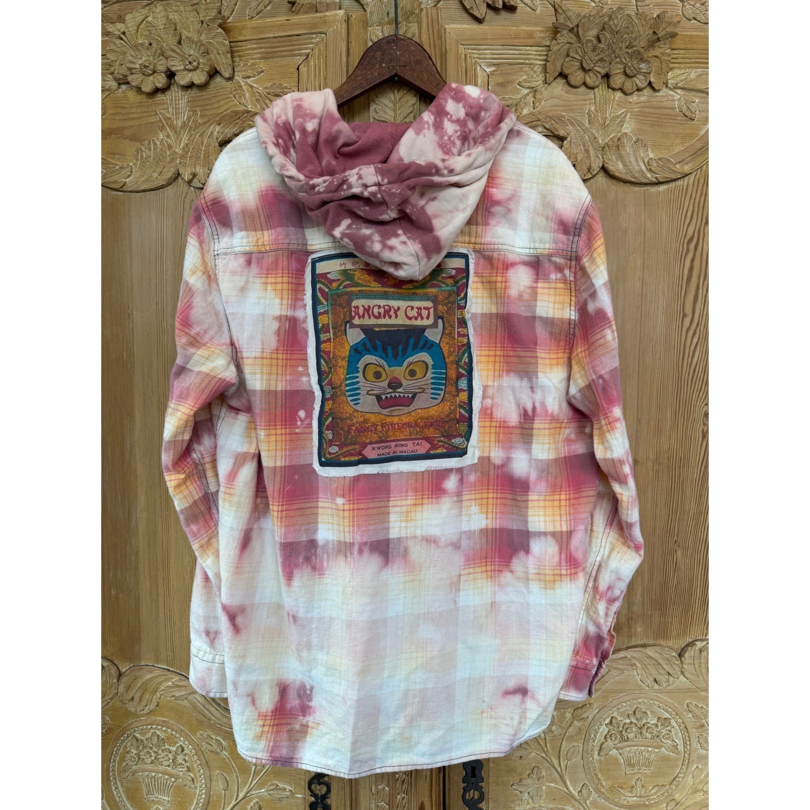 Hooded Flannel Bleach Dye Angry Cat Patch Upcycled Folk Art Shirt Large