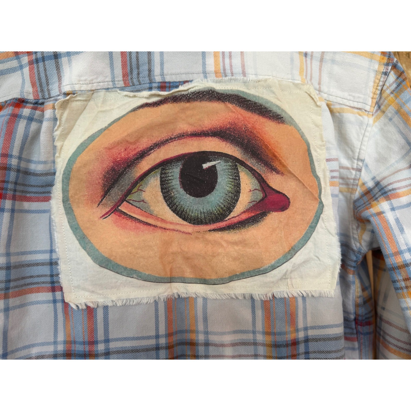 Soft, worn-in plaid flannel reworked with a striking authentic vintage eye print patch across the back—watchful, a little surreal, quietly powerful. Raw edge patch adds texture and that lived-in, artful feel.