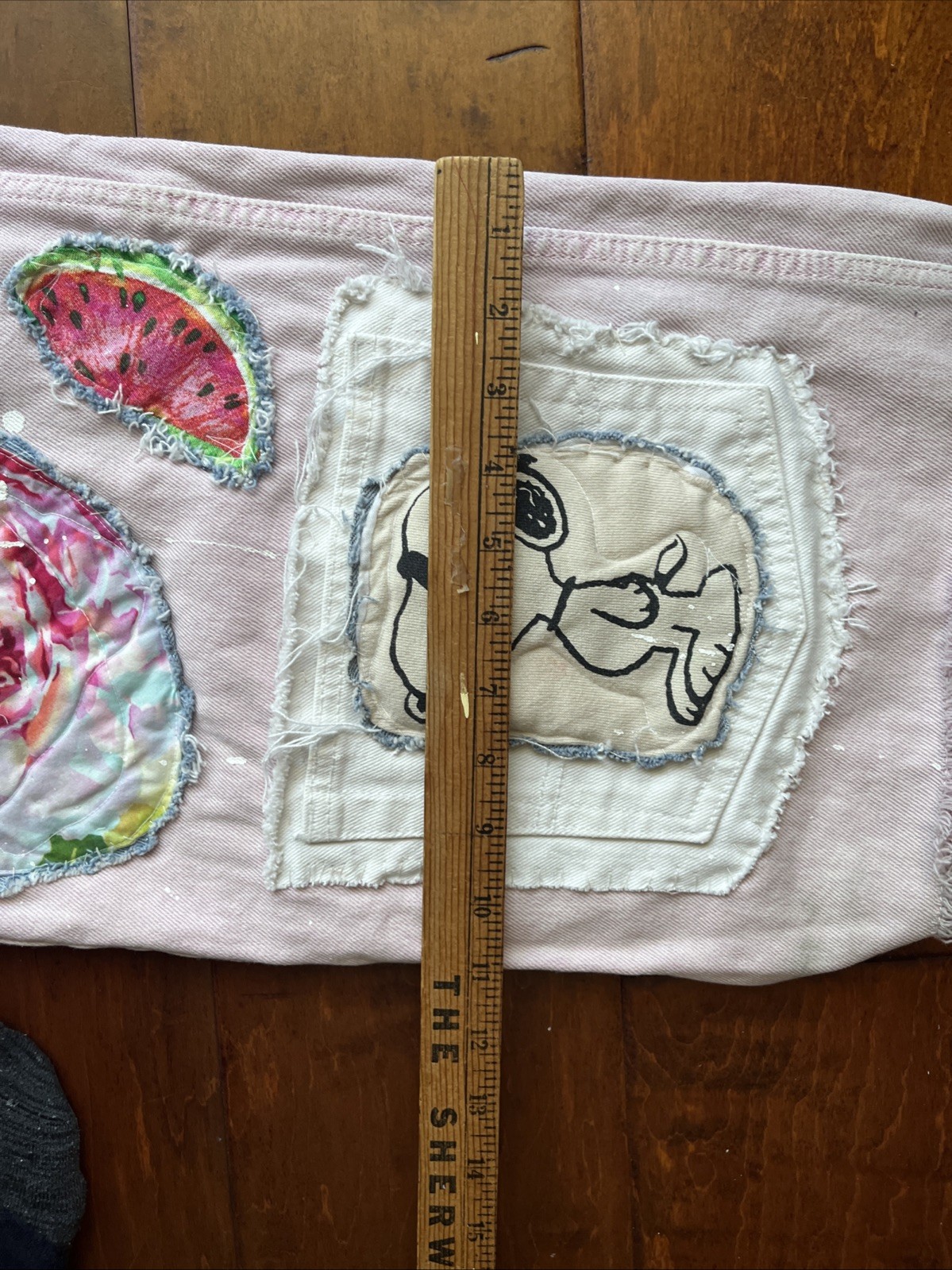 Just finished this fun colorful patchwork creation using a handful of vintage fabric pieces, some from old fabric collection and some more modern. Waist of the jeans used measures appx 15” across, Inseam measures 27” raw hem