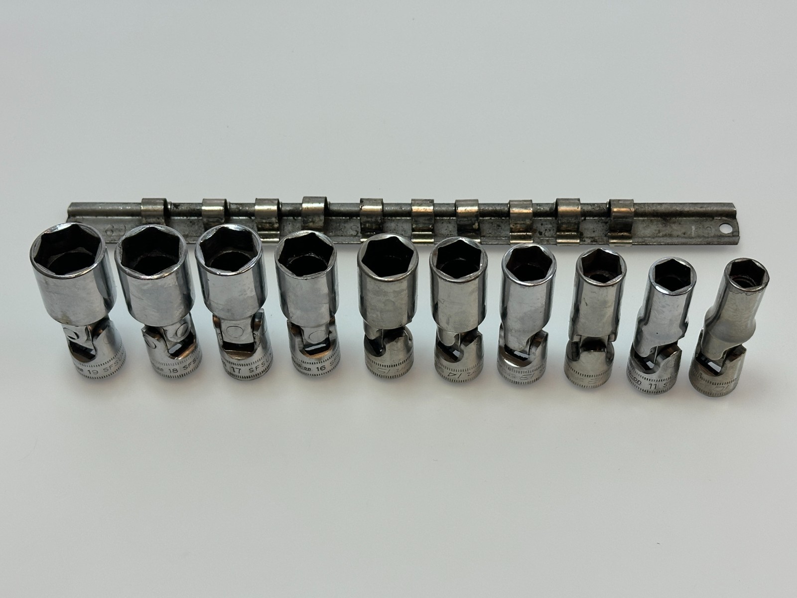 Condition Observations:Used swivel sockets in vintage working condition. The swivel action works fine on them with the exception of the 15mm which is quite loose. The points and the drive ends look functional.Some typical signs of use and cosmetic imperfections. Overall a fine set ready for use. Please reference pictures.