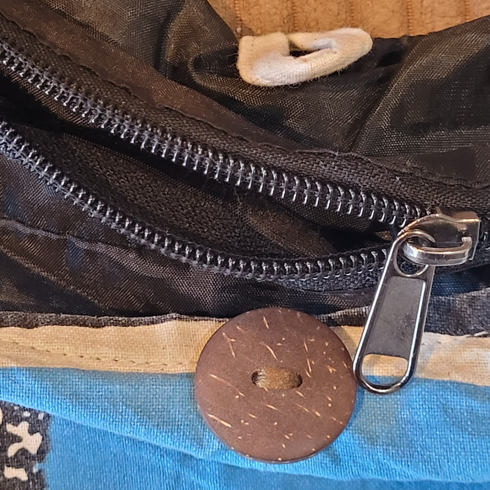 Closes with a button and inside is secured with a zipper. The bag has plenty of interior space and a side pocket to stash your keys and phone