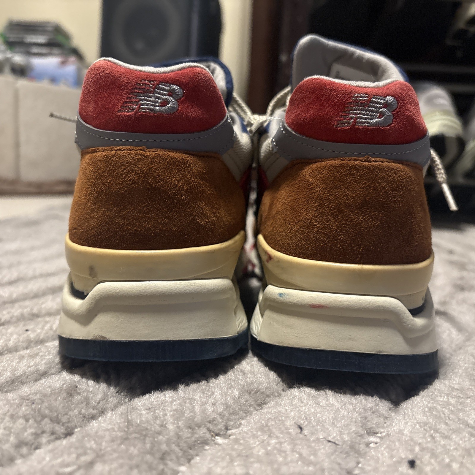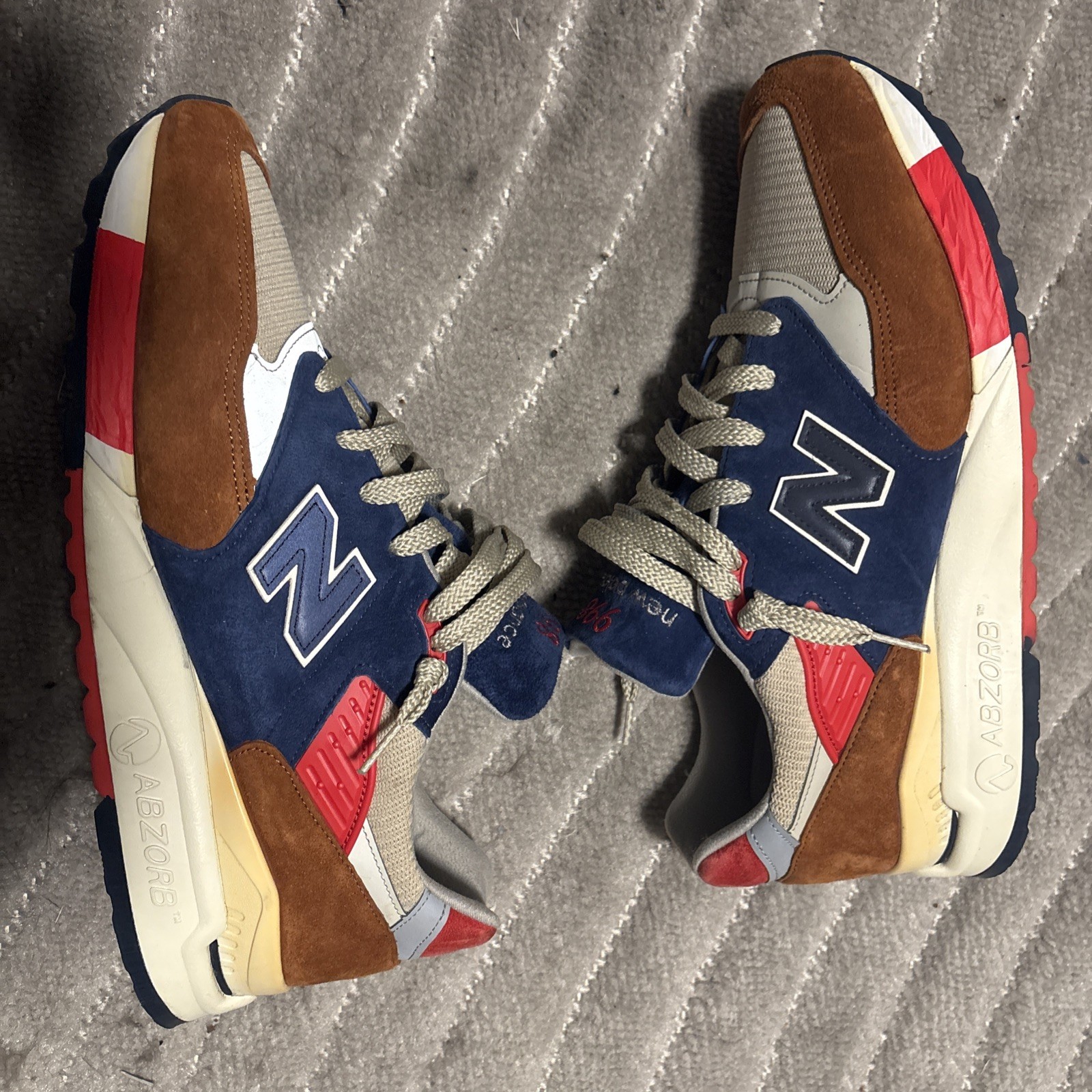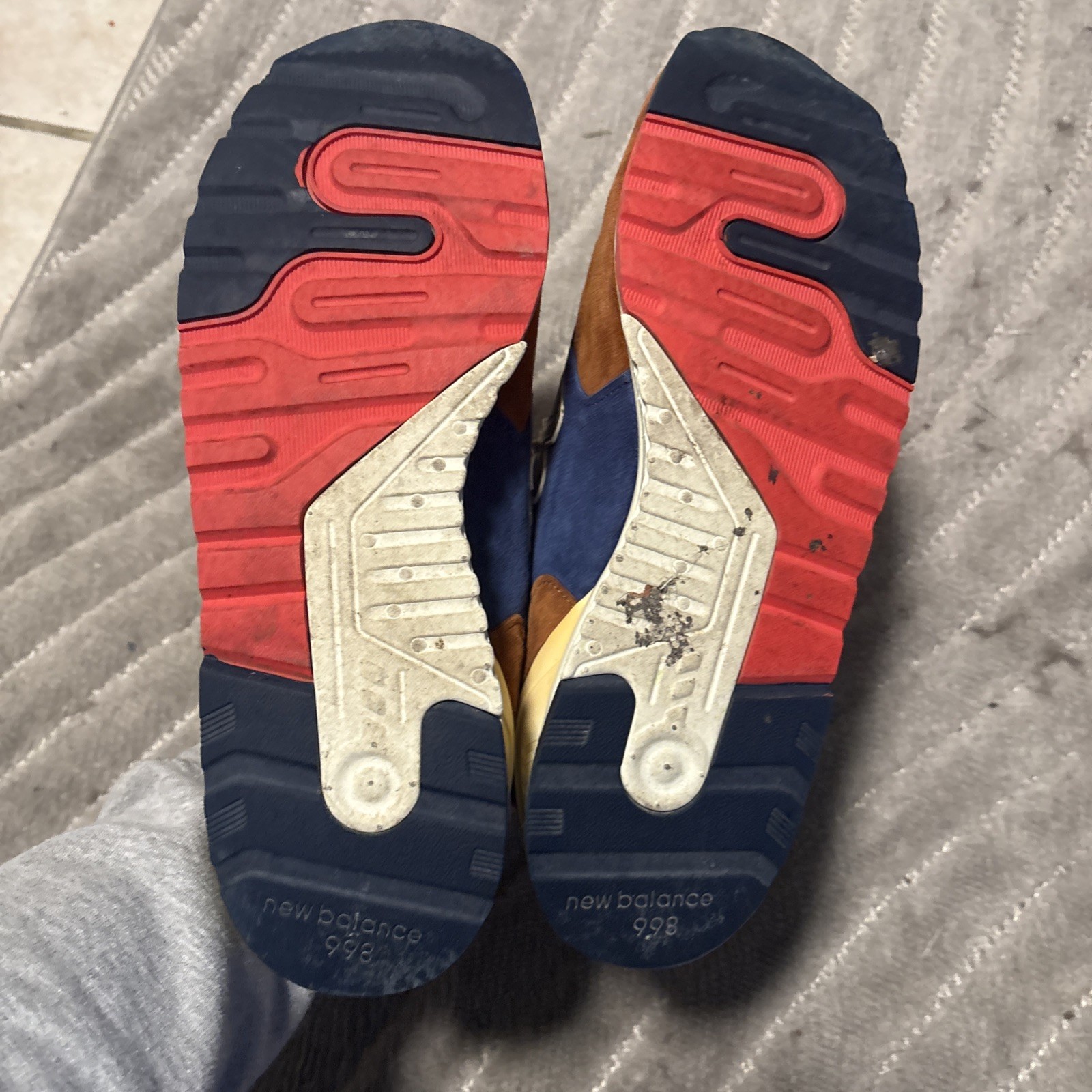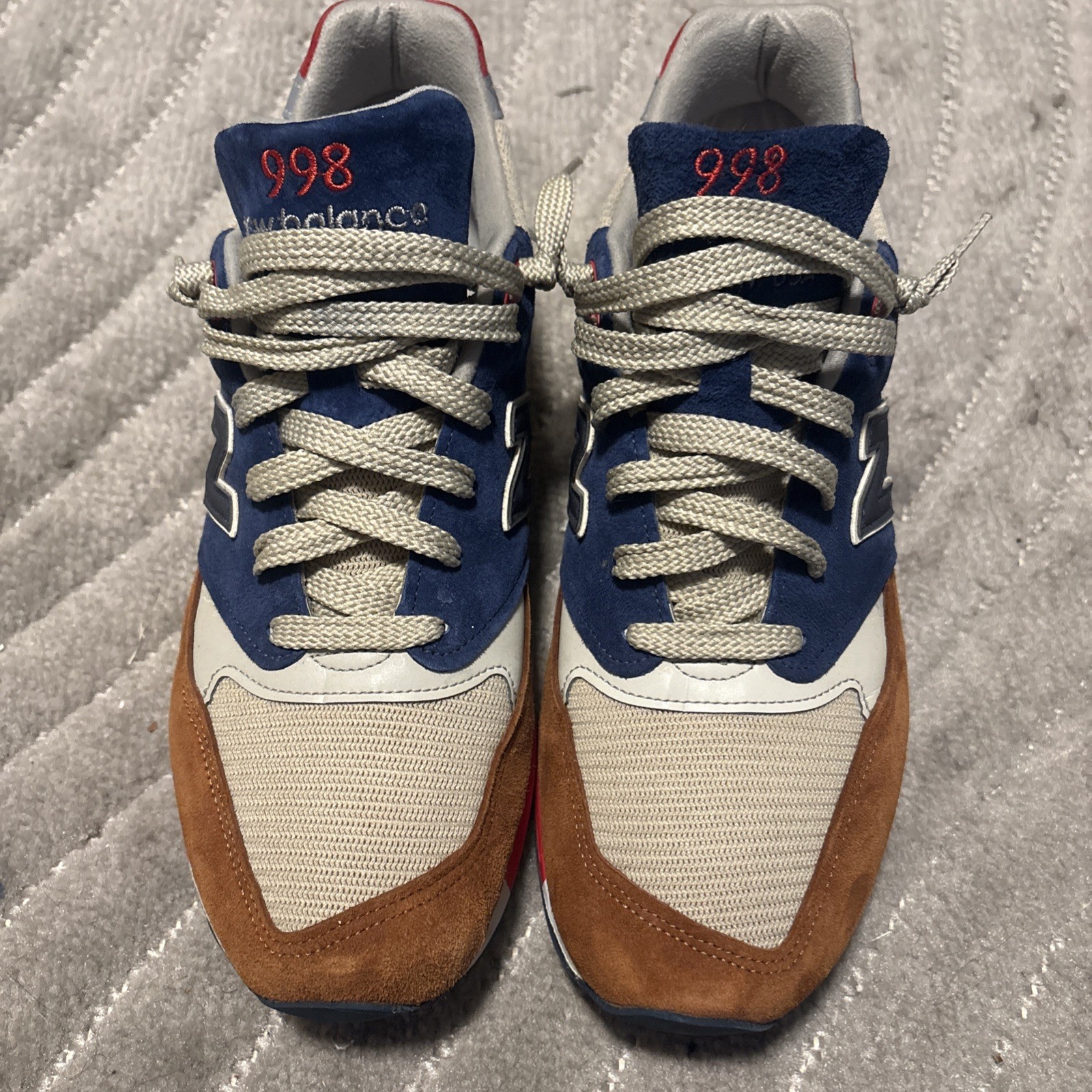 The product is a pair of New Balance 998 men's sneakers in the J.crew Hilltop Blues colorway, size 11. Made in the USA, these athletic shoes feature a brown suede upper with blue/brown accents. Part of the New Balance 998 product line, these sneakers were released in 2015 and do not come with their original box. With a classic sneaker style and comfortable design, these shoes are perfect for everyday wear or athletic activities.