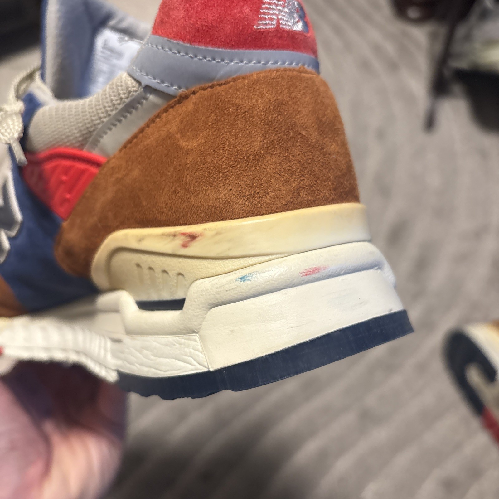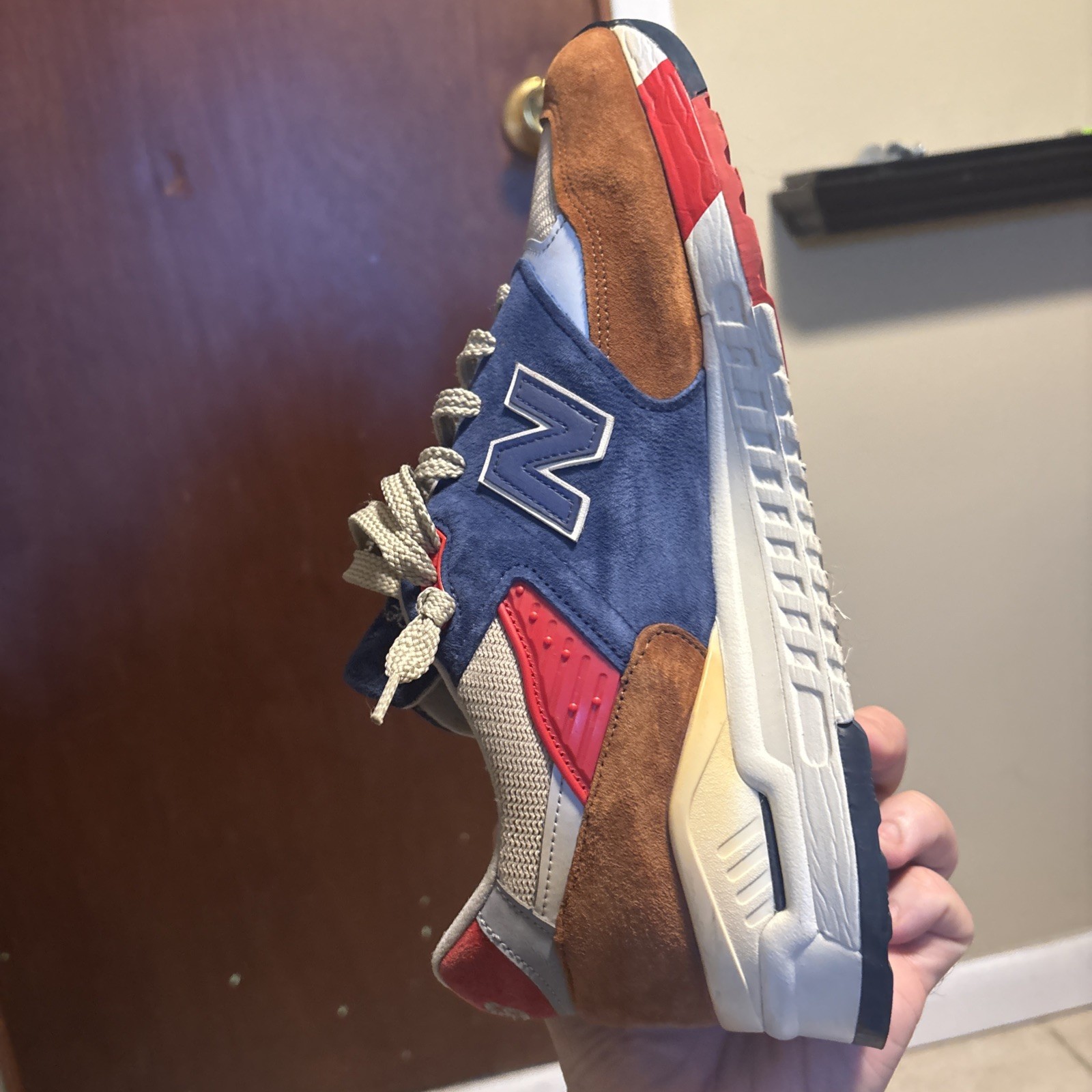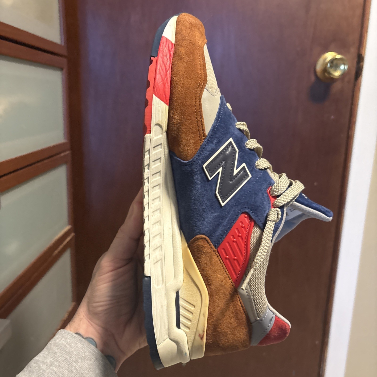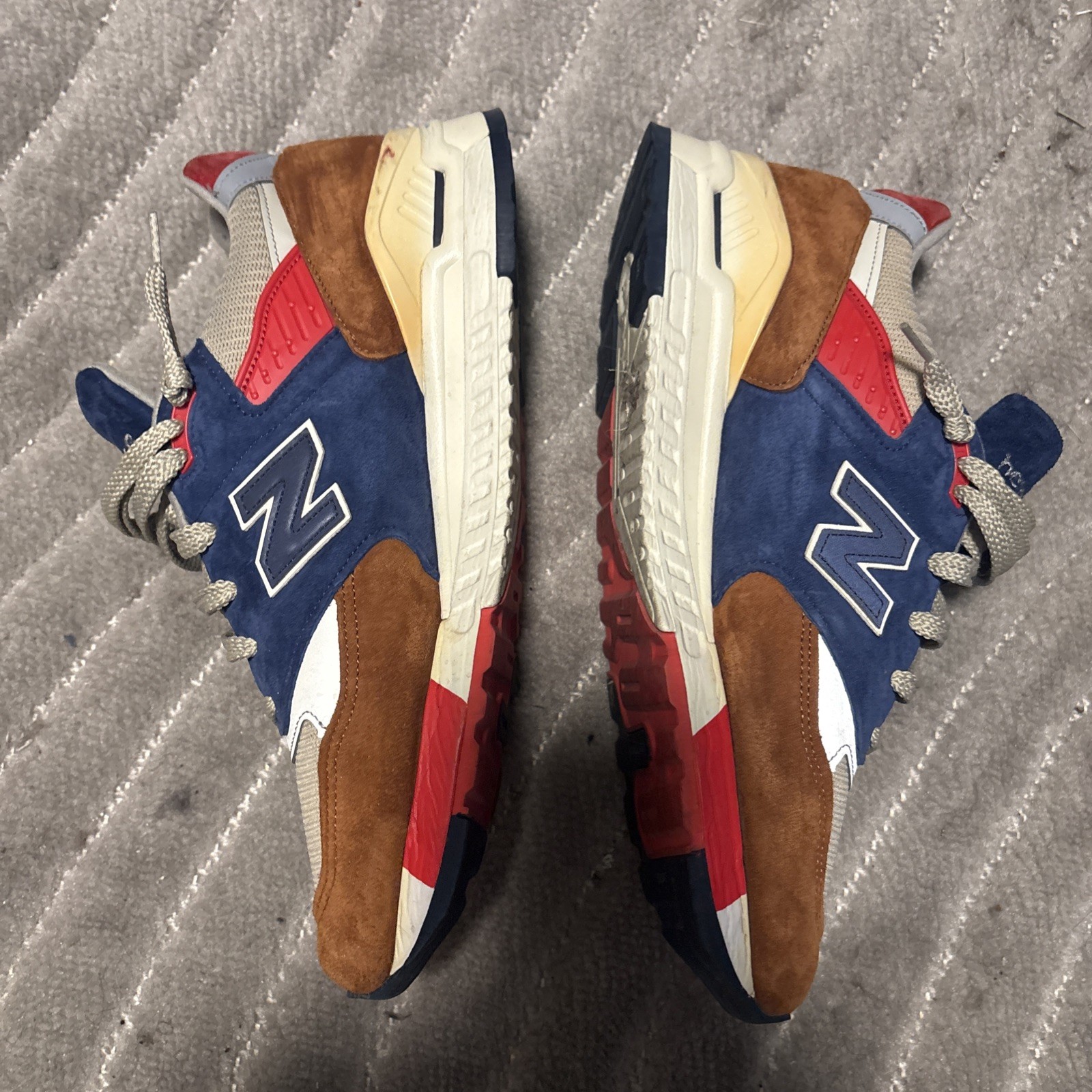 The product is a pair of New Balance 998 men's sneakers in the J.crew Hilltop Blues colorway, size 11. Made in the USA, these athletic shoes feature a brown suede upper with blue/brown accents. Part of the New Balance 998 product line, these sneakers were released in 2015 and do not come with their original box. With a classic sneaker style and comfortable design, these shoes are perfect for everyday wear or athletic activities.