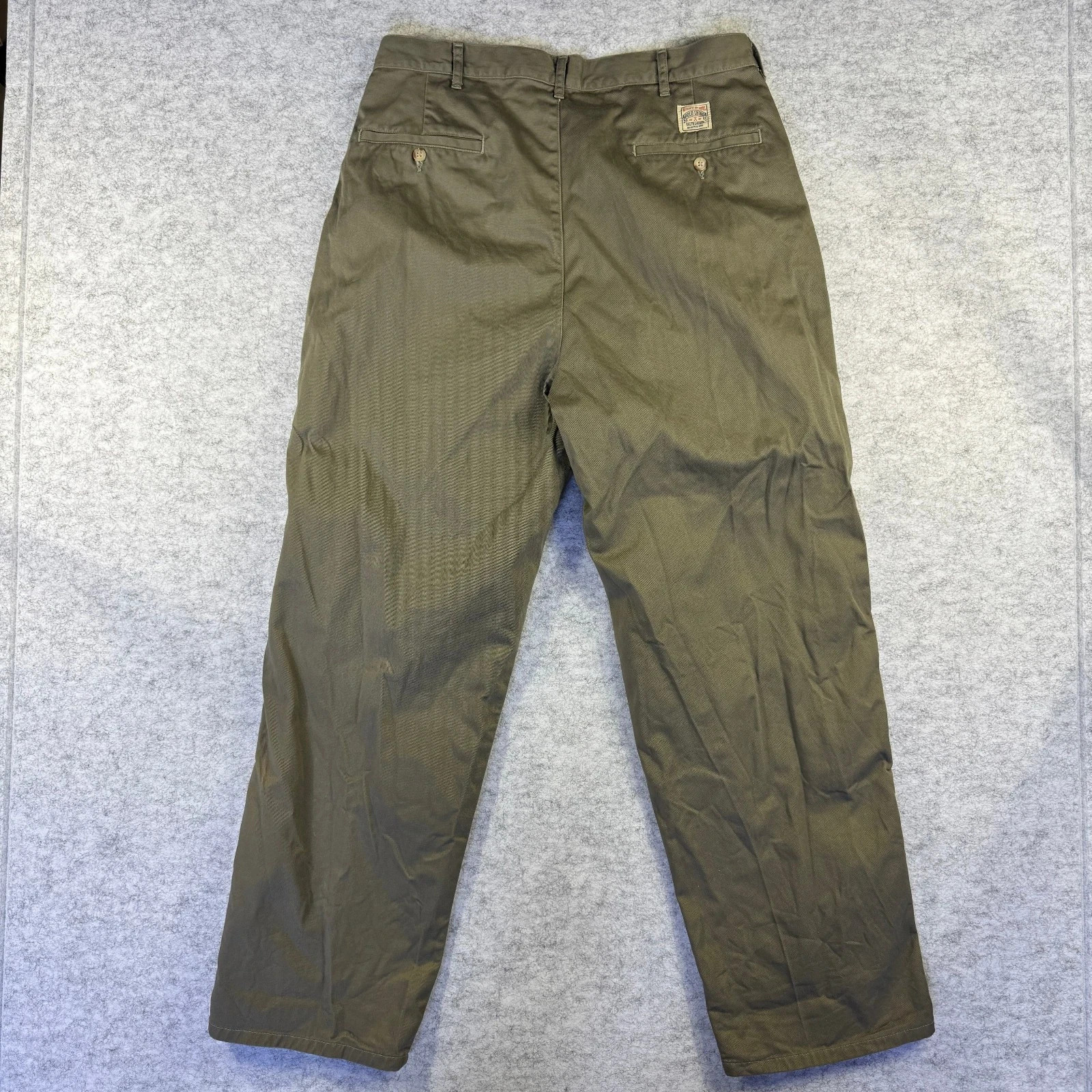 Details: - Brand: Polo by Ralph Lauren - Model / Line: Pleated Chino - Size: Tagged 34x30 - Color: Olive Green - Material: 100% Cotton - Made in: USA - Era / Season: Early-to-mid 1990s — navy serif "Polo by Ralph Lauren / Made in U.S.A." label - Construction: Double pleat front, straight leg, rear button welt pockets with Polo crest patch, belt loops, zip fly