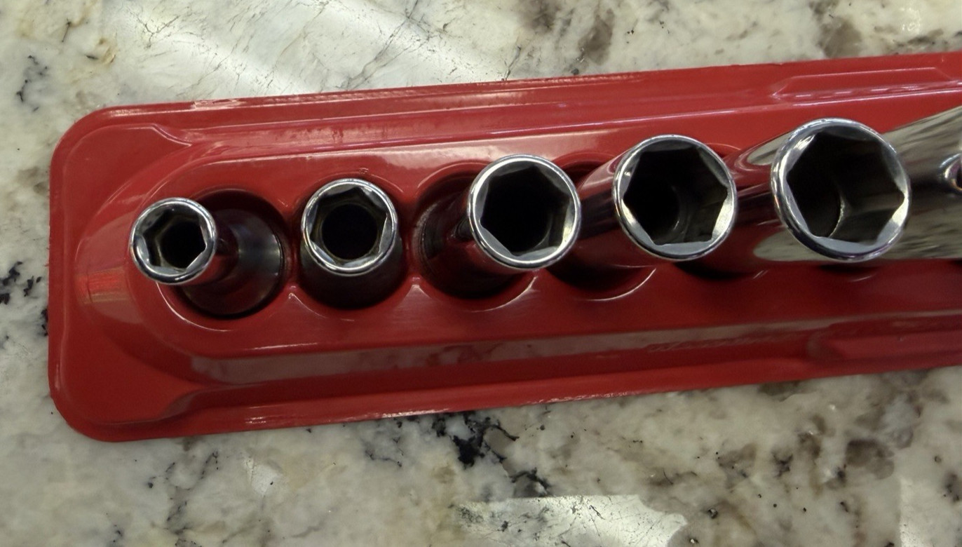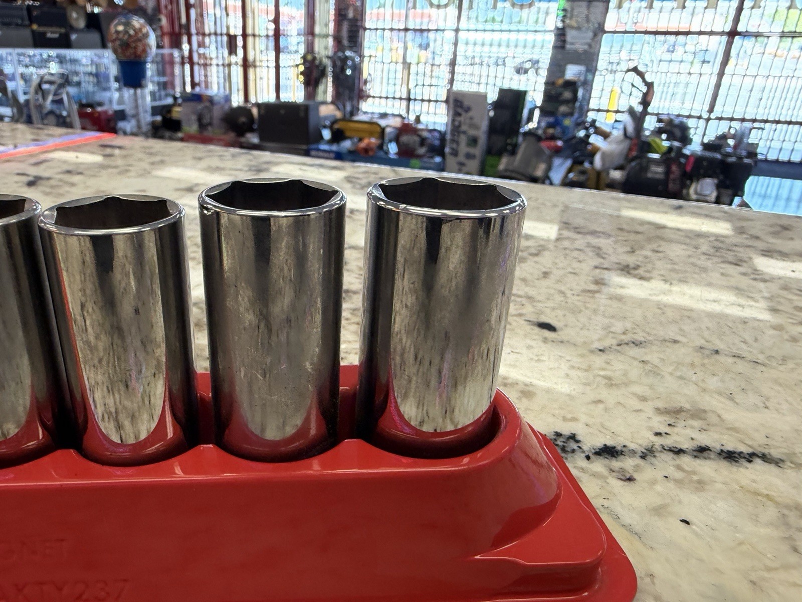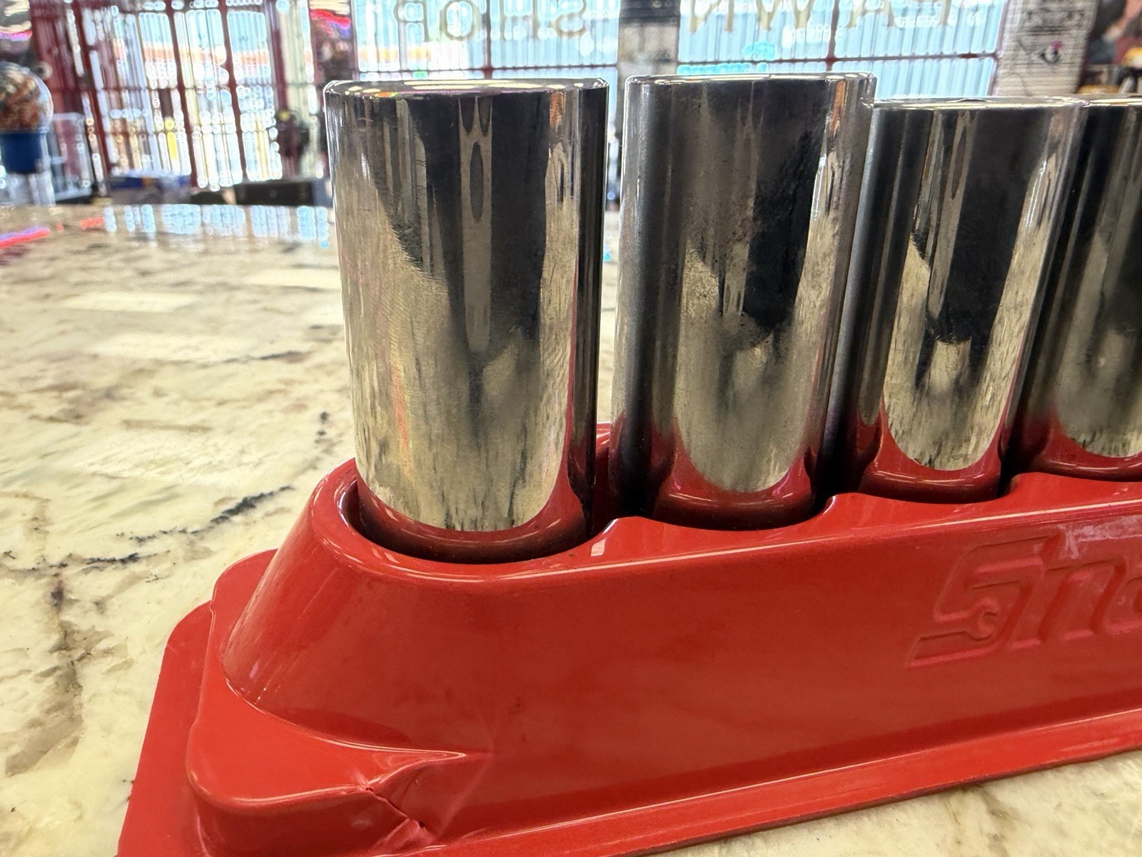 This is an 11 piece set by snap on an excellent condition as pictured. Socket that’s for the 11 piece sockets with the red magnetic plastic spray as pictured, please note the tray has a ding in the corner, but does not affect it in any way, please refer to the pictures. The sockets have no non-factory markings and are an excellent condition with this light normal wear please look at the pictures so you fully understand what you’re purchasing.