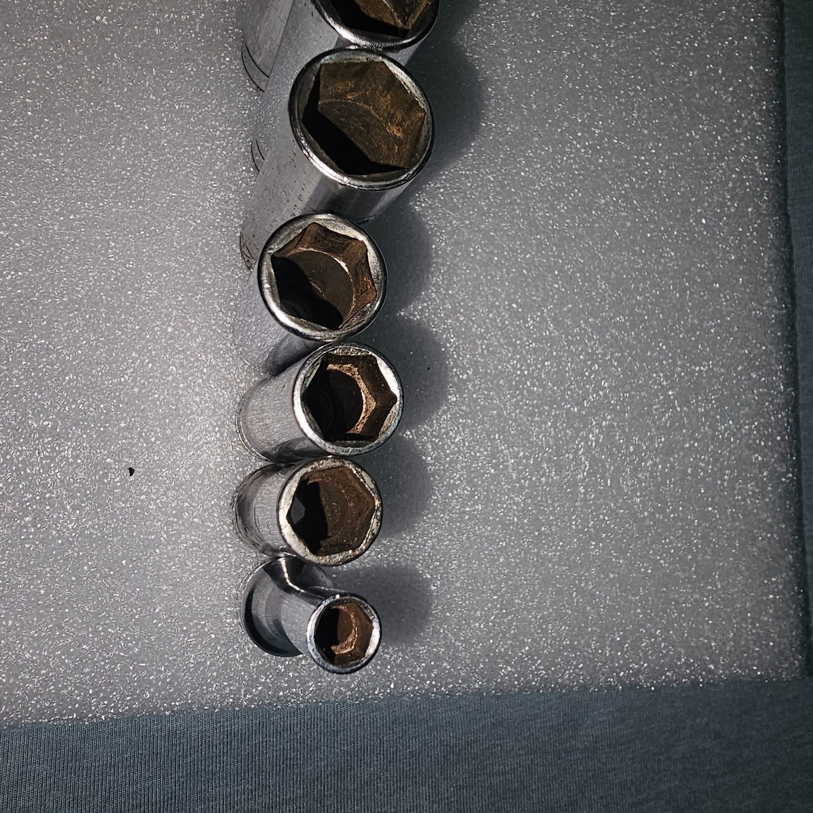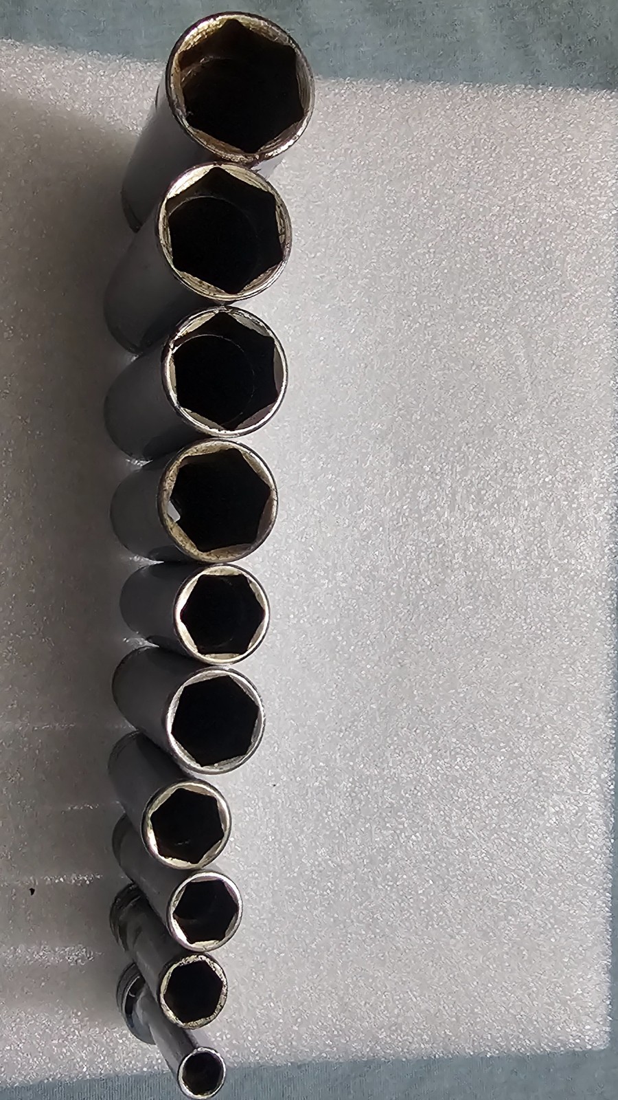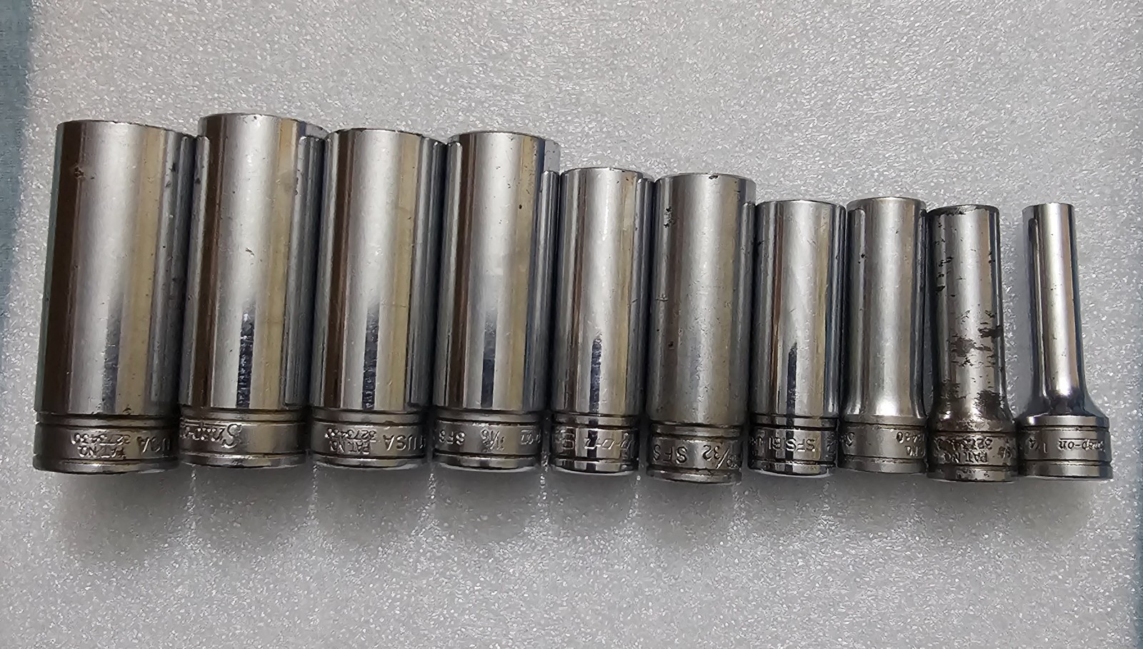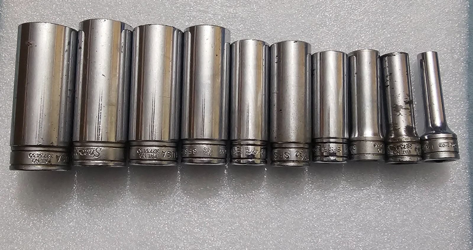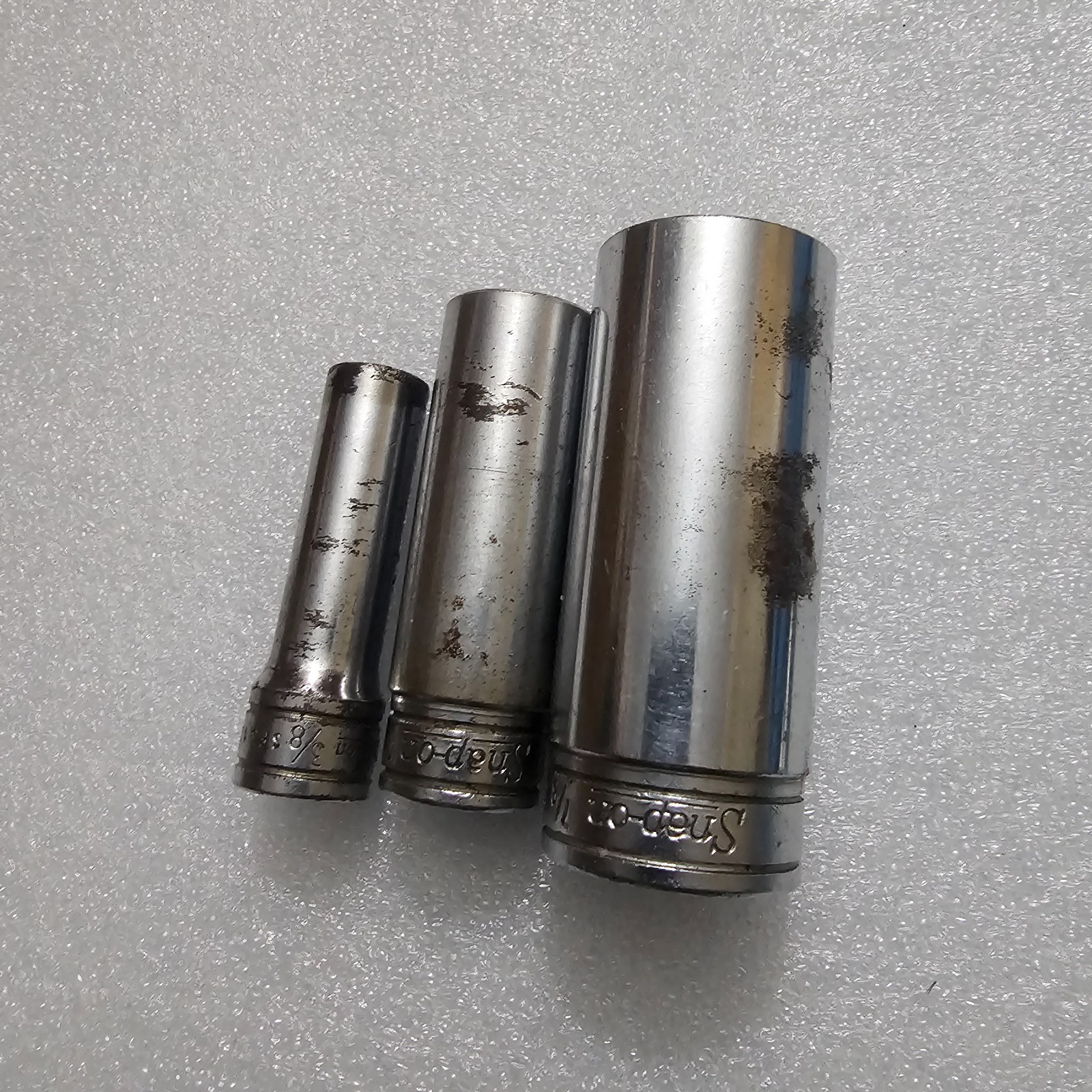 10- Snap On Deep Socket Set 6 pt. 3/8 Drive , includes the following- SFS281, SFS261, SFS241, SFS221, SFS191, SFS181, SFS161, SFS141, SFS121, SFS081, 3-of the sockets show more wear than the others, please look at the pictures for a better description, what you see is what you'll be getting thank you.