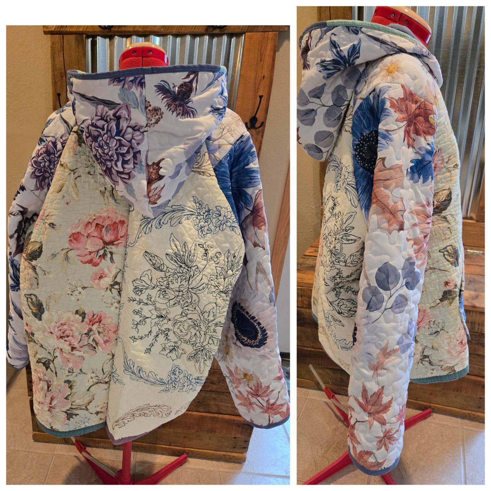 I used a new quilt & 2 gently used quilted pillow shams to make this one of a kind hoodie. Cozy...like a quilt! Padded, lined & inner seams are blanket-stitched by hand. One panel is embroidered (Last photo). size L to XL...measurements: shoulder-20", bust-54", bottom-56", shoulder to hem-29". by "Don't Throw It Out ", my own brand.