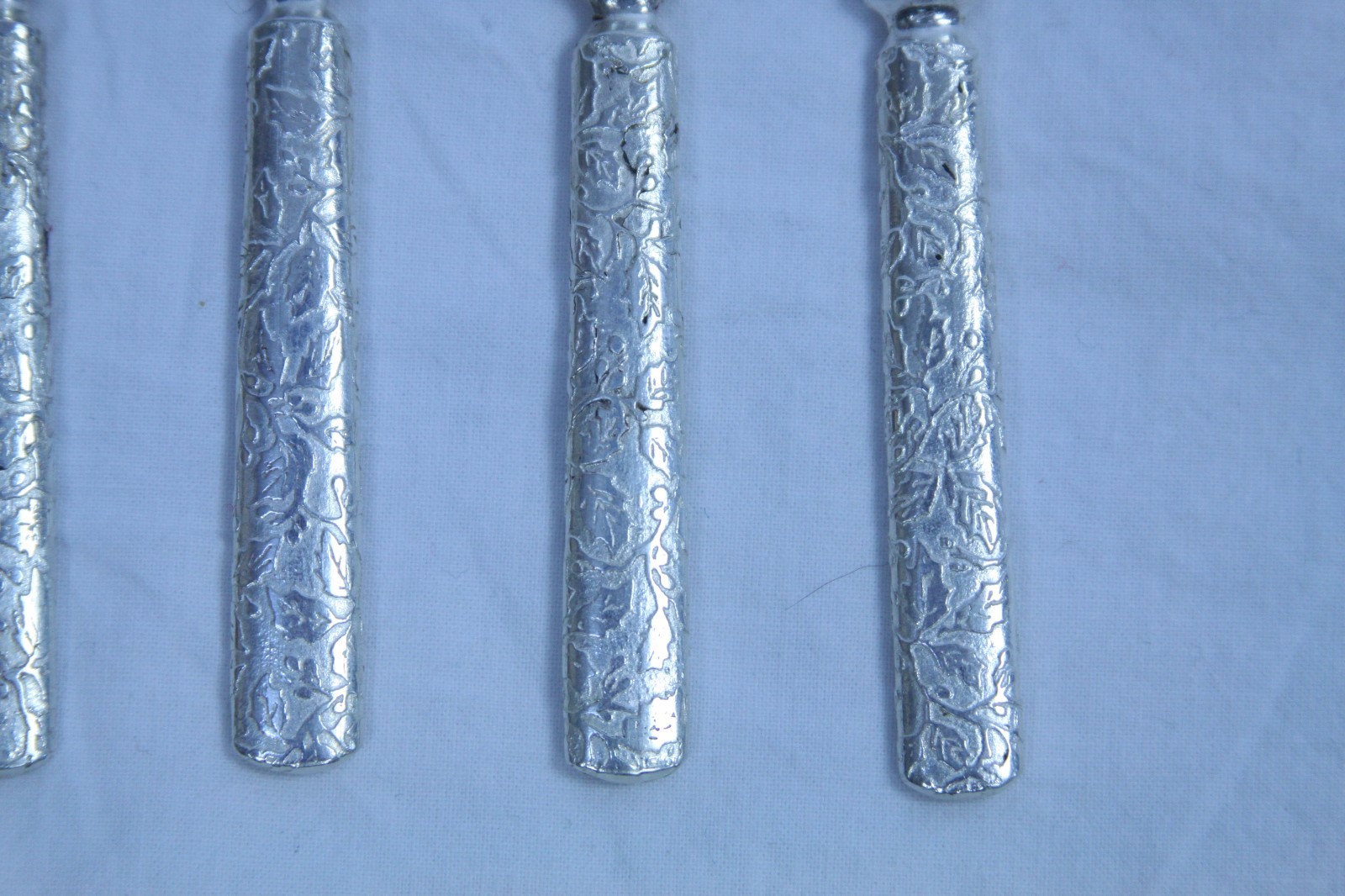 The product is a set of seven Wallace sterling fruit knives, made in the USA between 1900-1940. These knives are crafted from sterling silver, featuring a classic design that reflects the elegance and quality of antique silverware. The Wallace brand is known for producing high-quality flatware, making these knives a valuable addition to any collection of antique silver pieces.