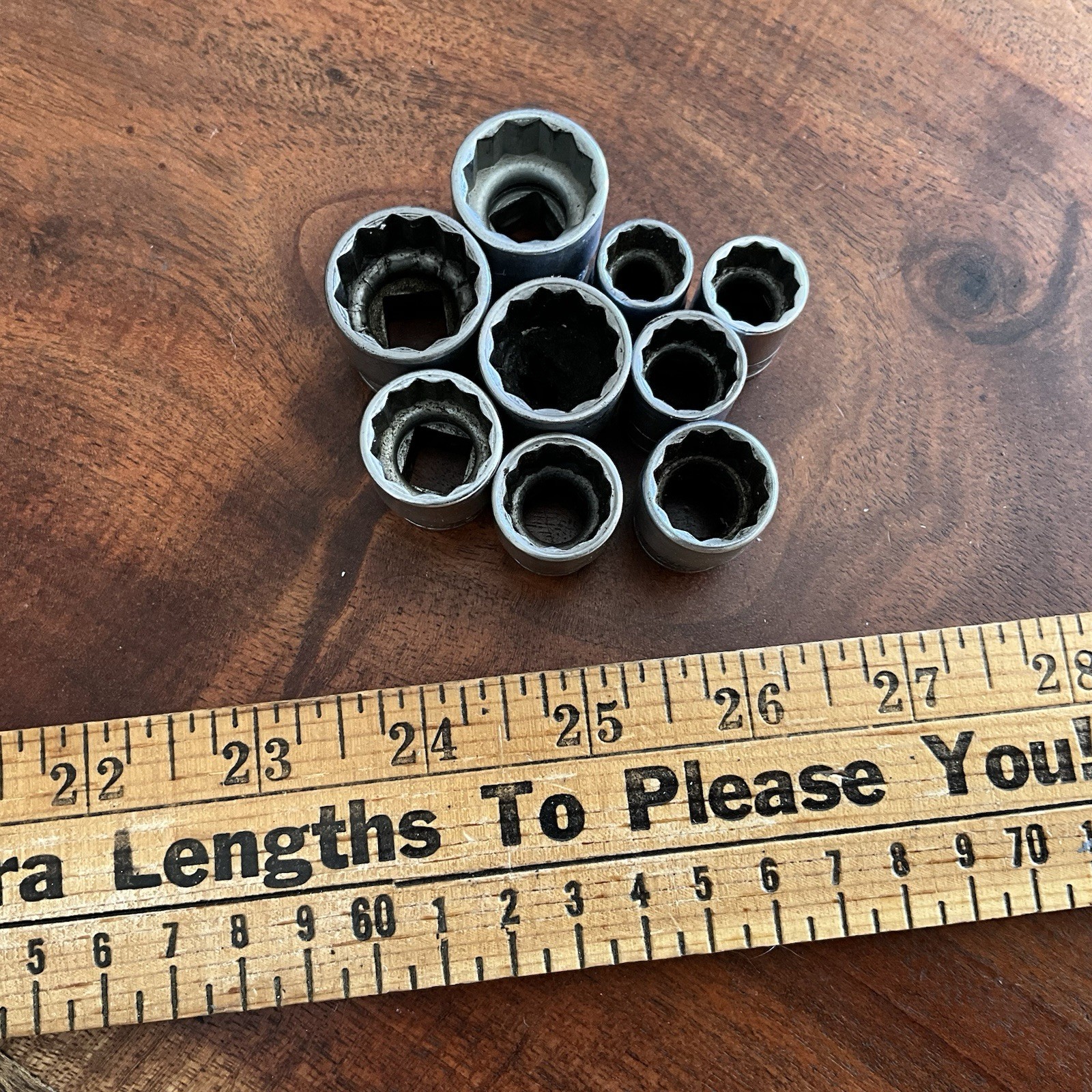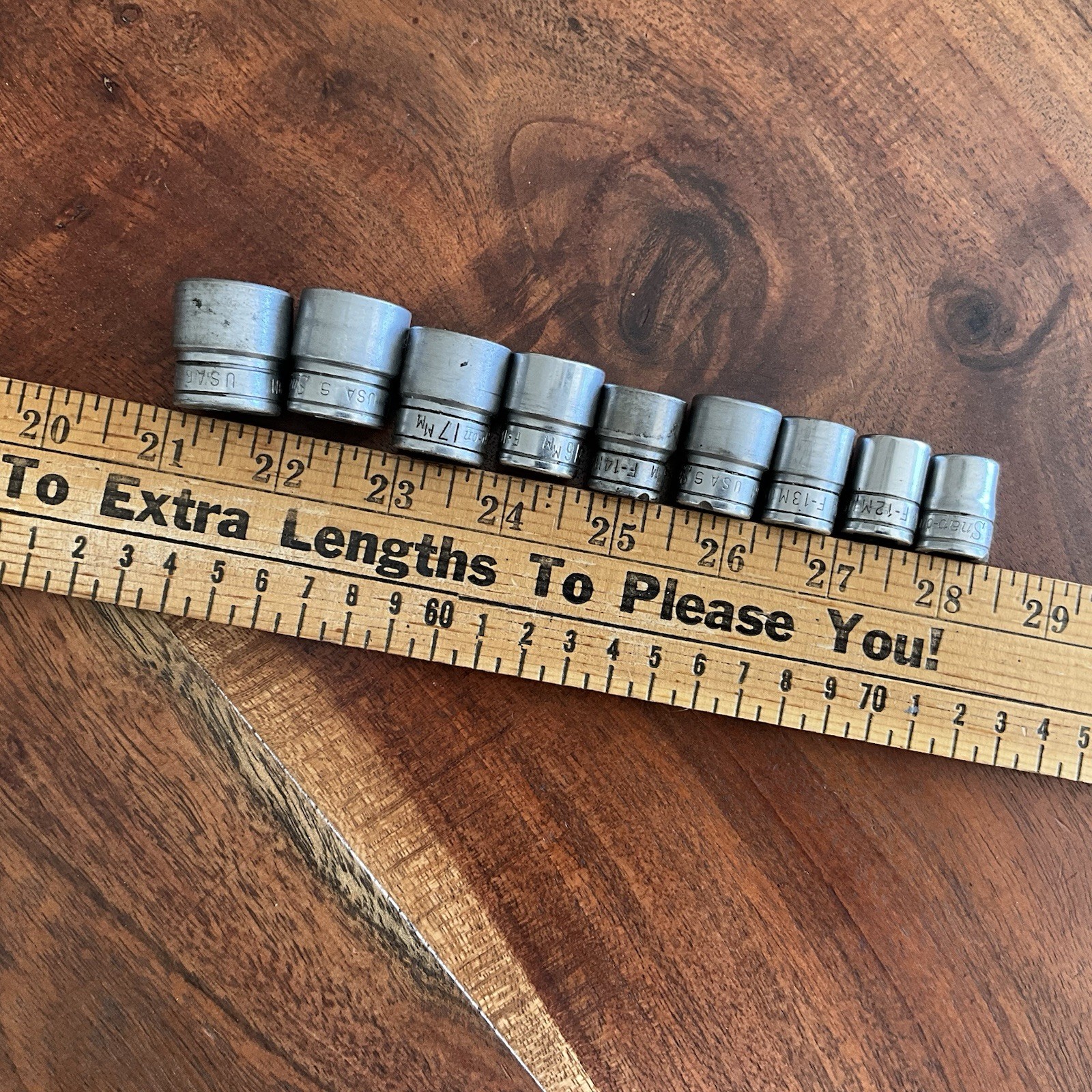This lot of 9 Snap On sockets includes sizes ranging from 11mm to 19mm, with a 3/8" drive type and 12 point design. Made in the USA, these standard chrome finish sockets are high quality and reliable. Perfect for automotive maintenance and repair tasks, this set is a valuable addition to any tool collection.