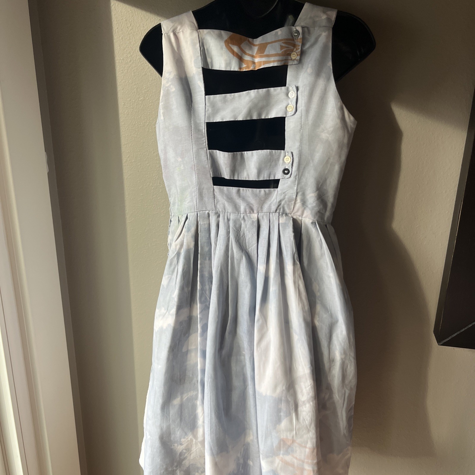 This LIZ ALIG Chic Upcycled Cotton Flour Sack Dress in light blue, pink, and green tie dye is a handmade, sleeveless dress with a button closure and pleats accents. Made from cotton, this fit & flare style dress is designed in a short length and does not have a size tag so please check measurements. Perfect for women looking for a unique and colorful addition to their wardrobe, this upcycled dress combines style and sustainability in a vibrant and eye-catching design.