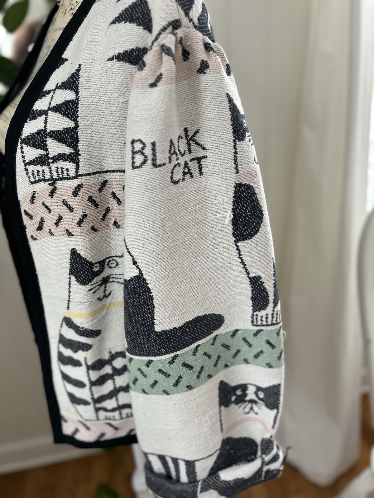 This OOAK Upcycled VTG Tapestry Blanket Coat Jacket is a unique and whimsical piece perfect for cat lovers and those who appreciate handmade, sustainable fashion. Made from cotton with a black color, this short coatigan features a cat mouse pattern, long sleeves, and a tie closure. The fringe detailing adds an artsy touch, making it a statement piece for those embracing indie boho, grannycore, or cottagecore styles. Machine washable and made in the United States, this one-of-a-kind garment offers a regular fit in size L/XL. This has visible snags and some slight blemishes- the sleeves are extra long so you’ll have to roll them up. Unlined. Selling as is. New binding along edges. Measures: 18.5” between shoulders 22” pit to pit in back 24” long in back from shoulder seam Sleeves 28.5” unrolled.