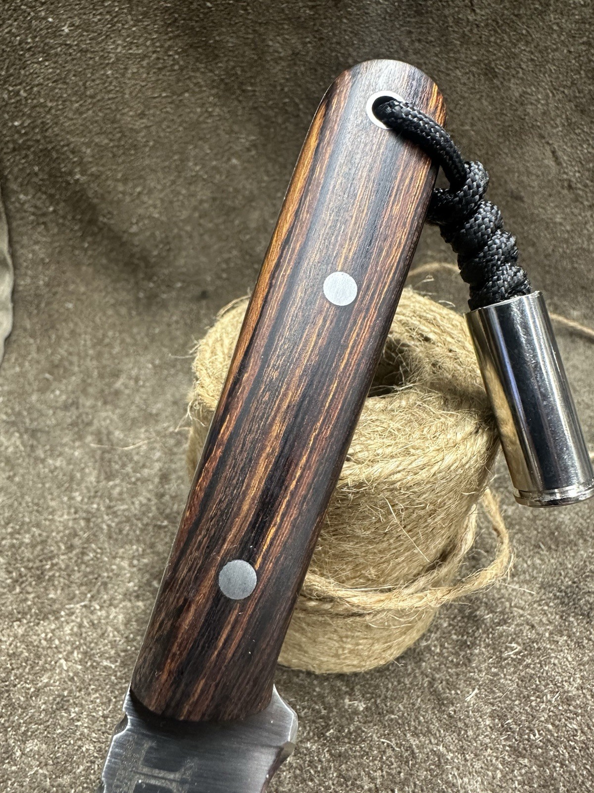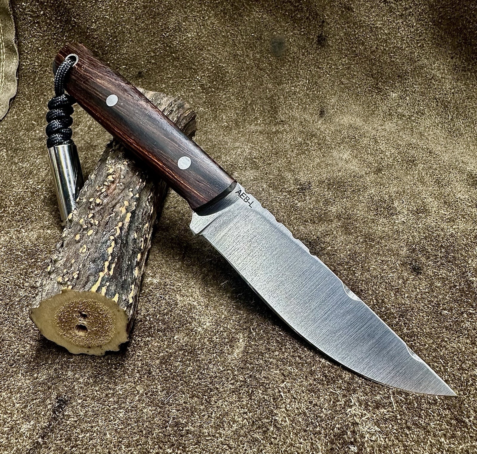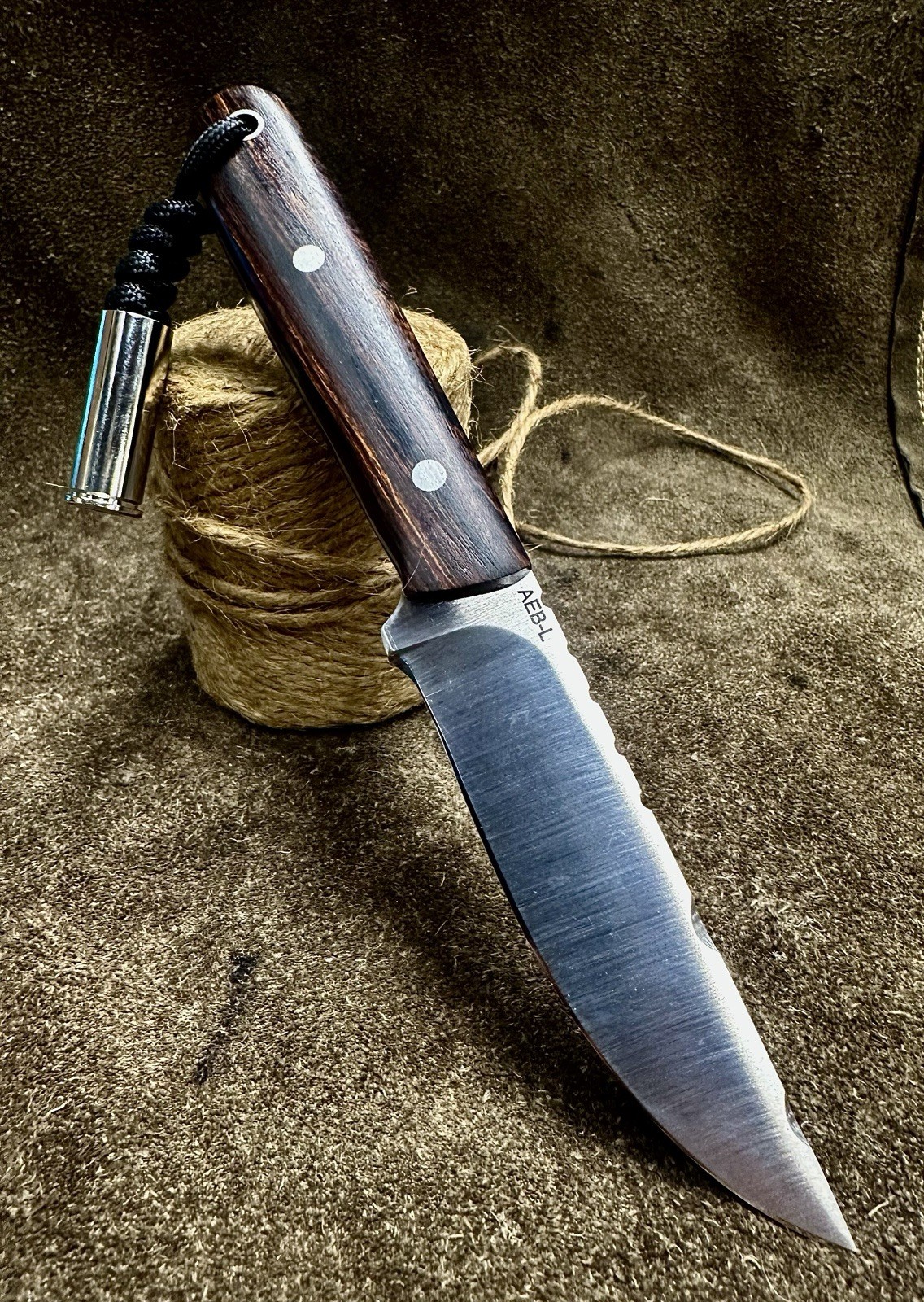 1/8” Aeb-L stainless steel with ironwood handles. Heat treated,cryo treated and tempered to a Rockwell hardness of 58-60. Leather sheath included. Handmade by the seller in south east Kentucky.