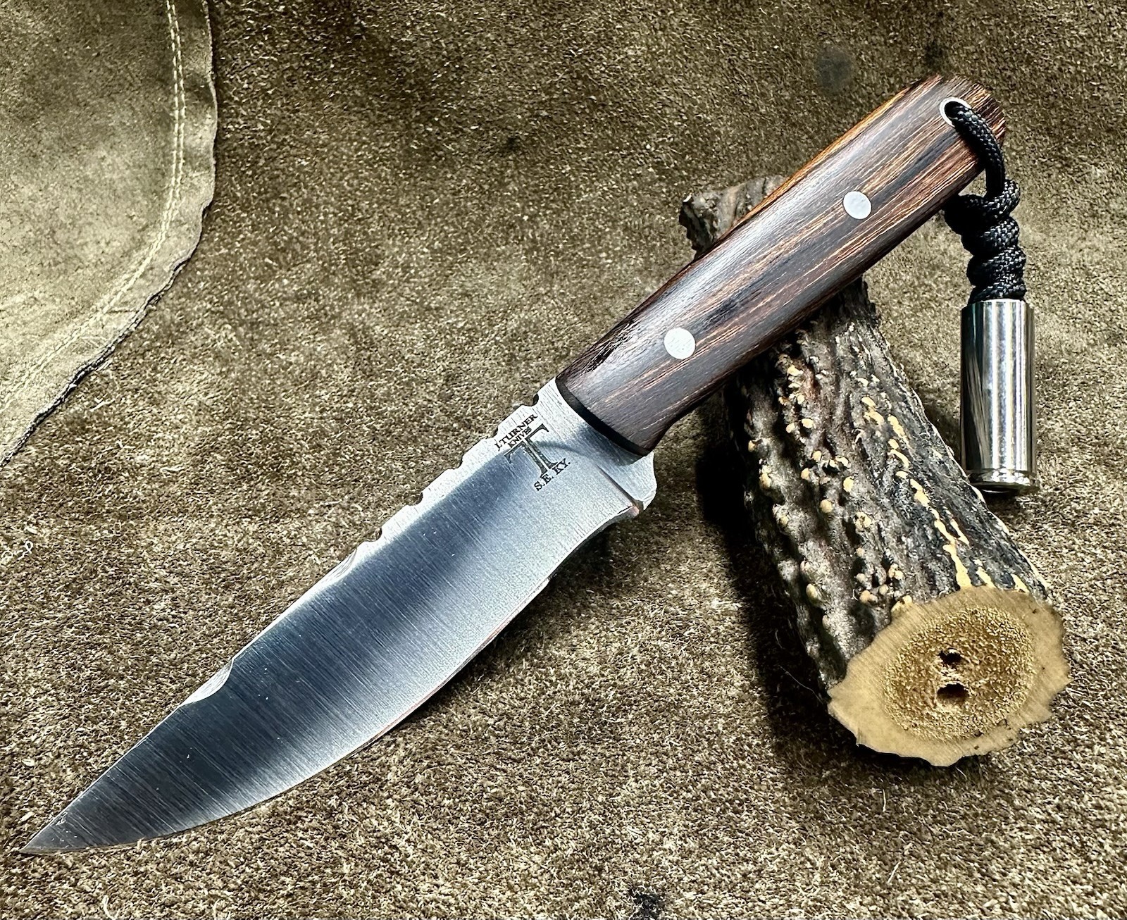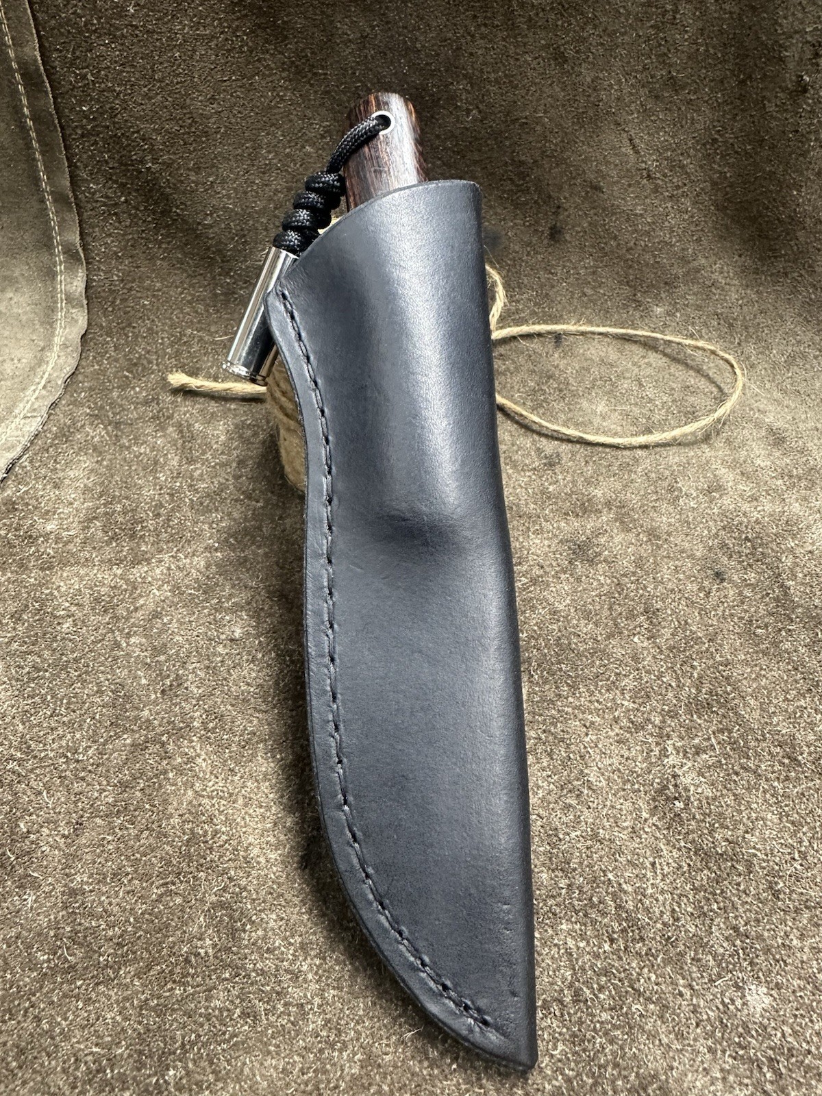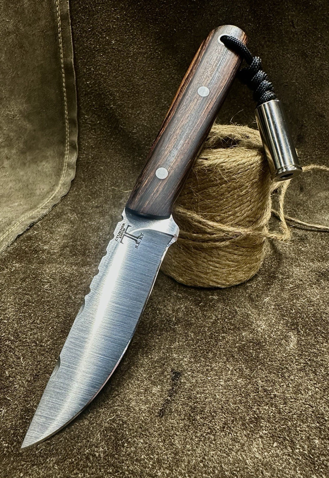 1/8” Aeb-L stainless steel with ironwood handles. Heat treated,cryo treated and tempered to a Rockwell hardness of 58-60. Leather sheath included. Handmade by the seller in south east Kentucky.