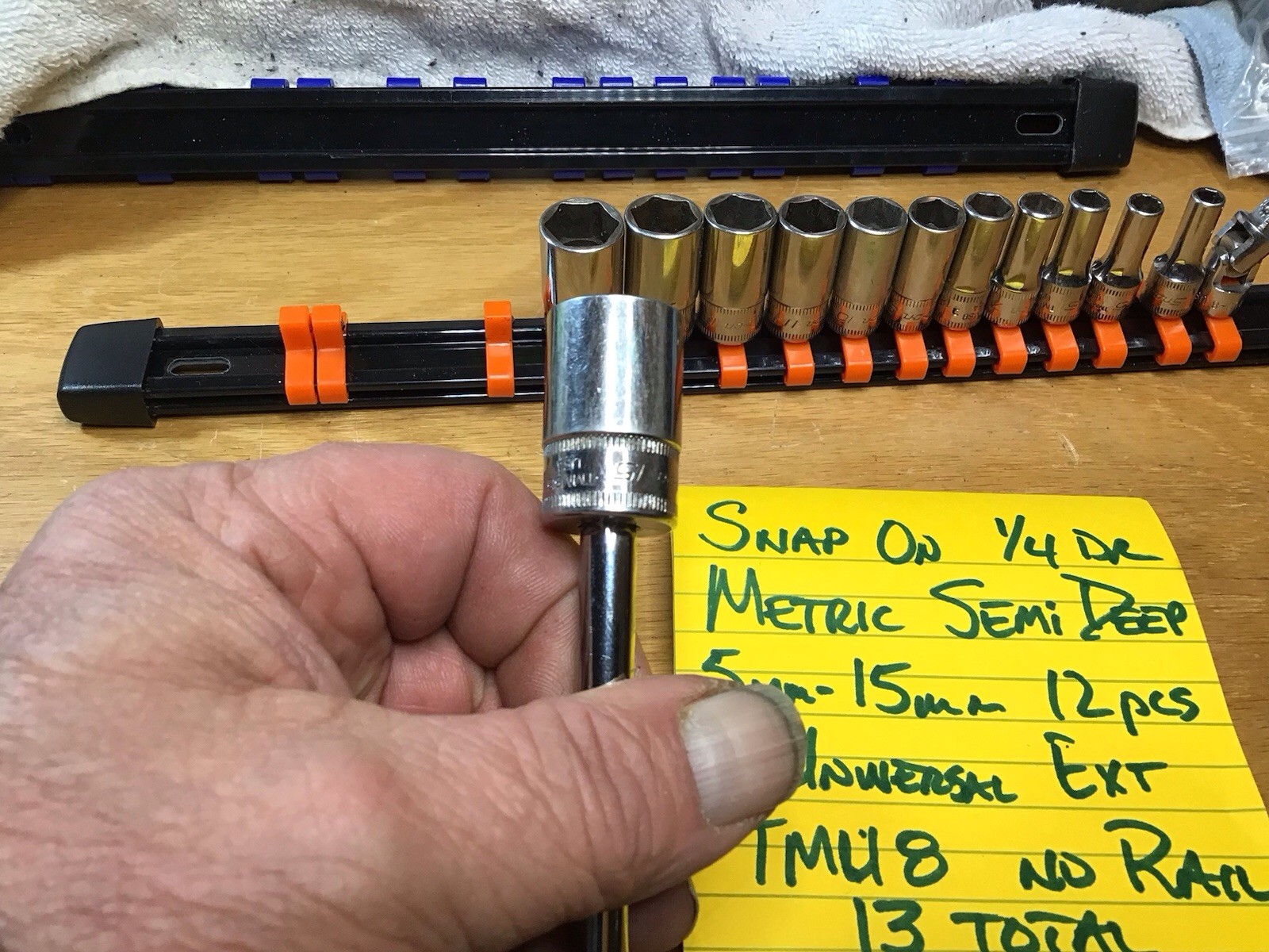 Snap On Tools 1/4 Dr Metric Semi-Deep 6 Pt. Set includes a variety of socket sizes ranging from 5mm to 15mm, + Bonus Snap-on TMU8 1/4” Dr. universal swivel extension for a total of 13 pcs (see pictures for condition of items VGC) making it a versatile addition to any automotive tool collection. This set the "Rail Not Included" the trusted Snap-on brand, high-quality standard socket type, and inclusion of universal/swivel extension, this set is a valuable investment for any mechanic or automotive enthusiast. I offer a combined shipping rate on multiple items purchased at the same time, I offer FREE shipping on items selling price that total $150.00 or more (tax or shipping fees not applicable). Any questions please email me, check out my other listing and always adding new items