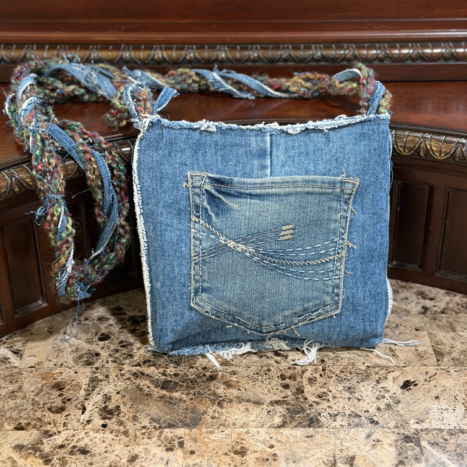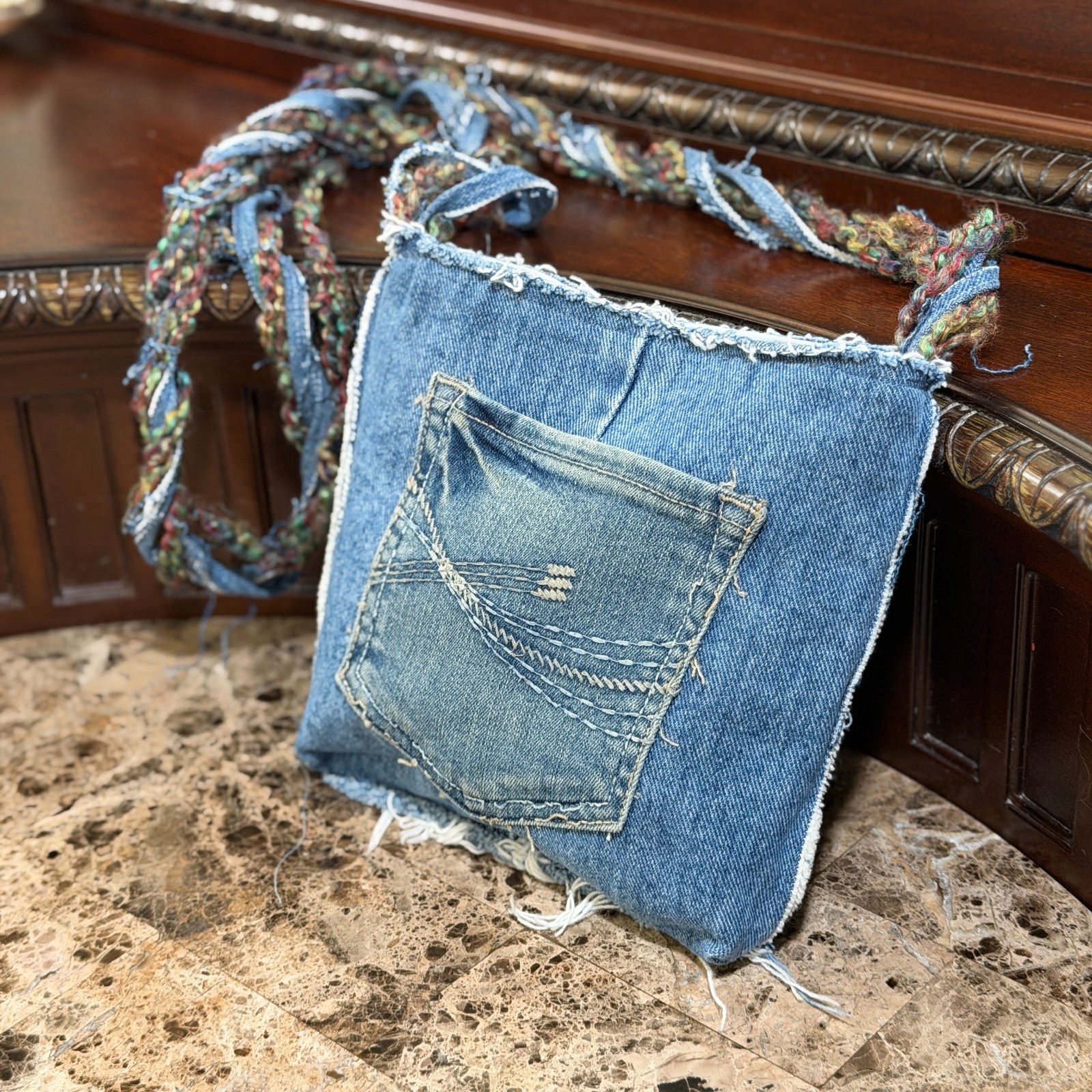 One-of-a-kind upcycled denim crossbody bag made from a mix of denim textures for a unique, eye-catching look 💙♻️