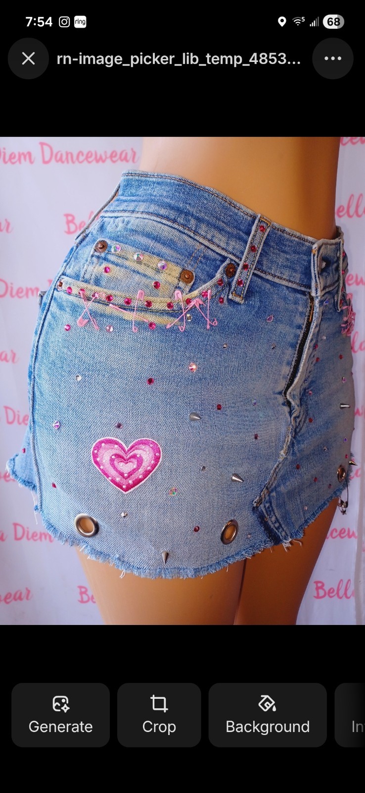 Made With levi's jeans turned into a mini skirt with rhinestone and studded embellishment along with patches,