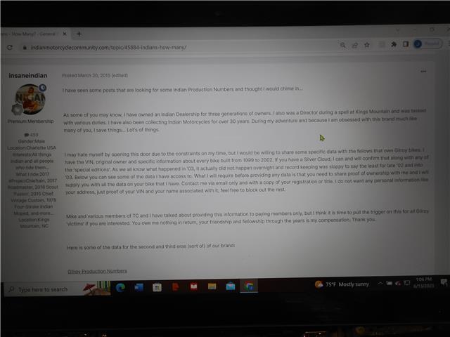 $11,950.00 NEW EBAY PRICE $9950.00 ONLY 3,278 TOTAL 2002 GILROY INDIANS WERE BUILT , ONLY THE CHIEF MODELS GOT THE 100 CU POWERPLUS , VERY RARE AND COLLECTABLE ,THIS 2002 GILROY INDIAN CHIEF DELUXE HAS THE 100 CU POWER PLUS WITH 6,152 ACTUAL MILES , CLEAR ARIZONA TITLE , THE BIKE HAS THE BLACKHAWK MOTOR WORKS ENGINE #089602 BX , UPGRADED CASES , UPGRADED CRANK BEARING AND UPGRADED HIGH FLOW OIL PUMP , THIS MAKES THE POWER PLUS ENGINE BULLET PROOF ! 2 FACTORY INDIAN KEYS , 5 SPEED , 42MM MIKUNI ,FACTORY HIGH FLOW BREATHER , 2 INTO ONE EXHAUST , RM RACING CDI , 2002 MSRP $21,795.00 , EXCEPTIONAL FACTORY 2 TONE BLACK AND MAROON METALLIC PAINT , SMALL SCRATCHES AROUND SEAT SCREW AND FRONT FENDER , EXCELLENT ENGINE BLACK FINISH AND POWDER COAT , LIGHT FADING ON PRIMARY , CHROME CONTROLS AND FRONT ASSEMBLY , FACTORY INDIAN WINDSHIELD , FACTORY INDIAN BAGS , FACTORY INDIAN 2 UP SEAT , CHROME SPOKE RIMS , WHITE WALL TIRES , FRONT TIRE TREAD 70% , REAR TIRE TREAD 50% , RUNS AND DRIVES LIKE A TRUE CLASSIC POWER PLUS INDIAN CHIEF , READY TO RIDE , NEW RENEGADE BATTERY AND HIGH TORQUE STARTER JUST INSTALLED 8/2025 , A EBAY SHIPPING LINK FOR USHIP IS INCLUDED IN ALL MY EBAY LISTINGS , OTHER SHIPPING OPTIONS ARE AVAILABLE , EBAY PAYMENT IS ACCEPTED FOR DEPOSIT ONLY , SEE LISTING FOR FINAL PAYMENT METHODS , DEPOSITS ARE NON REFUNDABLE DUE TO LISTING AND SELLING FEES , NO HIDDEN DOCUMENT OR STORAGE FEES ,FREE STORAGE ON FULLY PAID BIKES , CONTACT JOHN T HUNTER MOTOR SALES NY STATE BONDED DEALER ESTABLISHED 1981 (42 YEAR ANNIVERSARY) CELEBRATING 22 YEARS ON EBAY 518 395 -9884 OR USE EBAY EMAIL FOR INFORMATION