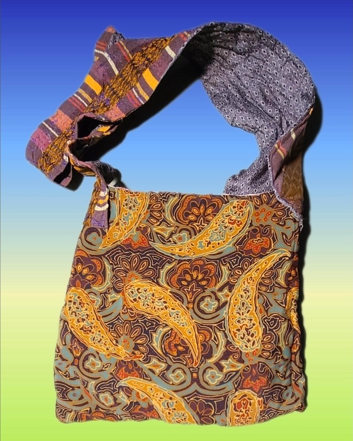 Reclaimed fabric tote bag, long crossbody strap to accommodate plus sizes, one of a kind, strap can be shortened by tying for shorter people or to wear as a shoulder bag, wide strap for comfort, reversible, made by Canadian designer Larissa Myrie. All of these tote bags are one of a kind and made with new, used, repurposed, reclaimed and scrap material. All bags are machine washed and dried after created.