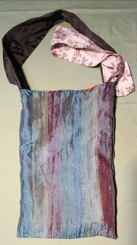 Reclaimed fabric tote bag, long crossbody strap to accommodate plus sizes, one of a kind, strap can be shortened by tying for shorter people or to wear as a shoulder bag, wide strap for comfort, reversible, made by Canadian designer Larissa Myrie. All of these tote bags are one of a kind and made with new, used, repurposed, reclaimed and scrap material. All bags are machine washed and dried after created.
