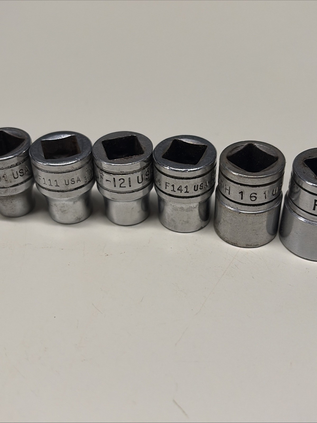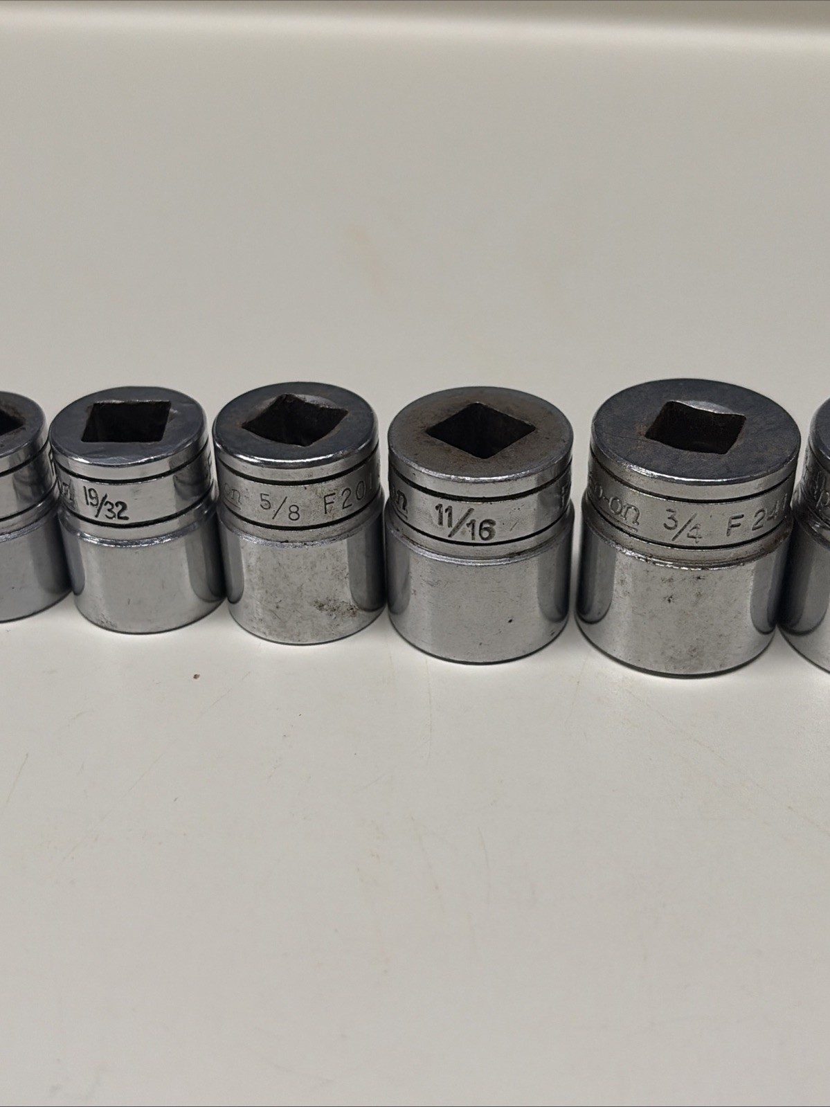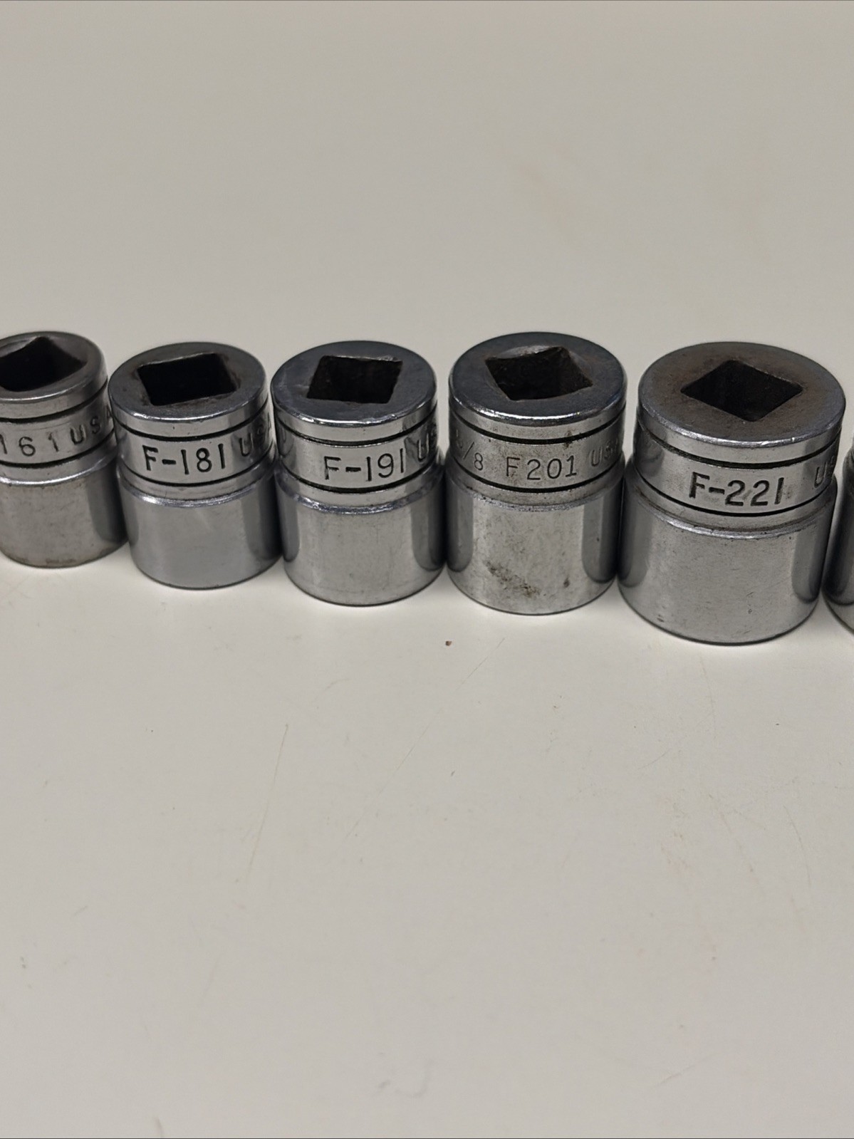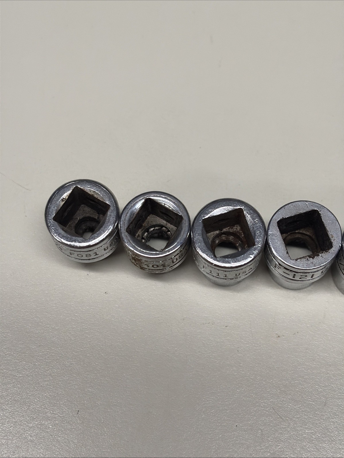 Some of these have slightly different fonts appearing to be from different original sets, but all are the same âFâ series 3/8â drive 12 point sockets.