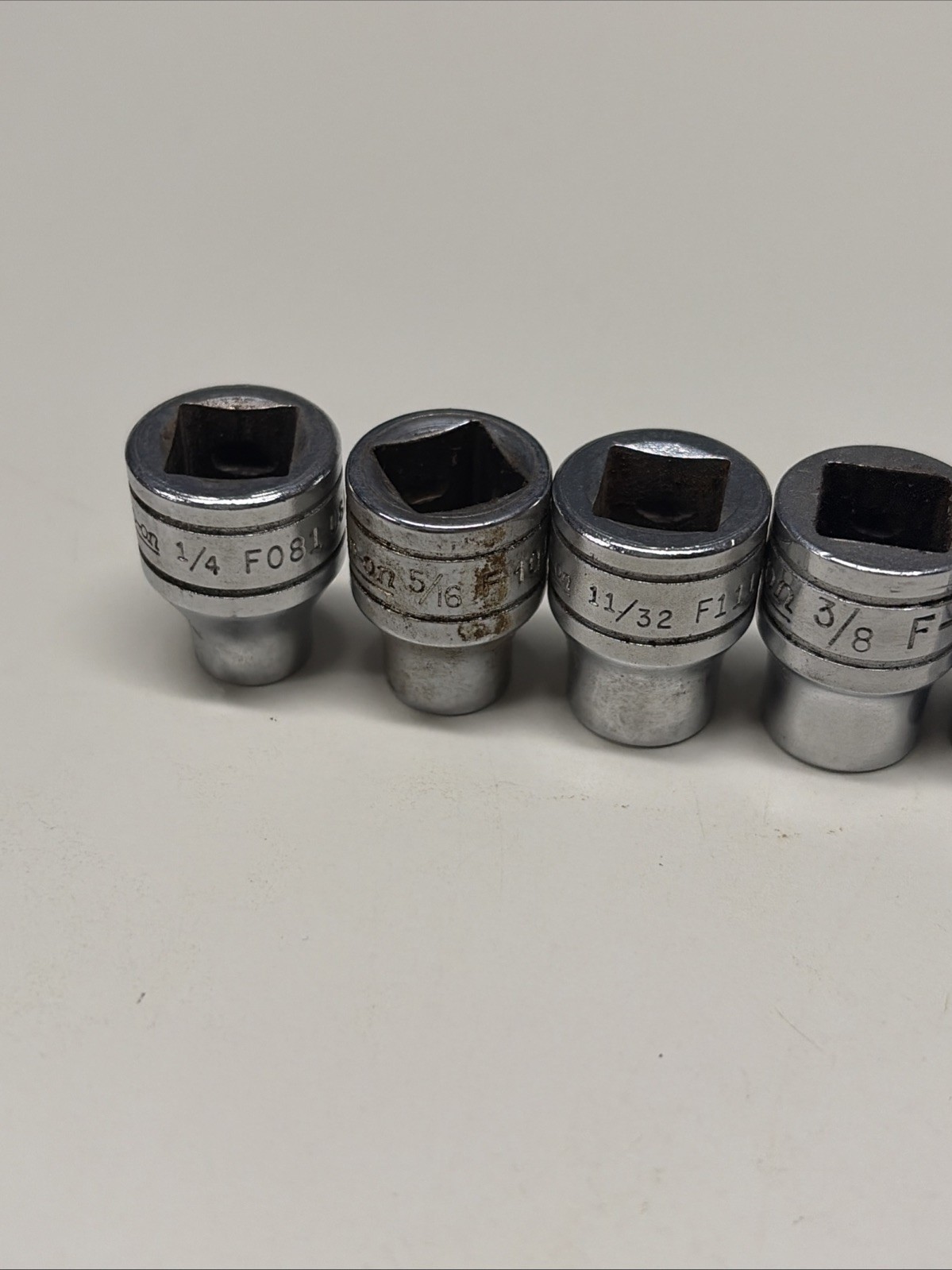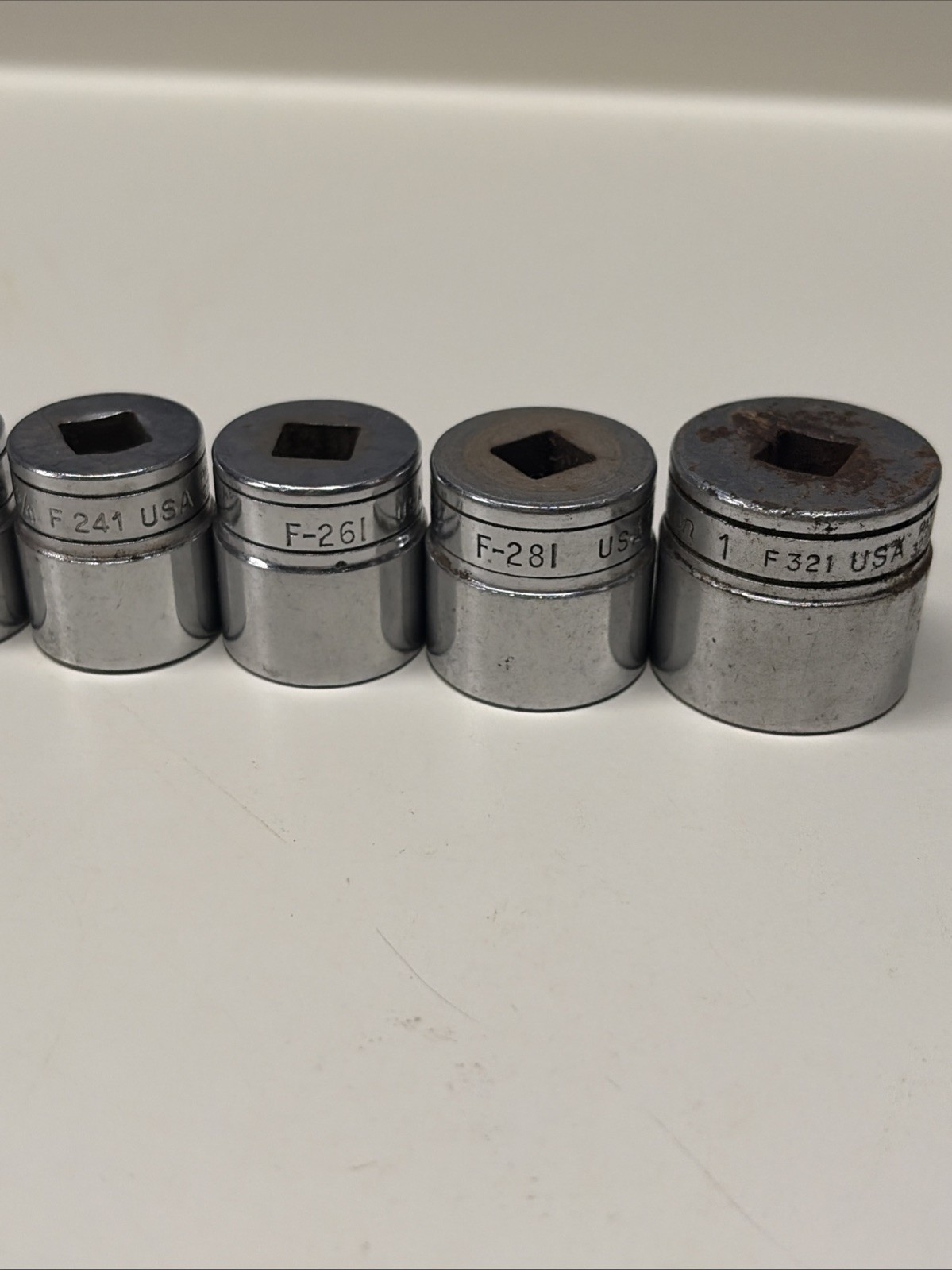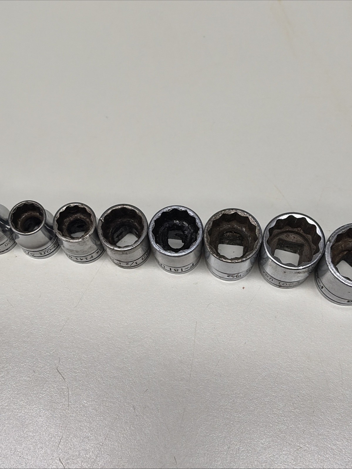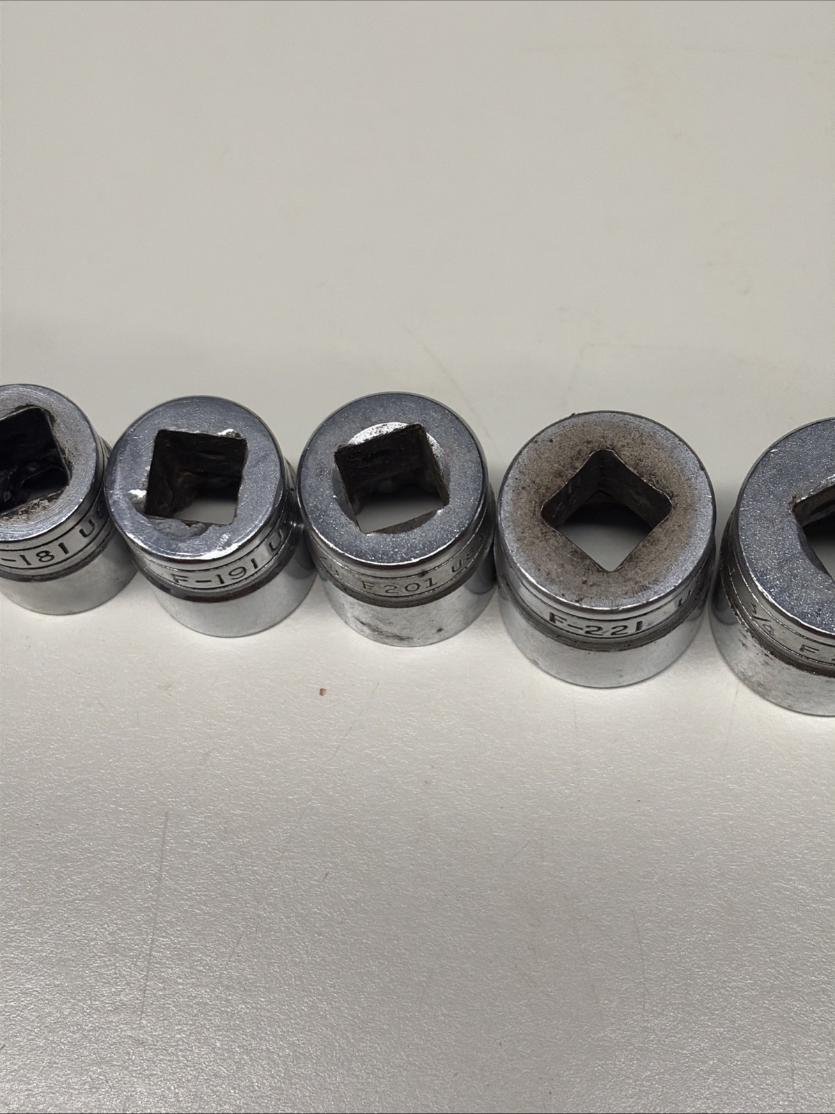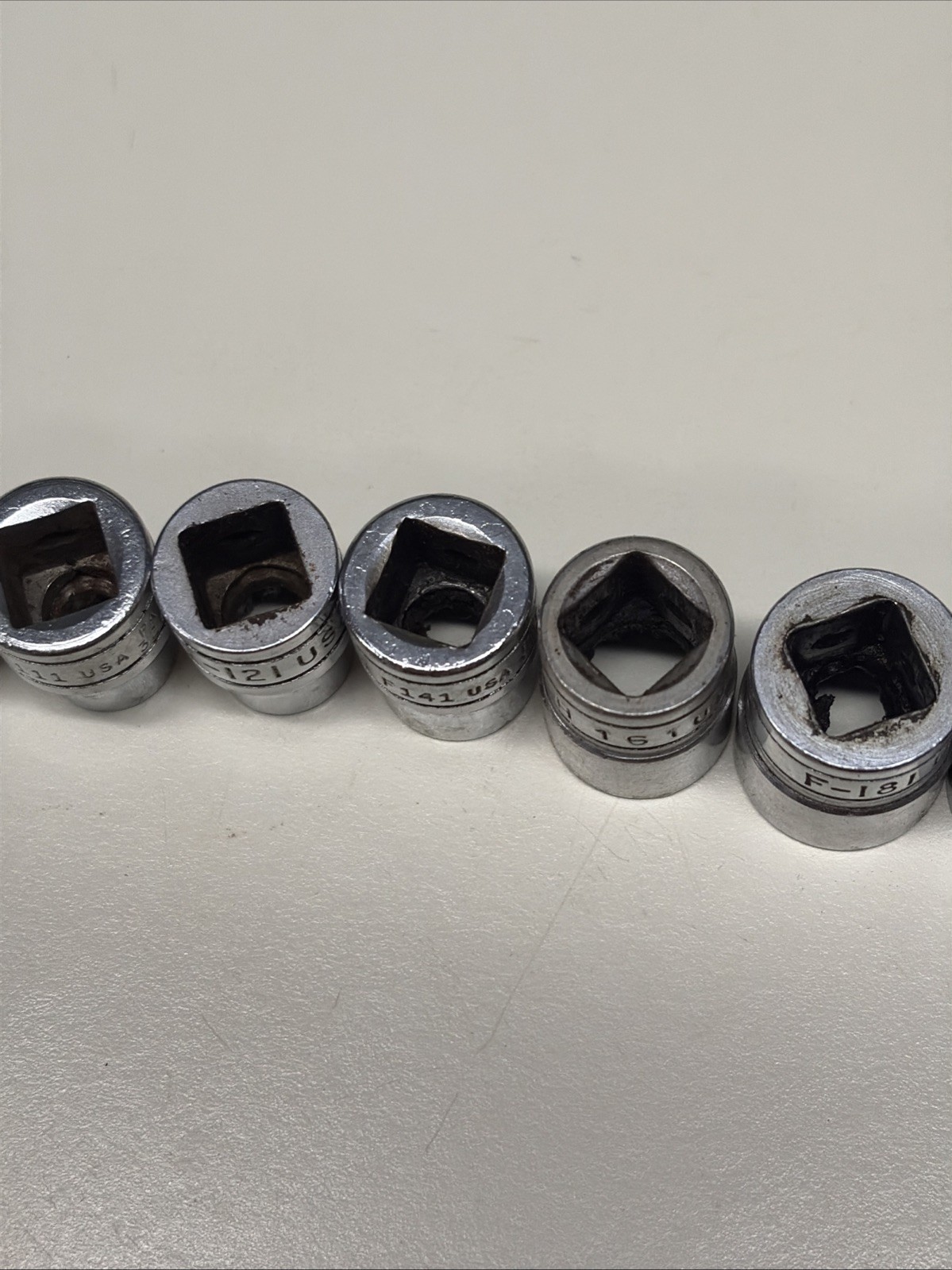 Some of these have slightly different fonts appearing to be from different original sets, but all are the same âFâ series 3/8â drive 12 point sockets.