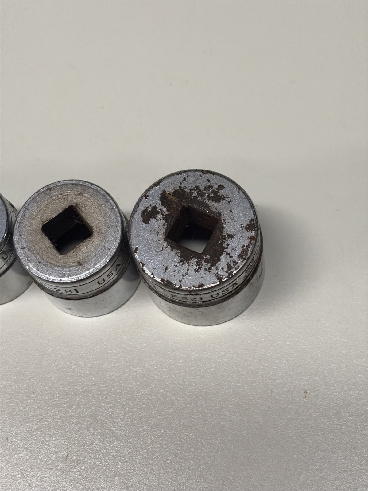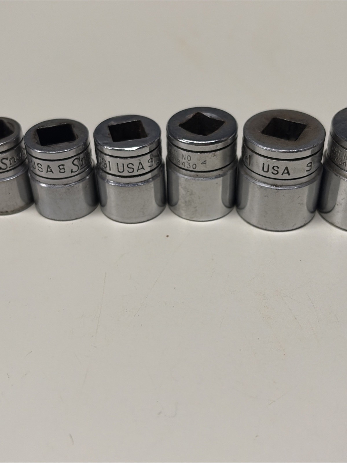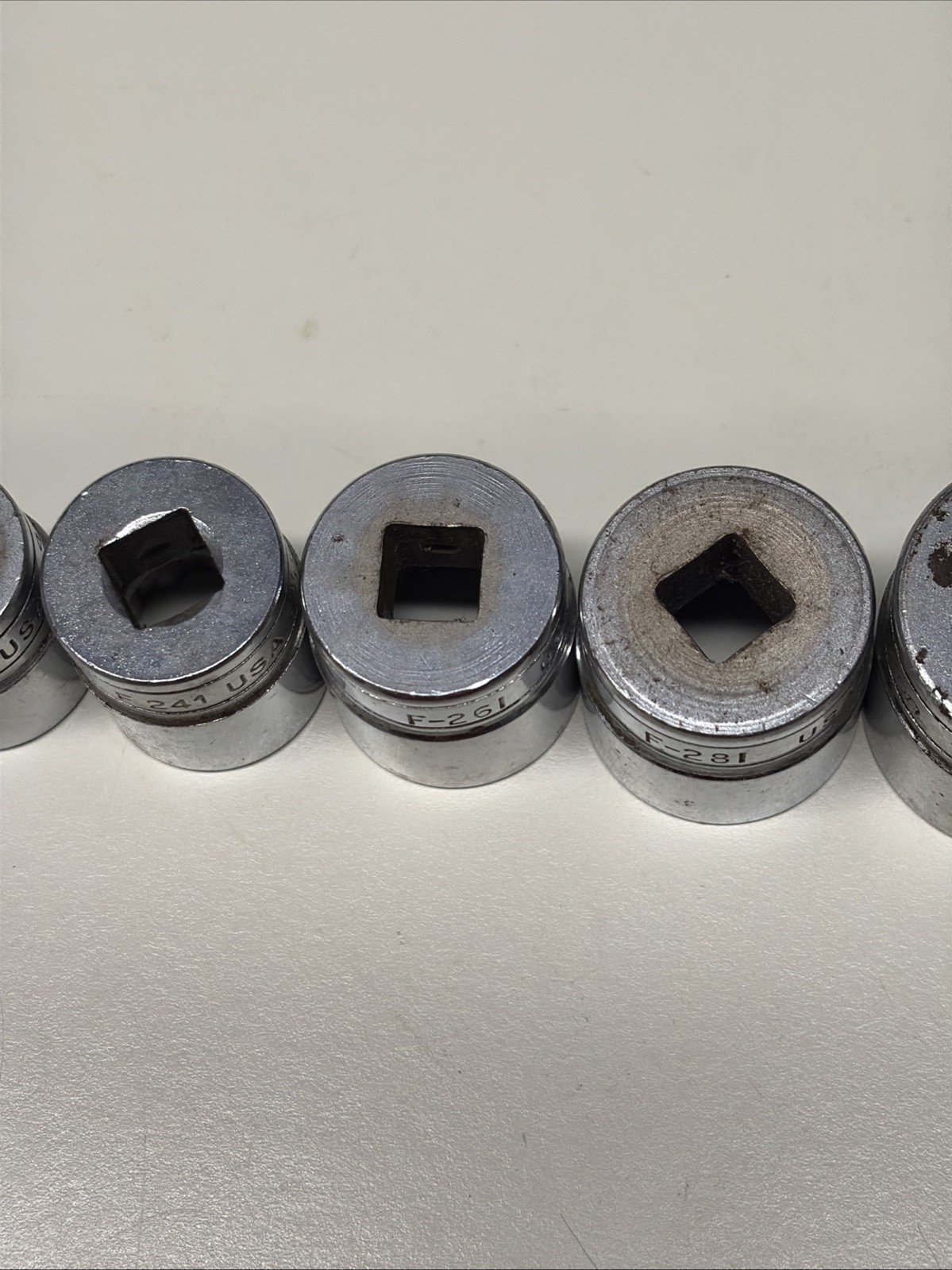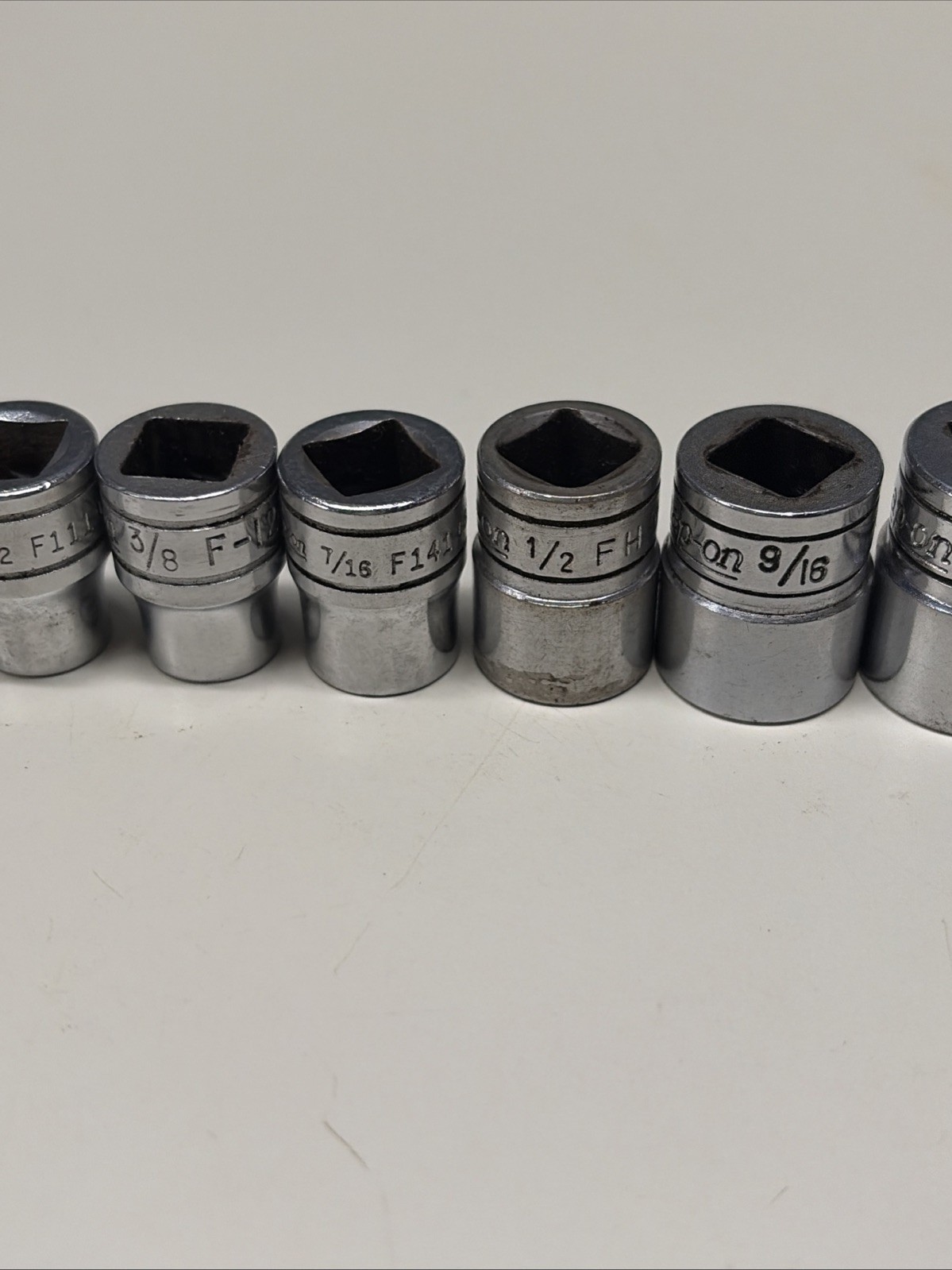 Some of these have slightly different fonts appearing to be from different original sets, but all are the same âFâ series 3/8â drive 12 point sockets.