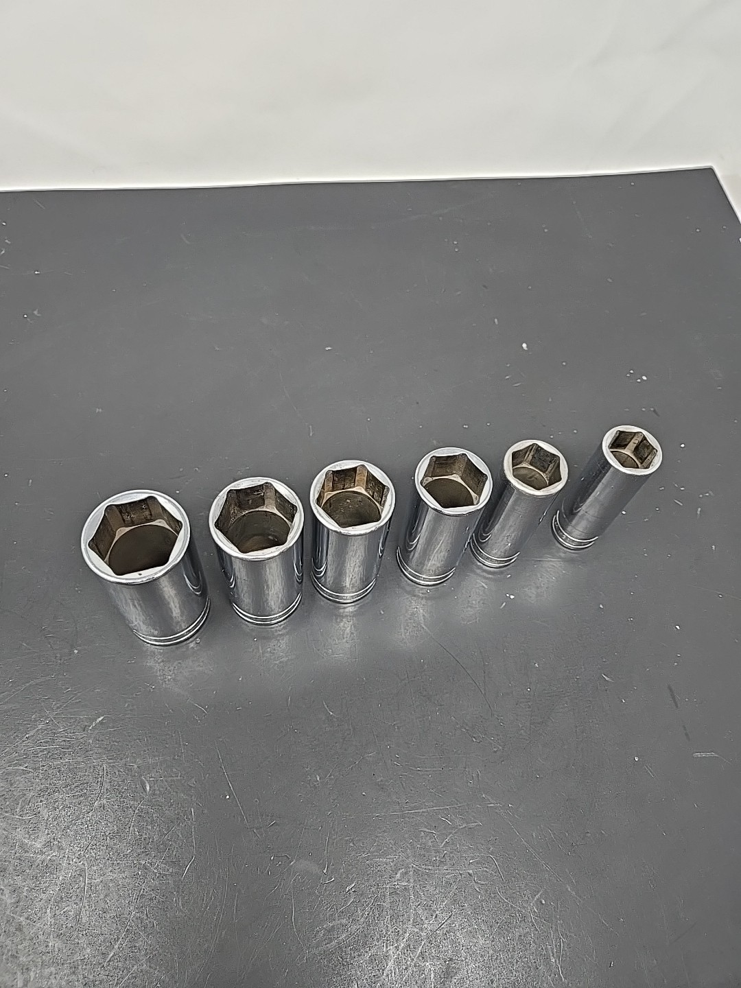 Up for are six Snap On 1/2" drive six point deep (3") sockets. In good pre-owned condition. Includes TS381 -1 3/16", TS361- 1 1/8", TS341 - 1 1/16", TS321- 1", TS261-13/16" & TS241 - 3/4". Selling obo with free shipping!