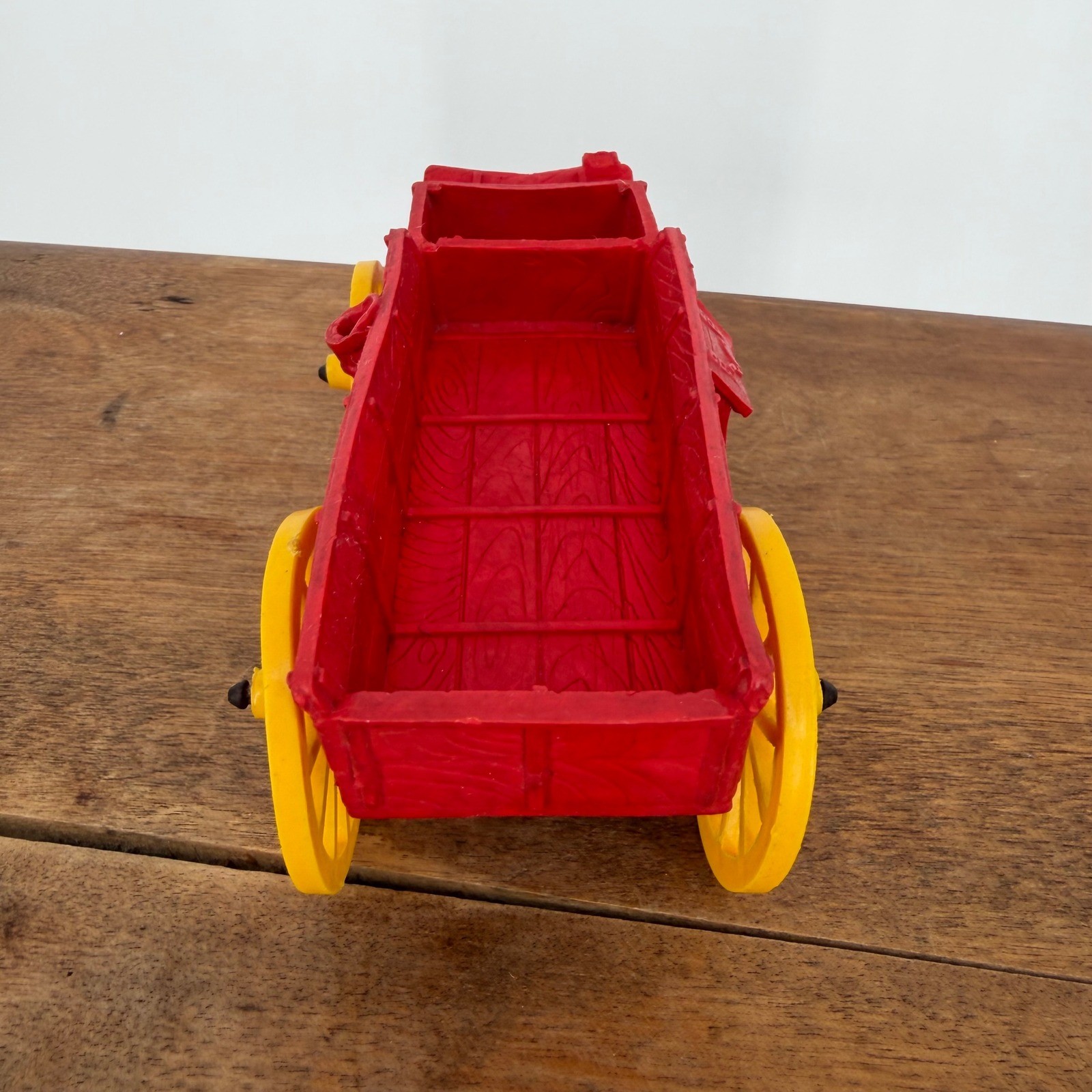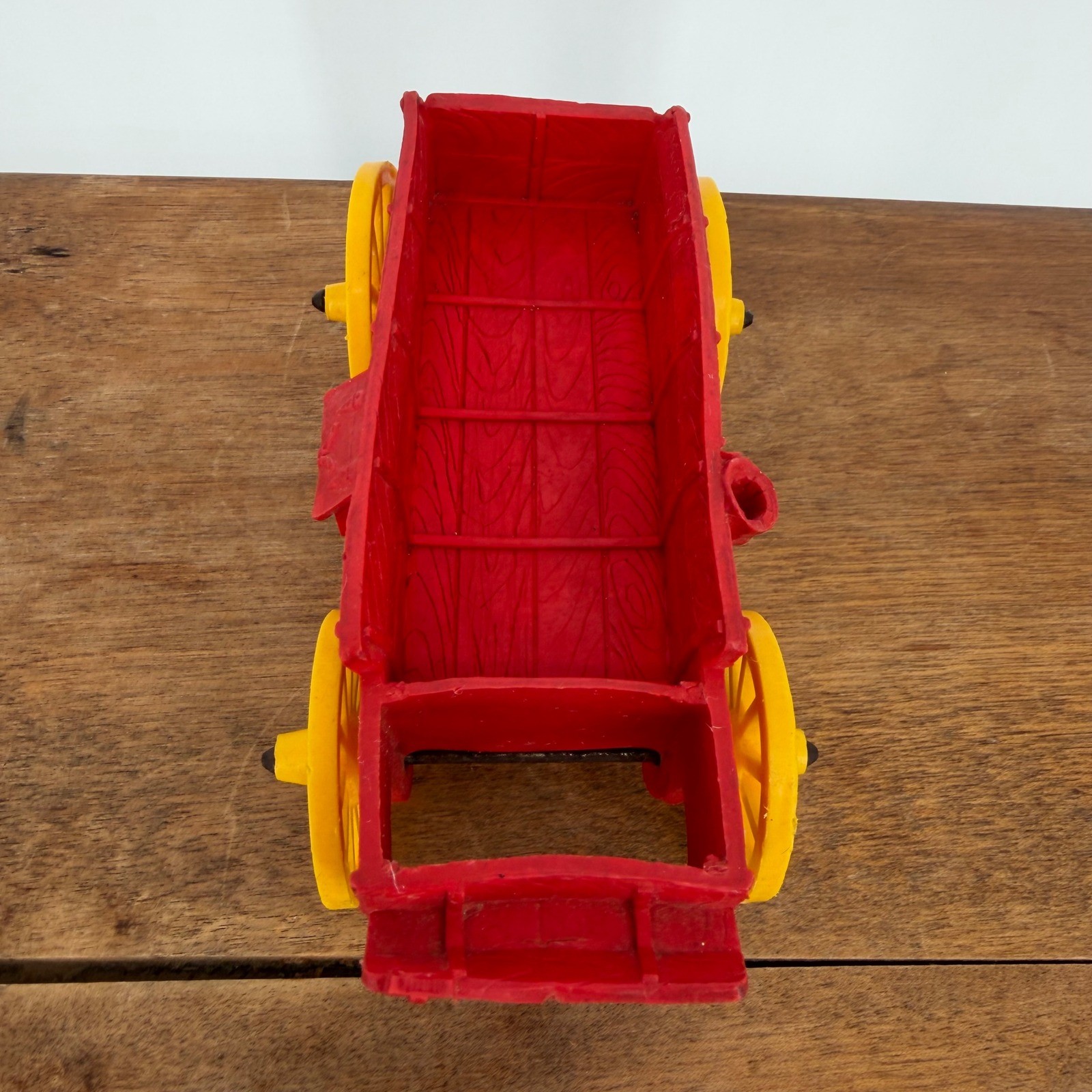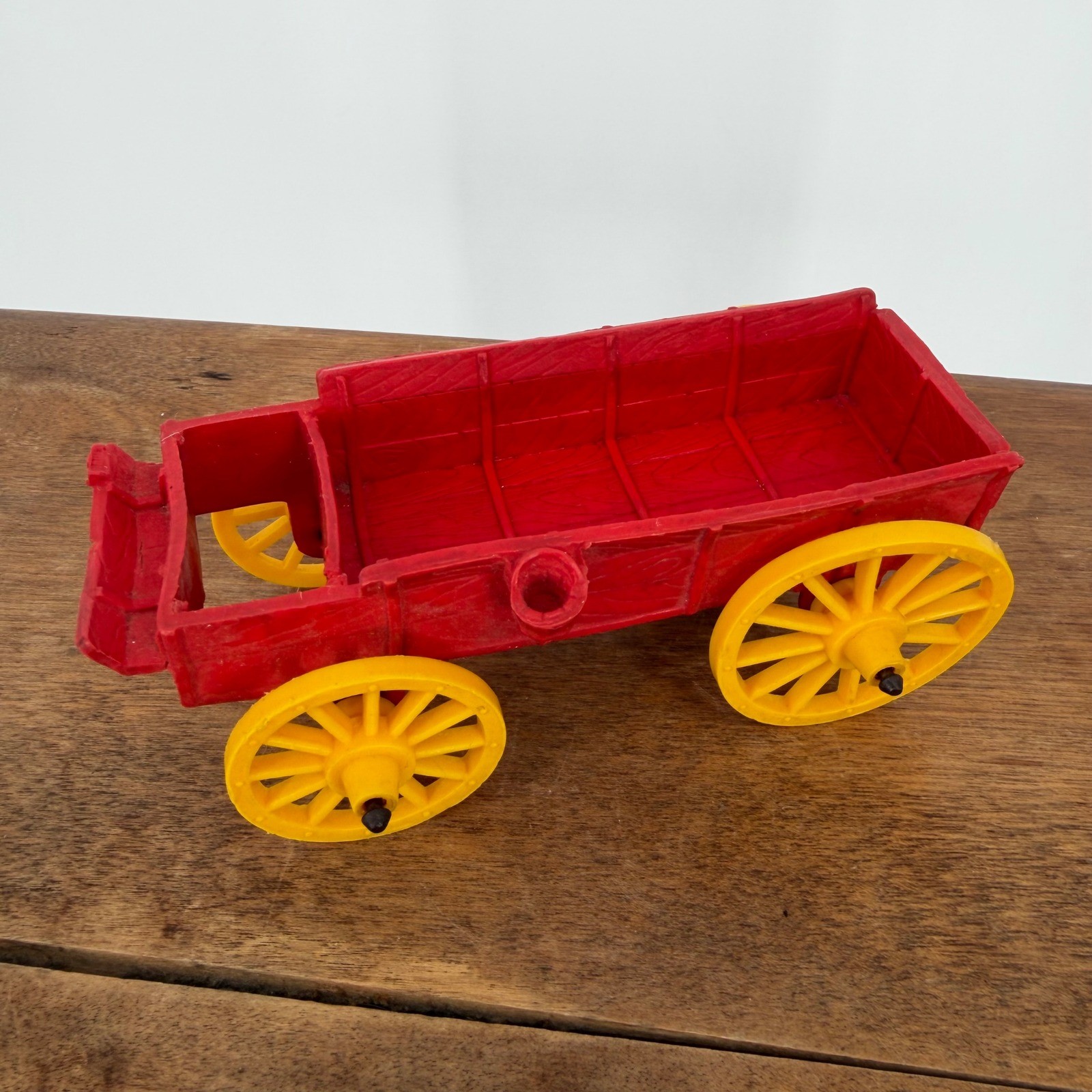 Item: Vintage Auburn Rubber Co. Western Buckboard Farm Wagon Era: 1940s – 1950s Origin: Made in Auburn, Indiana, USA Details: Up for sale is a classic piece of mid-century Americana—a Vintage Auburn Rubber Company Western Wagon. This toy features a vibrant red buckboard-style body paired with iconic yellow spoke wheels. Known for their durability, Auburn Rubber toys were a staple of childhood in the post-WWII era. This wagon was originally part of a larger Western or Farm playset and is a must-have for collectors of vintage rubber toys or toy enthusiasts specializing in the Auburn line. Specifications: Dimensions: Approximately 5.5" long x 2.25" wide. Material: Flexible rubber body, yellow vinyl/plastic wheels, and original metal axles. Condition: Wheels spin freely. Original paint is bright with minimal play wear."]
