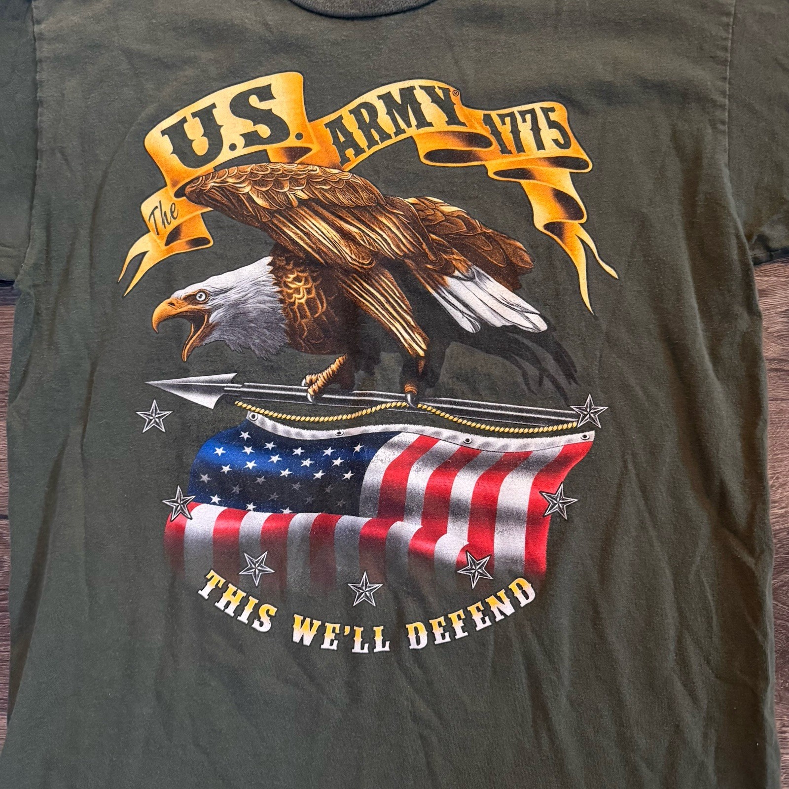 U.S. Army 1775 T-Shirt Made in USA Eagle Flag Mens Medium Green VTG Y2K Olive