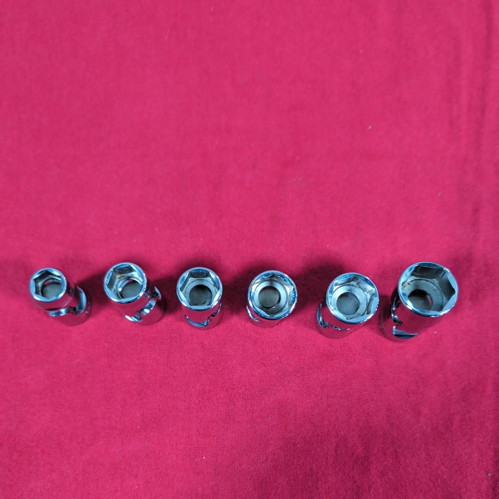 The #bm606 Snap-On 206FSUMA 6 pc 3/8" Drive 6-Point Metric Shallow Flex Socket set is a high-quality set of hand tools designed for automotive use. With a drive size of 3/8 inches and a chrome surface finish, these sockets are durable and built to last. The set includes six pieces ranging in size from 10mm to 17mm, all with a universal/swivel socket type for easy maneuverability. Made in the United States by Snap-on, a reputable brand in the industry, this socket set is a reliable and essential addition to any mechanic's toolkit.