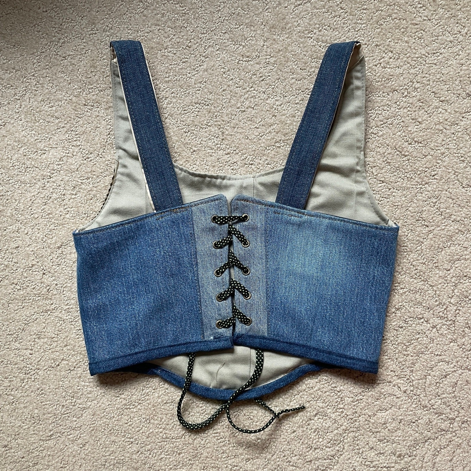 Pre-owned. May show signs of wear. Handmade upcycled piece. Unique piece made in our atelier from upcycled materials, using artisanal processes. Lined and structured, it features an eyelet and ribbon closure and a 100% cotton inner lining.