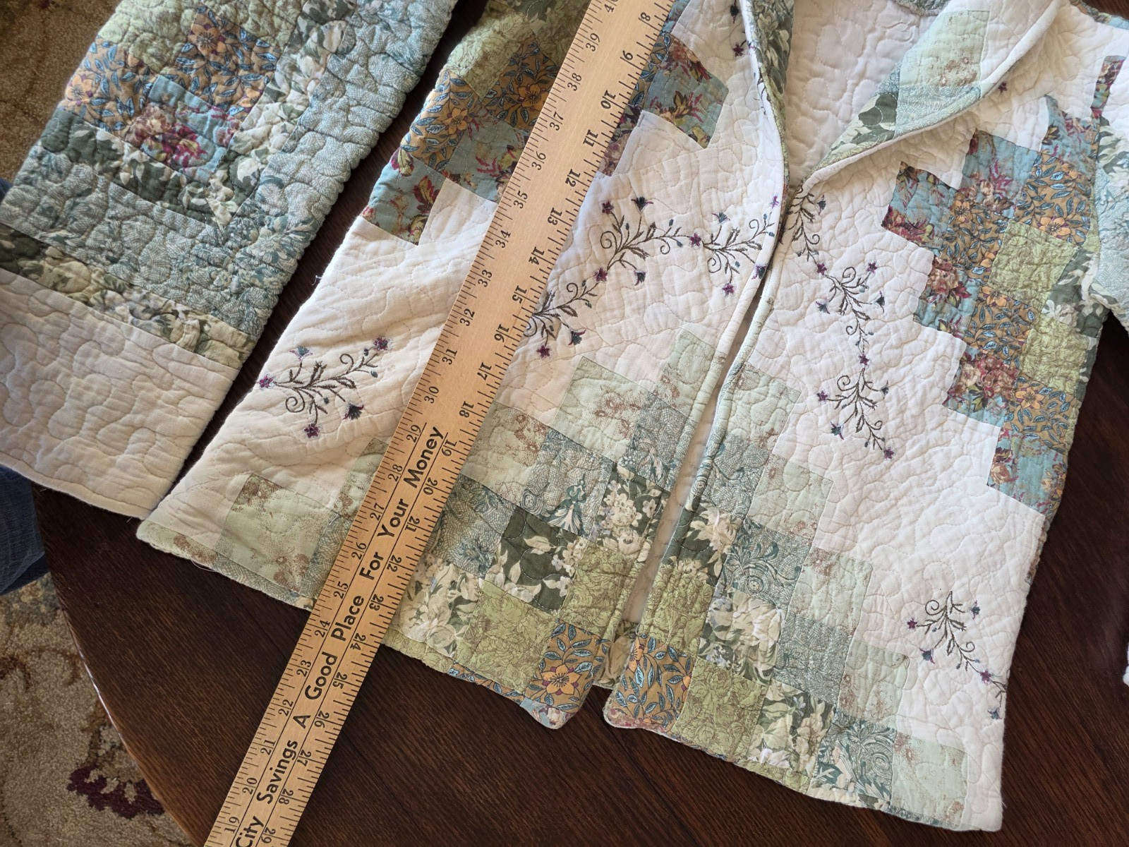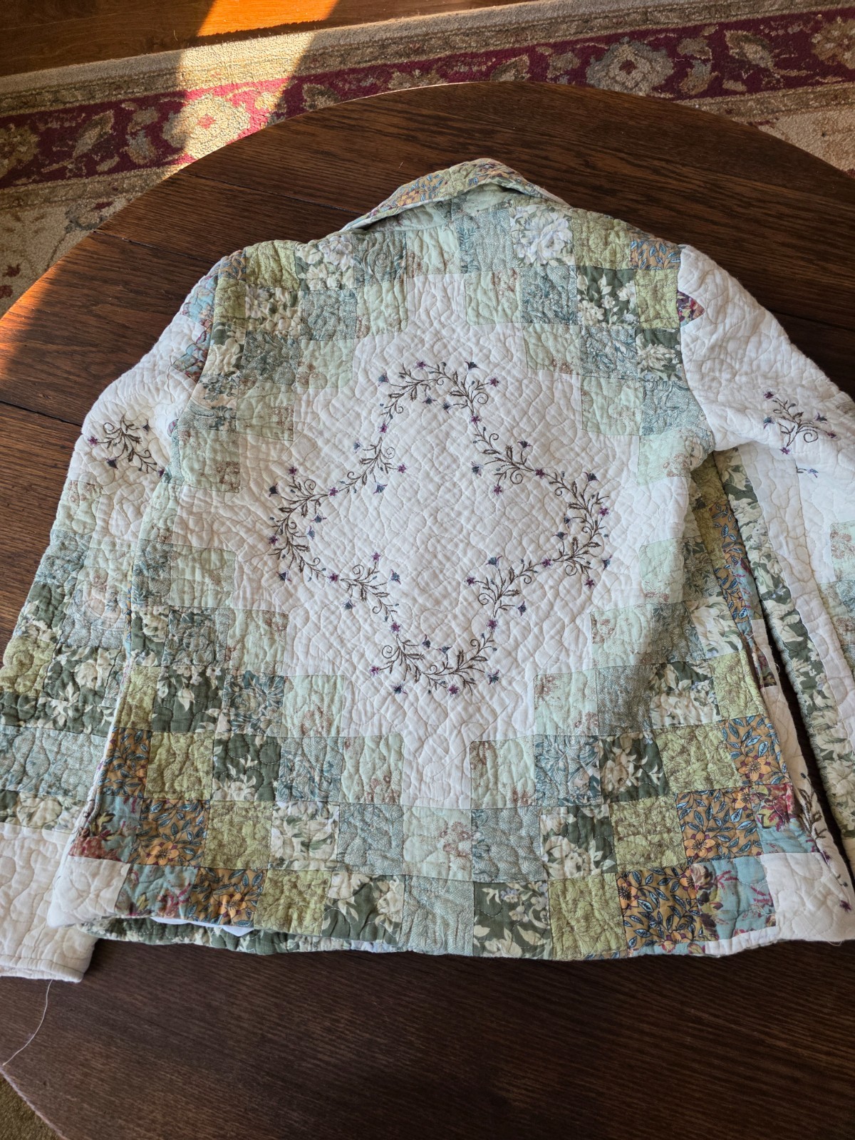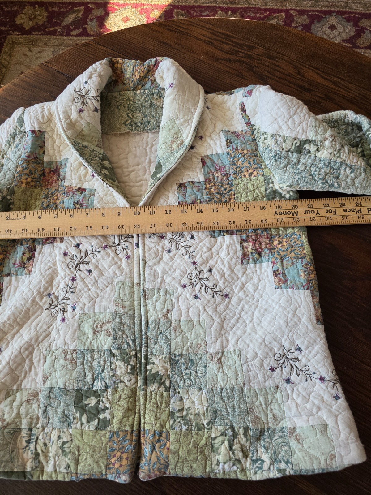 Handmade Upcycled Quilt Jacket Floral Cream Size 12. Crafted from a vintage quilt. Pockets in side seams. One-of-a-kind handmade upcycled quilt jacket , Soft, cozy, and lightly padded with beautiful floral patchwork throughout. Features a relaxed open-front style, designed for easy layering and everyday comfort. Piece that works year-round and adds texture and charm to any outfit. Fabric content is 100 percent cotton. Photos shows measurements. Have one listed in size 10 and size 12. Check them out. Washable