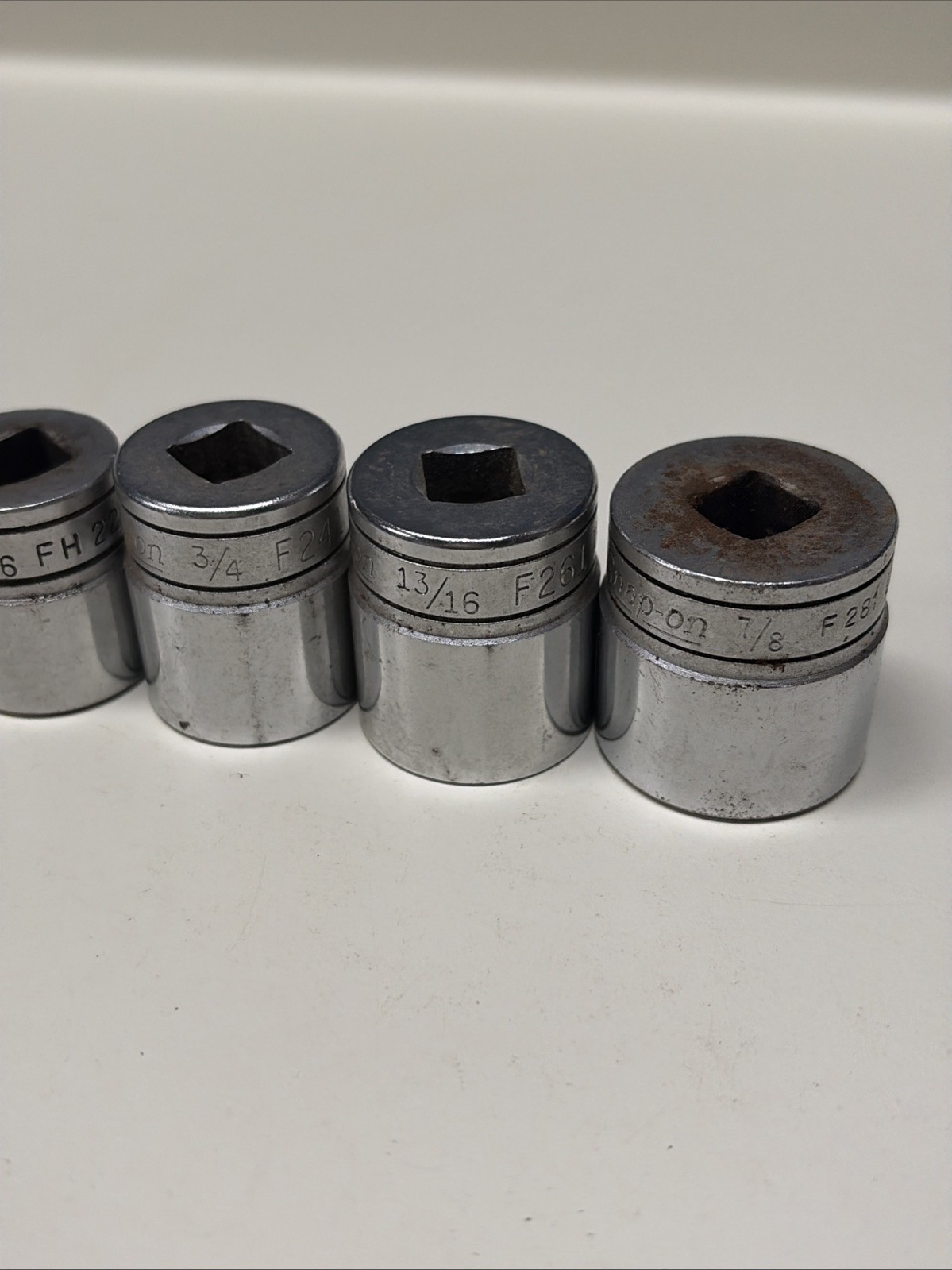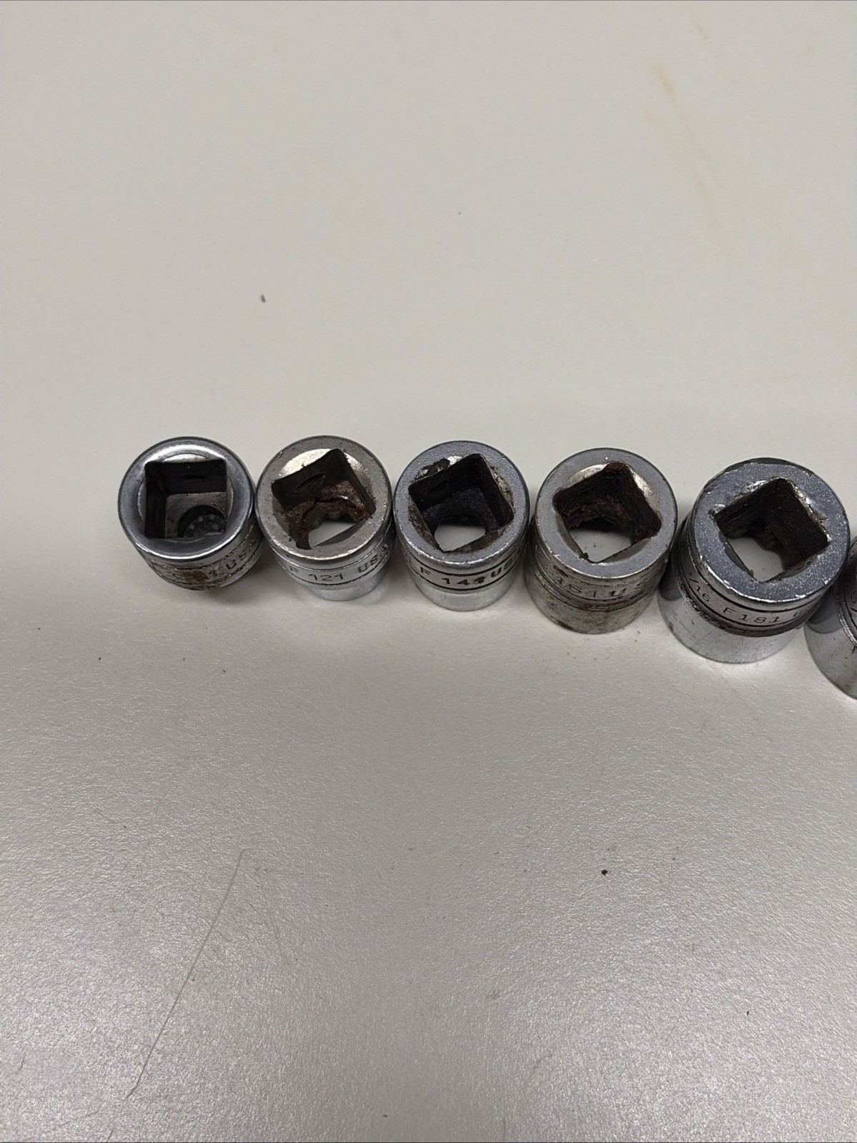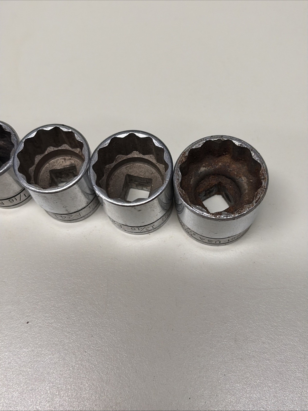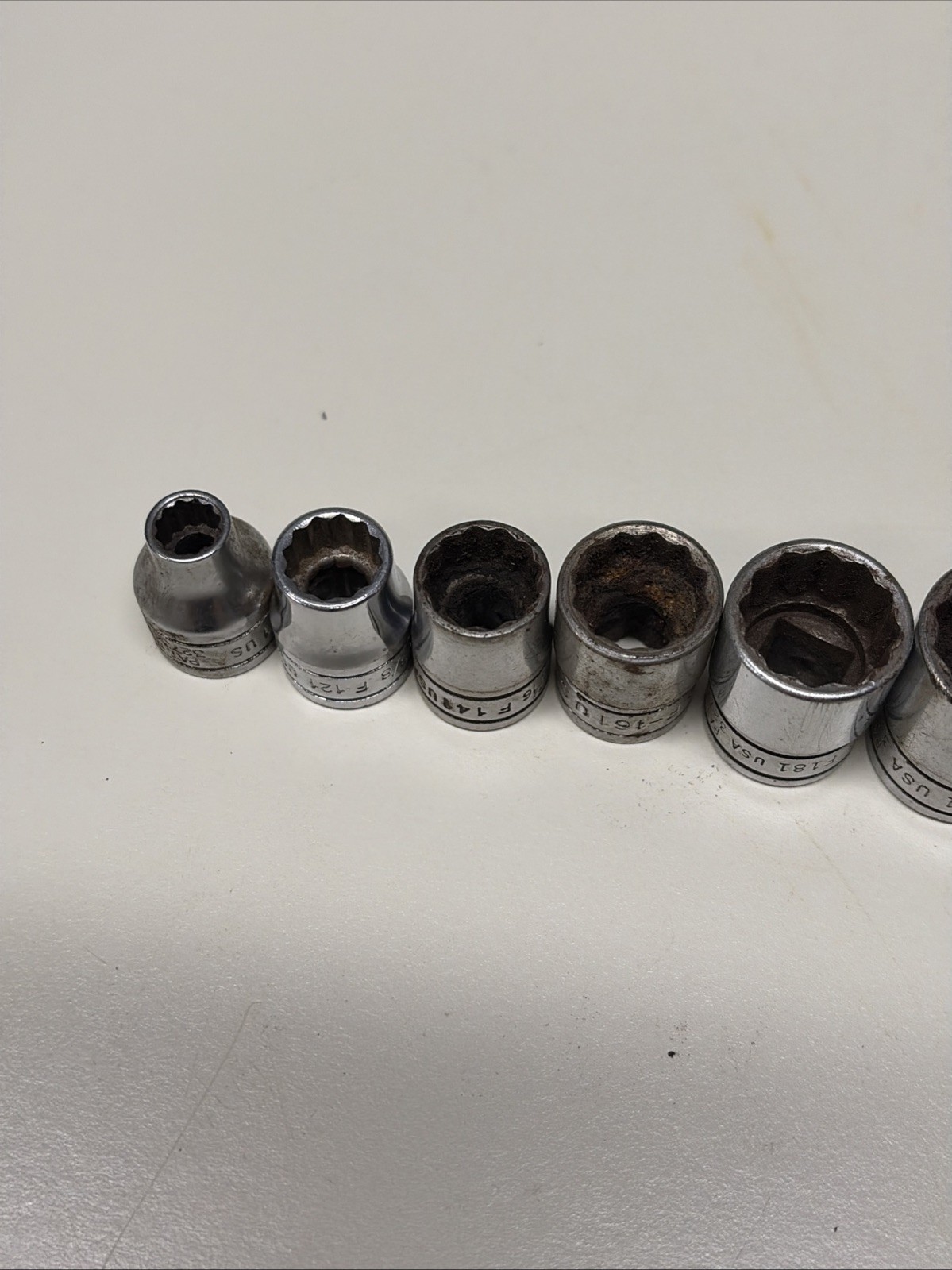 Some of these have slightly different fonts appearing to be from different original sets, but all are the same âFâ series 3/8â drive 12 point sockets.