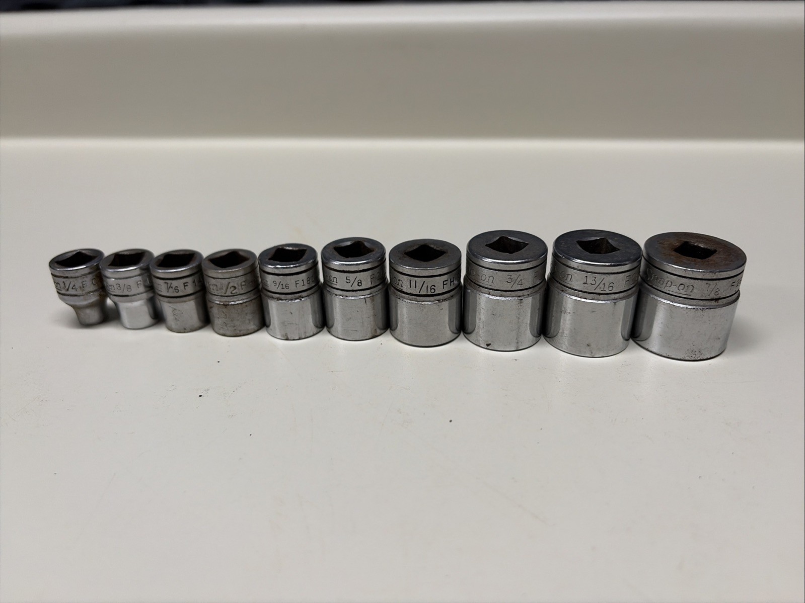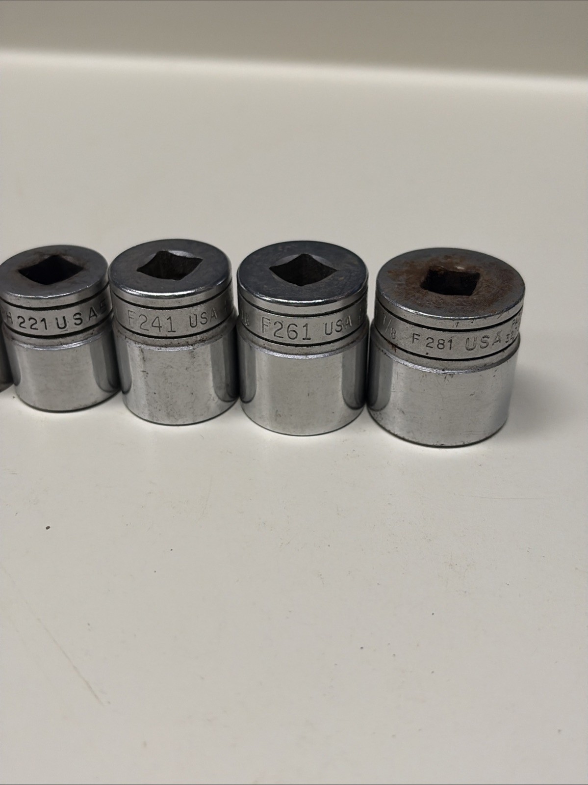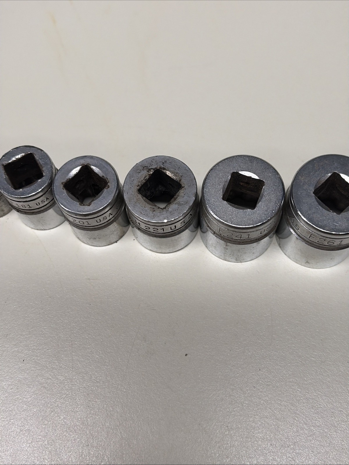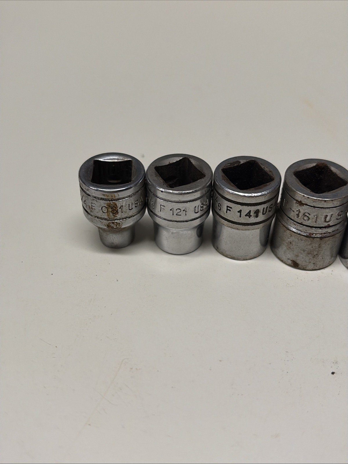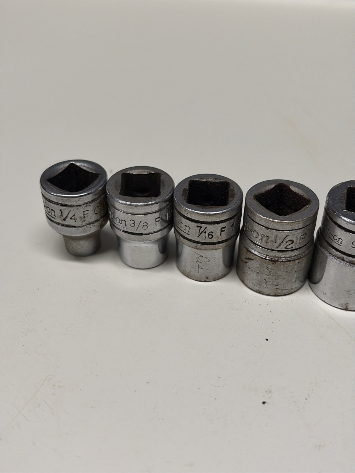 Some of these have slightly different fonts appearing to be from different original sets, but all are the same âFâ series 3/8â drive 12 point sockets.