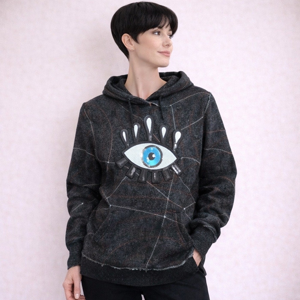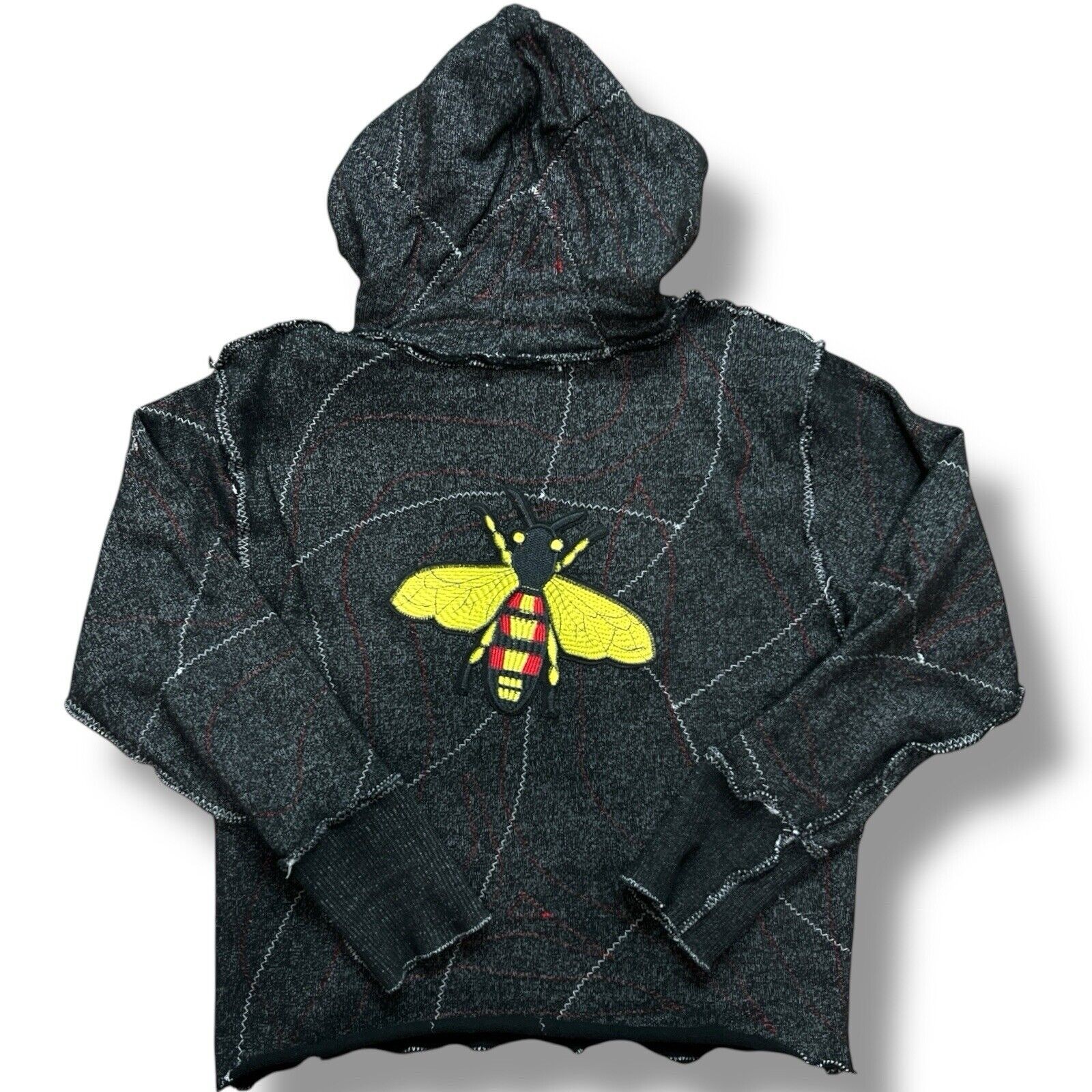 OOAK Upcycled Reworked Black Sequin Patch Eye Bee Franken Hoodie Sweatshirt S/M