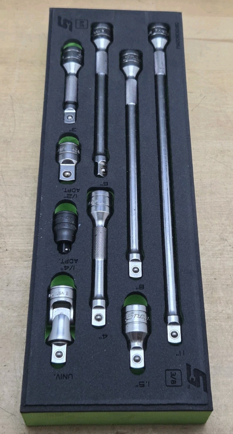 New Snap On 209AFXAFR - 3/8" Drive 9 Pc Extension & Adapter Set With Foam Tray. Purchased but never used. No owner markings. Fast shipping. Thanks for looking. Please check out my other top quality professional mechanic tools in my store.