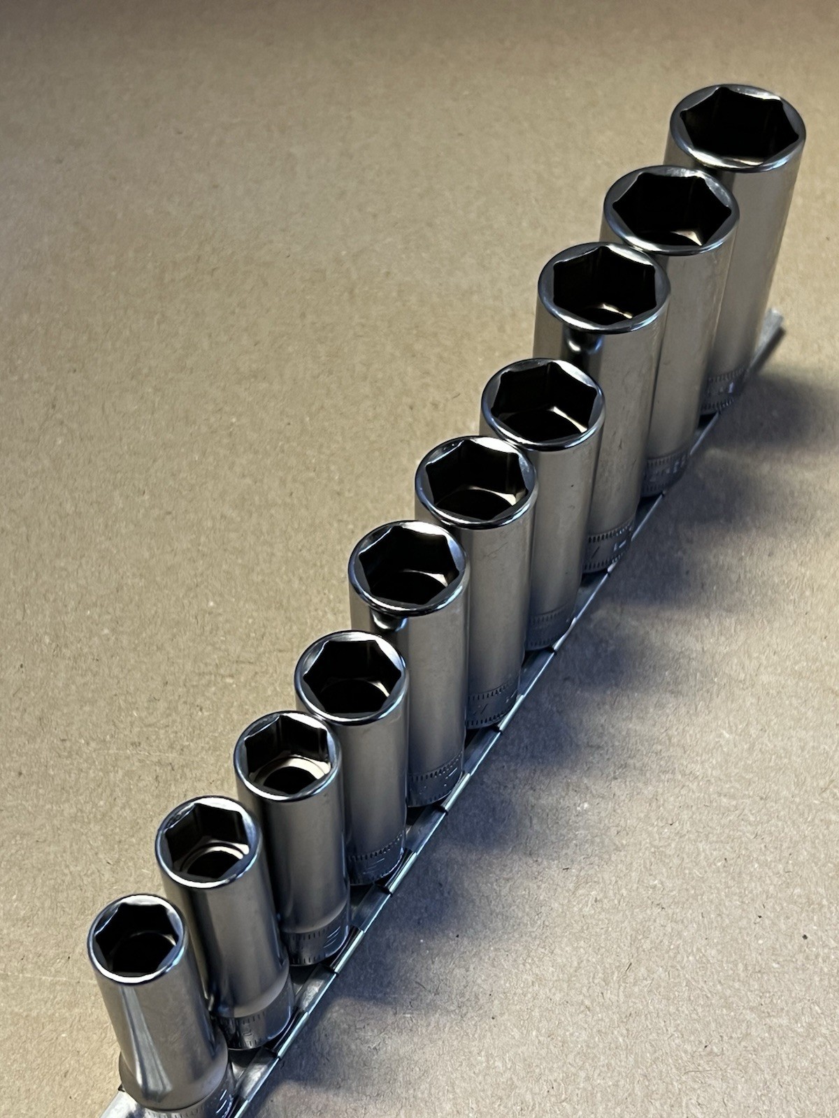 CAT/ Snap-On USA 3/8” Drive Deep Chrome Metric 10 Piece 6 Point 10-19mm Sockets