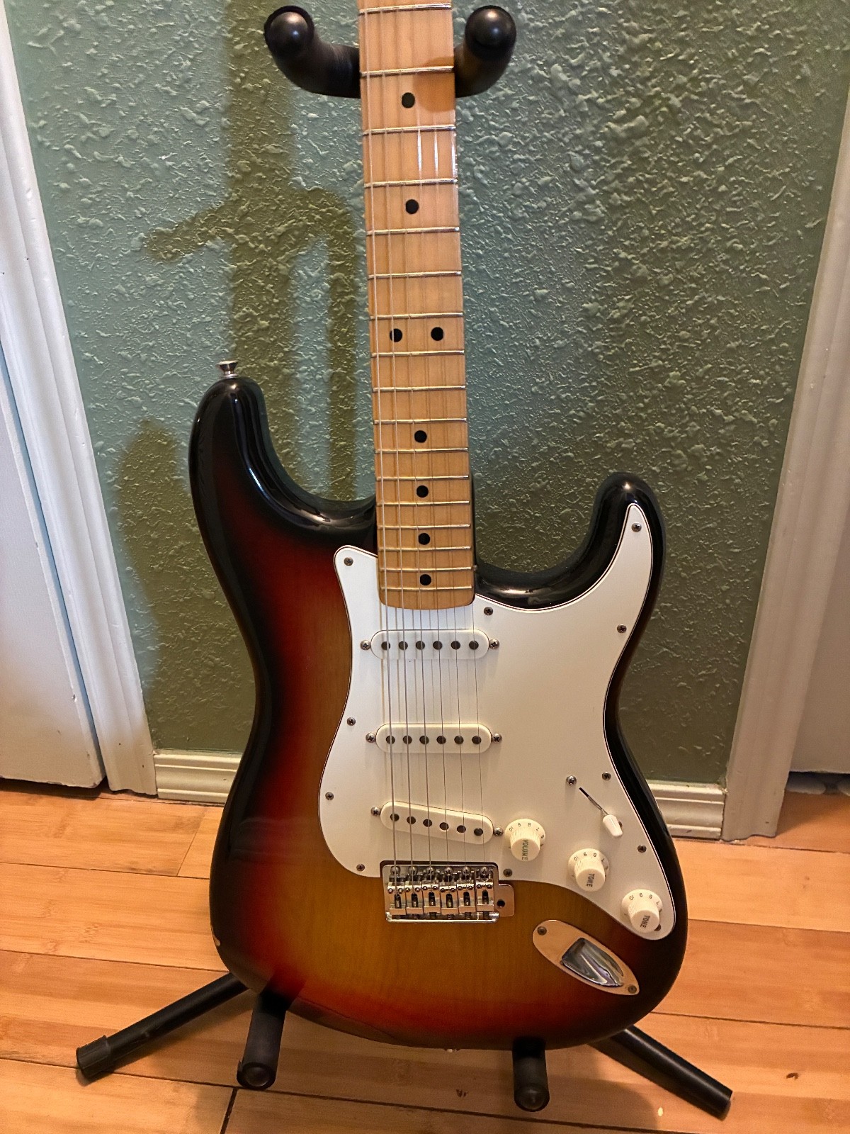 1975 strat in very good condition. All original, maple neck, sunburst body with one paint chip noticeable, minor wear - see photos. negligible fret wear, straight neck and doesn't shift from side to side as some do. all in all a wonderful specimen of an American original.
