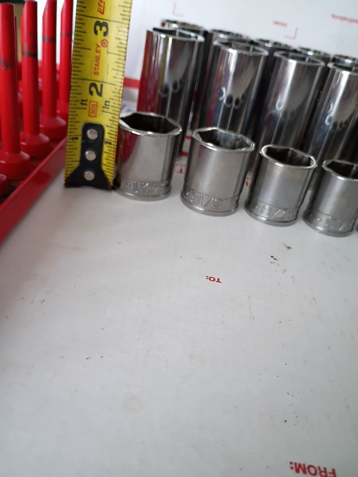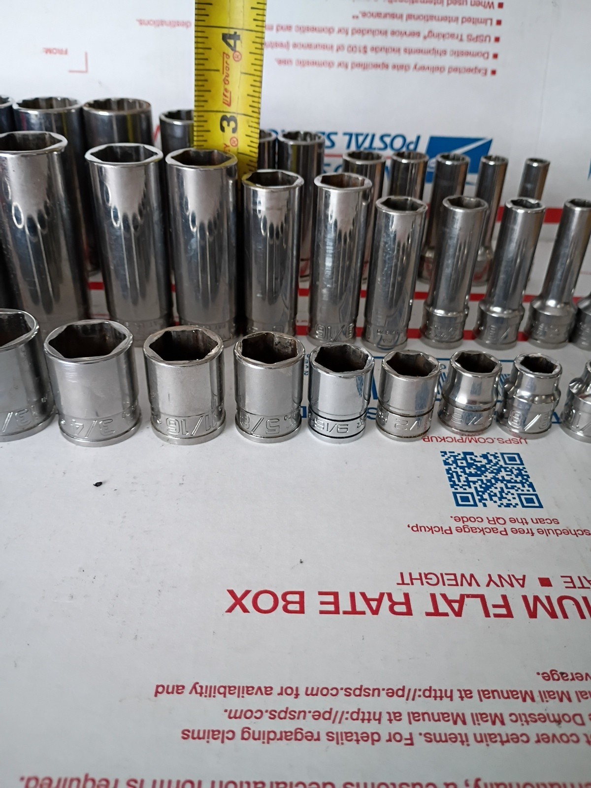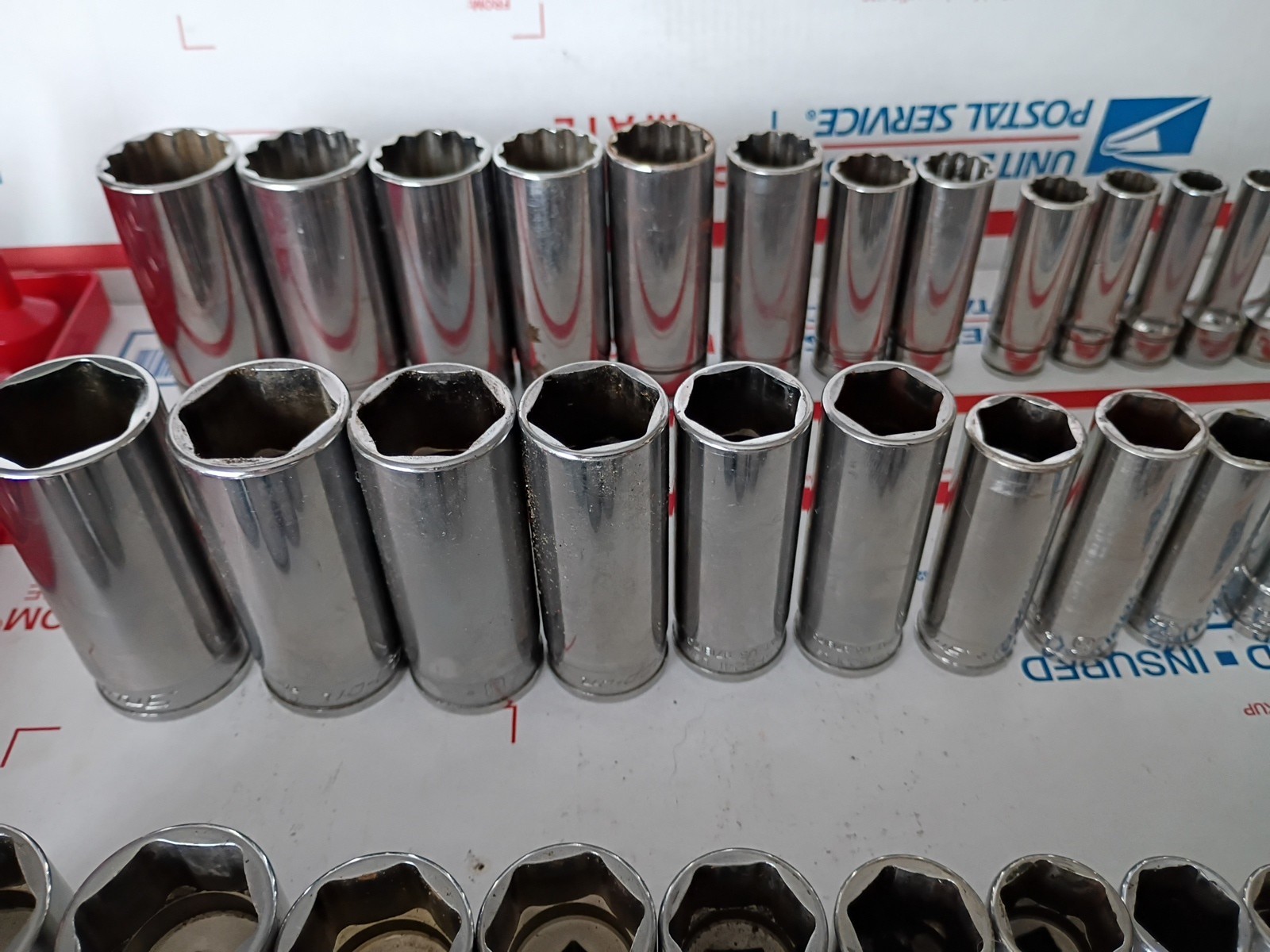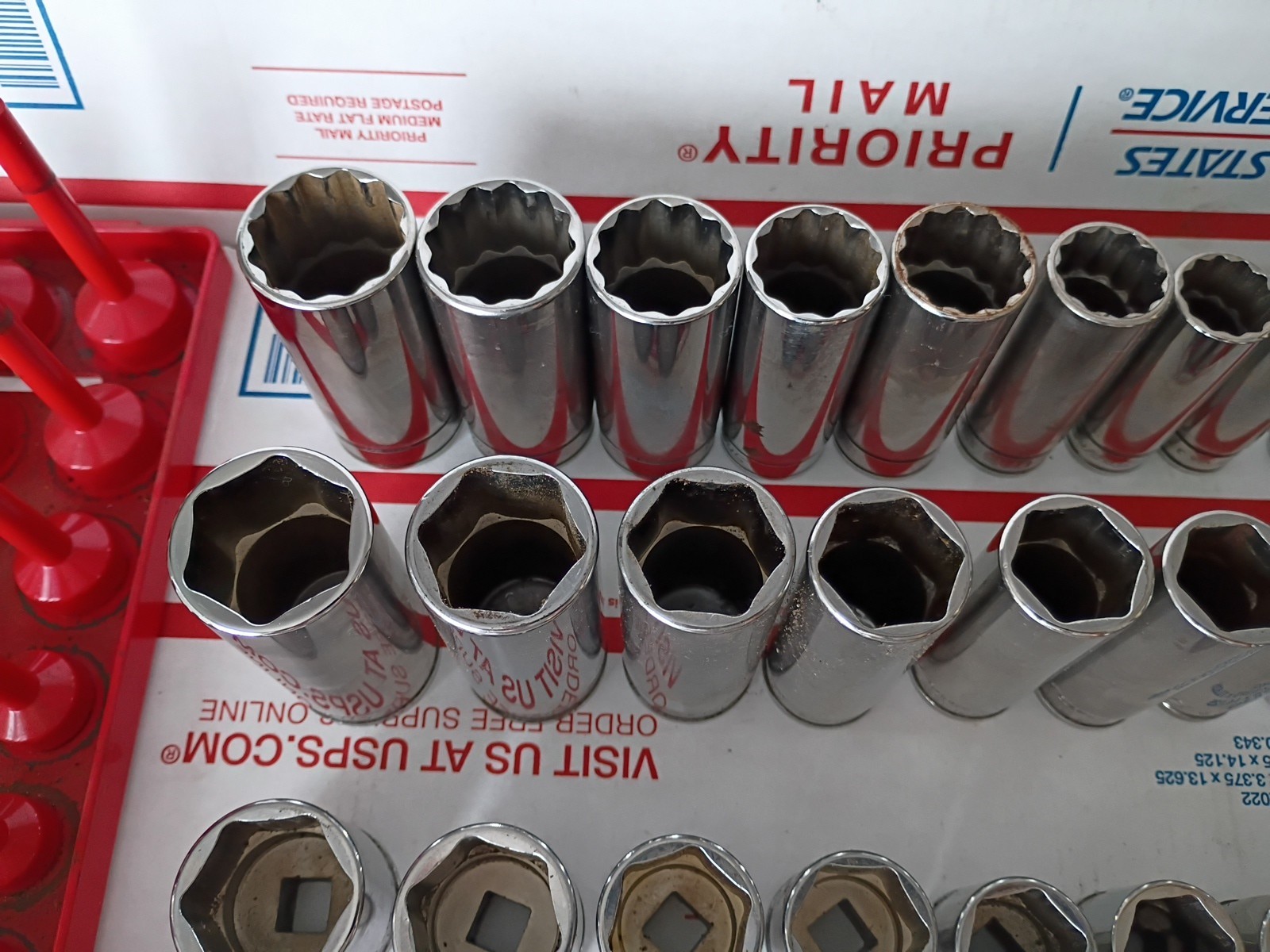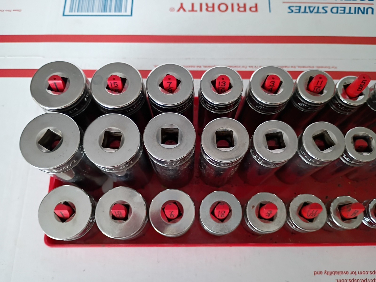 Very good lightly used working condition,all matching sets other than 1 or two that I added all snap on 1 deep well 12 point set,1 deep well 6 point set and 1 shallow 6 point set sizes are 1,,15/16,,7/8,,13/16,,3/4,,11/16,,5/8,,9/16,,1/2,,7/16,,3/8,,5/16,,1/4 what you see is what you get,I'm shipping 2 boxes one with sockets and other with holder